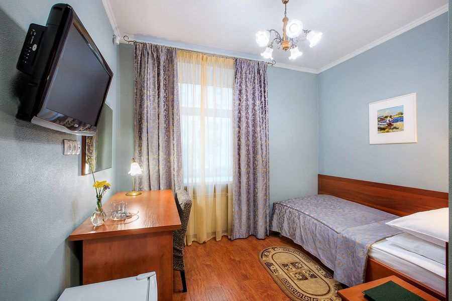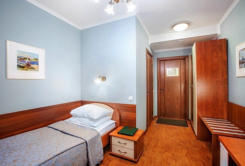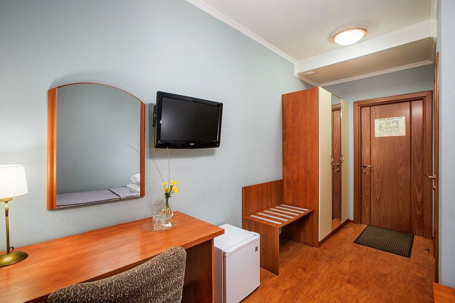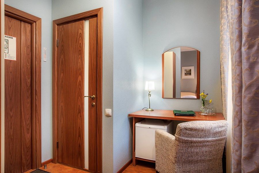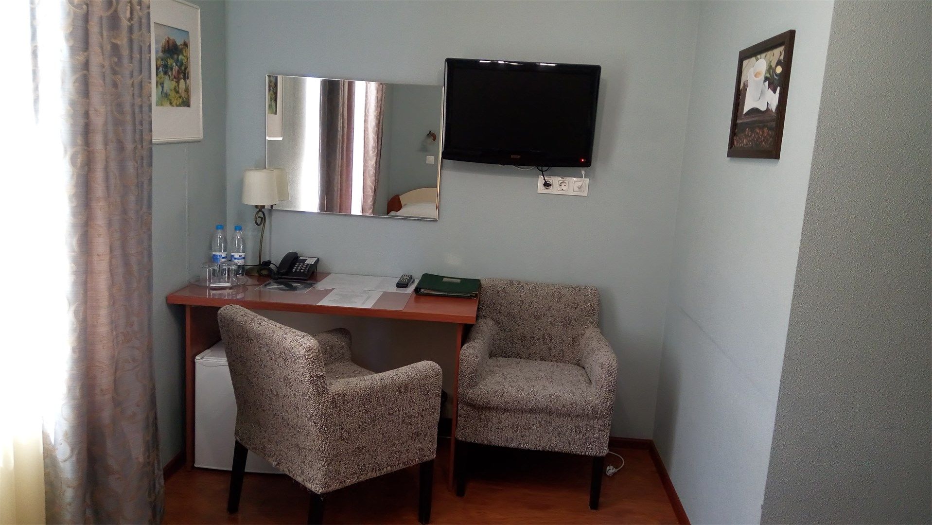 В номере: вешалка, зеркало, кресла, кровать односпальная, прикроватная тумбочка, стол, стул, шкаф, телевизор, холодильник