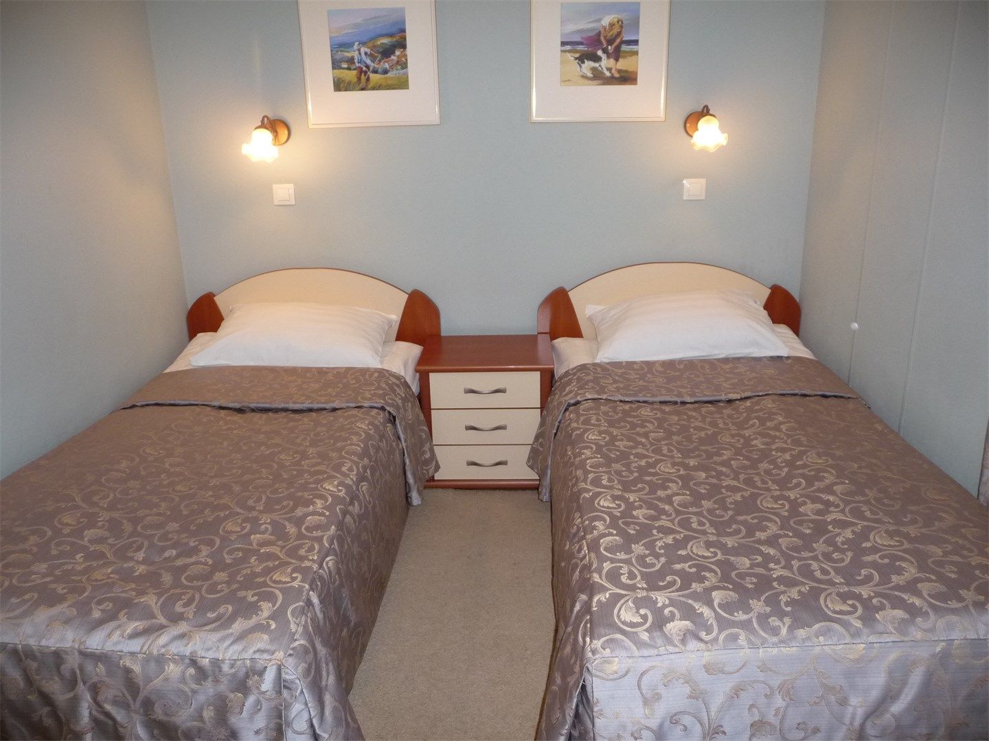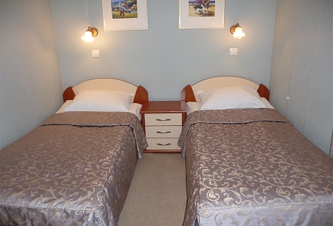 В номере: вешалка, зеркало, кресла, кровати односпальные, прикроватные тумбочки, стол, стулья, шкаф, телевизор, холодильник