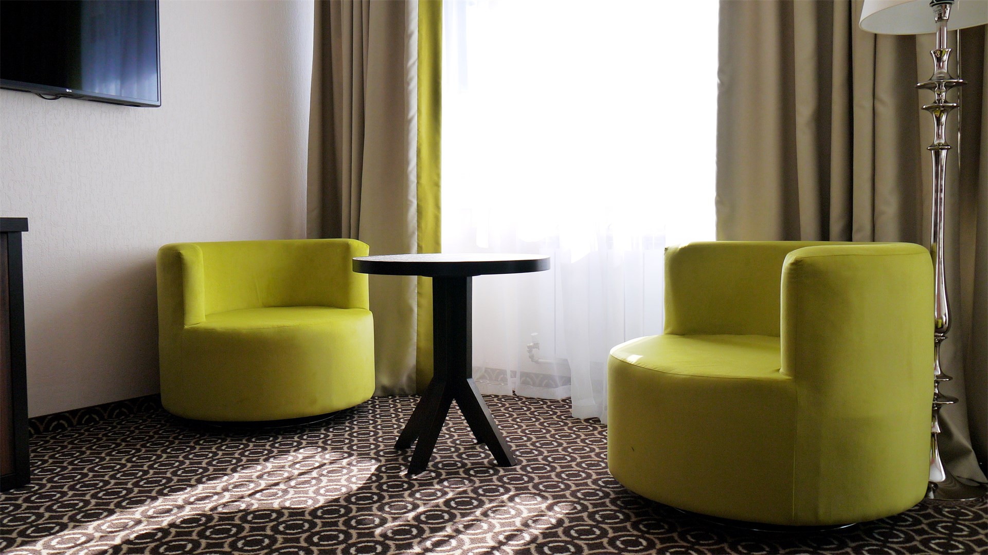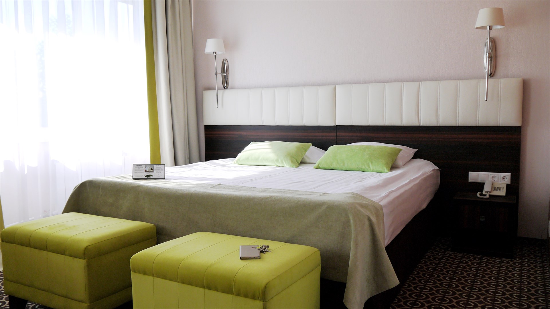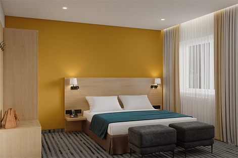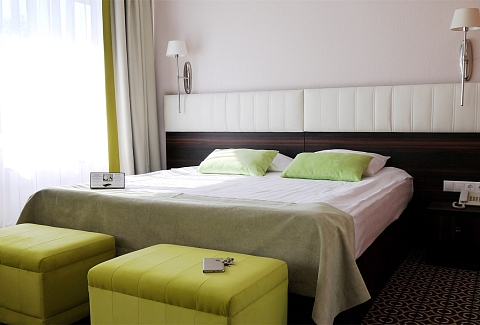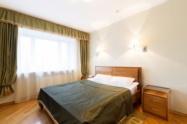 В номере: кровать двуспальная, прикроватные тумбочки, стол, стулья, шкаф, кондиционер, мини-холодильник, сейф, телевизор, телефон, чайник