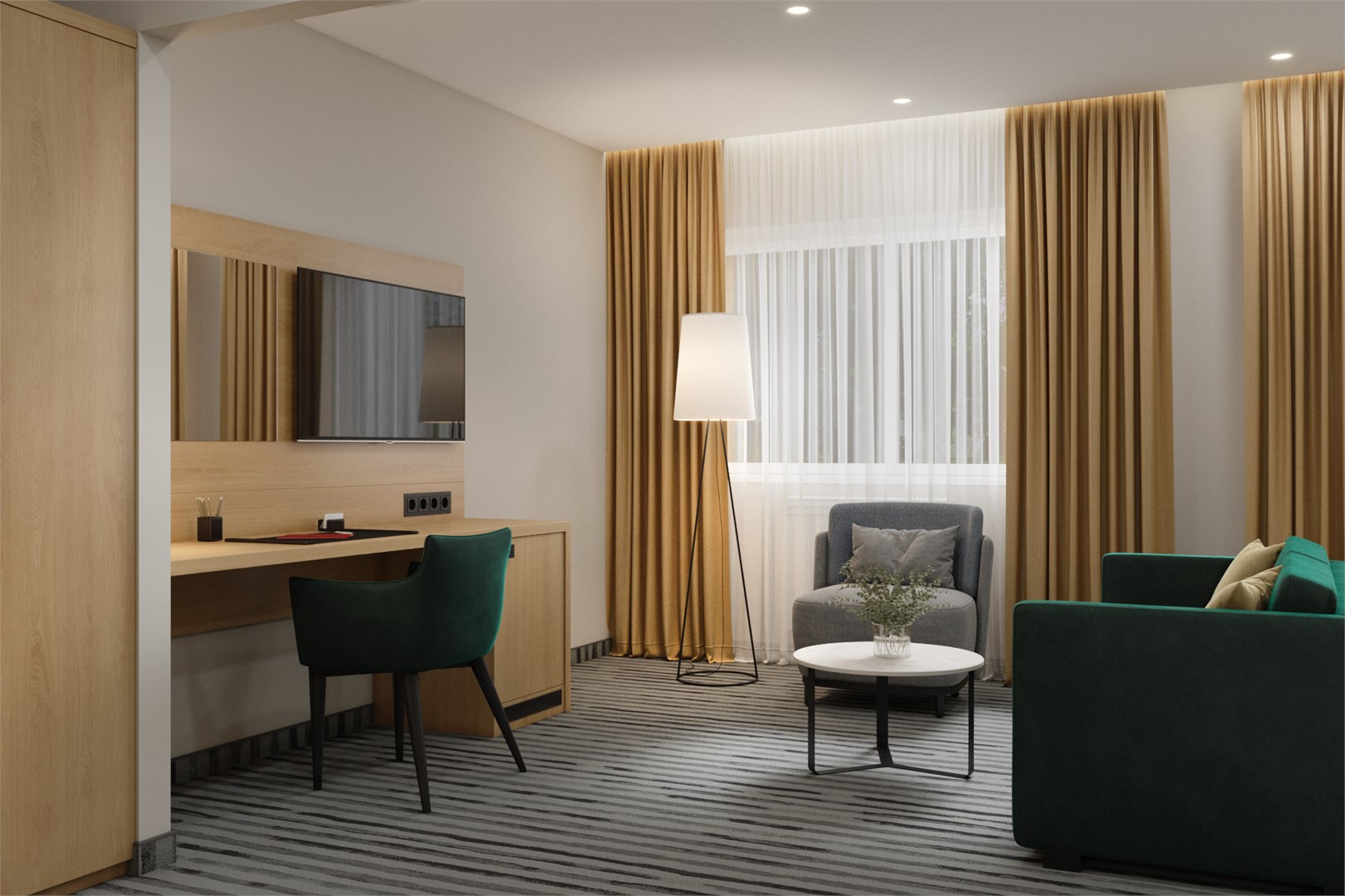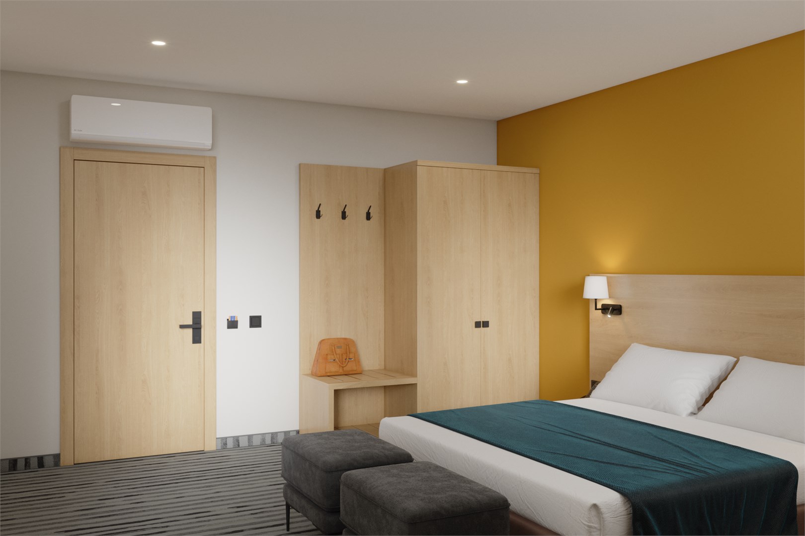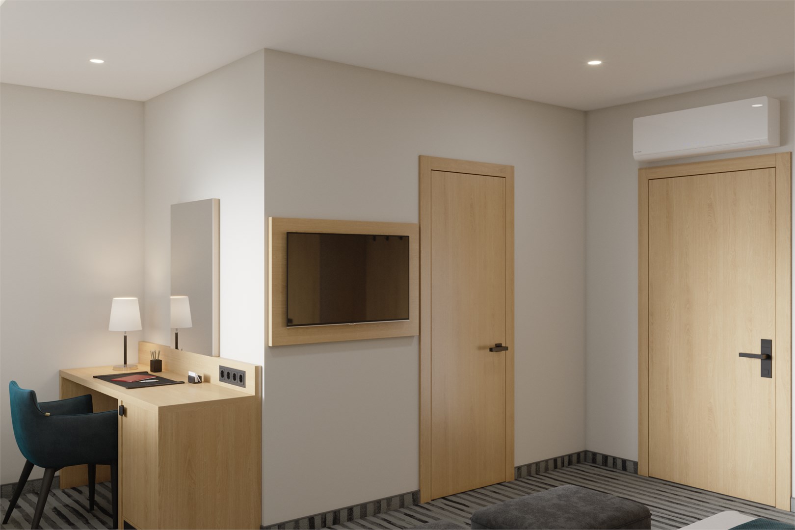В номере: кровать двуспальная, прикроватные тумбочки, стол, стулья, шкаф, кондиционер, мини-холодильник, сейф, телевизор, телефон, чайник