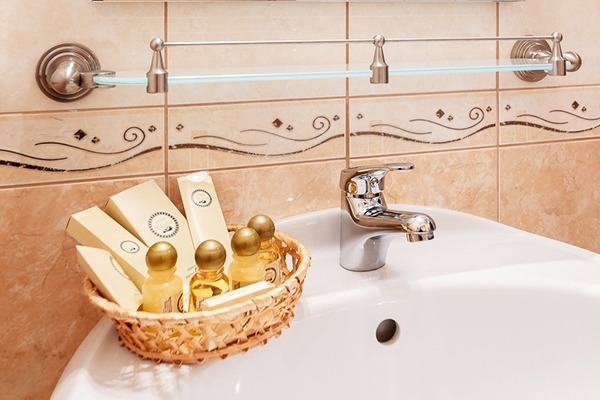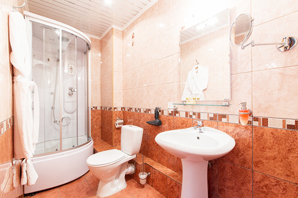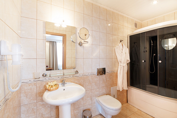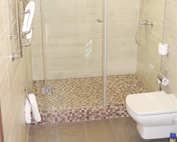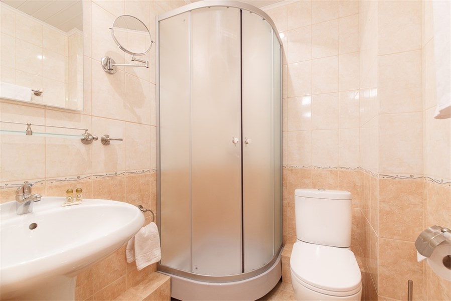 Санузел: с душевой кабиной, тапочки, туалетные принадлежности, фен