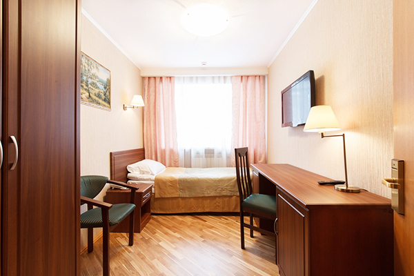 В номере: вешалка, зеркало, кровать односпальная, прикроватная тумбочка, стол, стул, шкаф, телевизор, телефон, холодильник