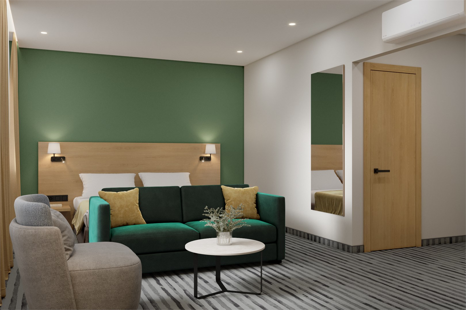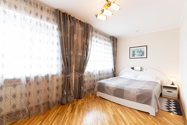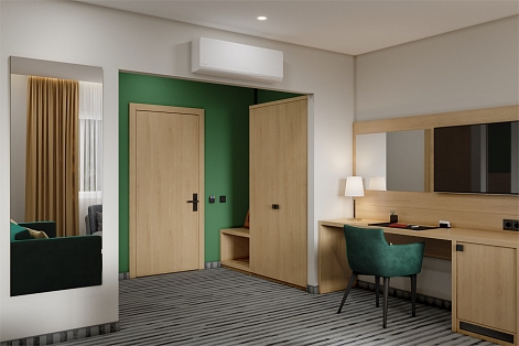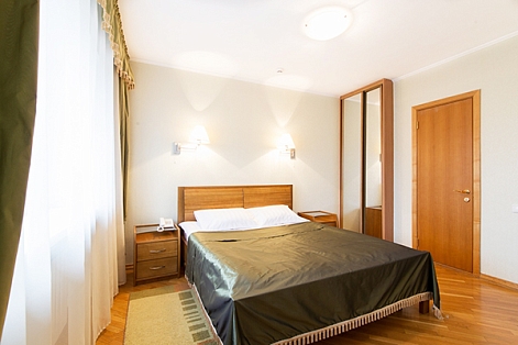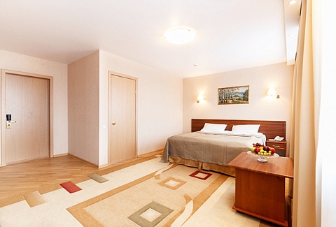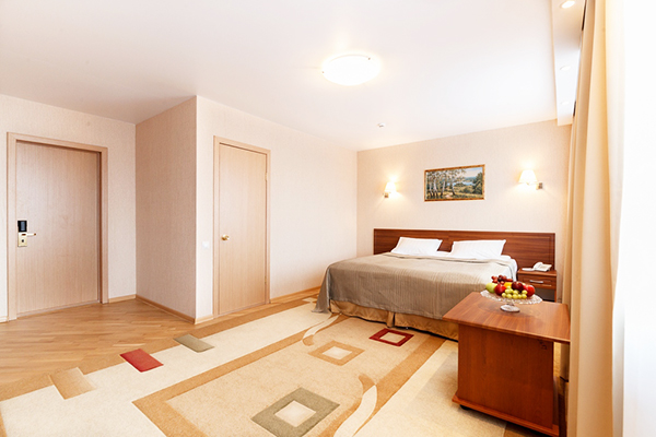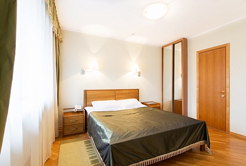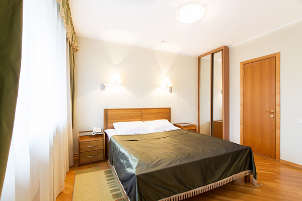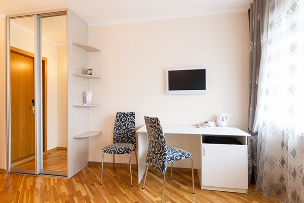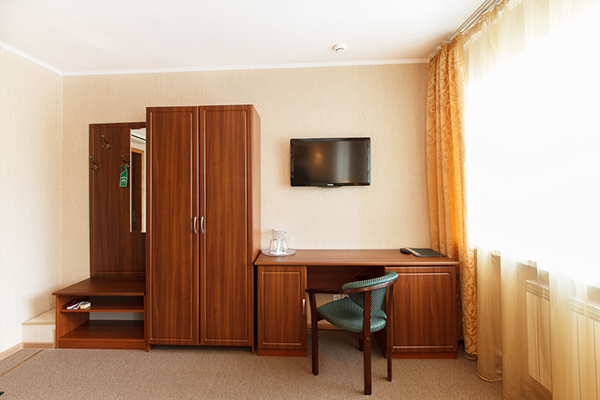 В номере: вешалка, зеркало, кровать двуспальная, стол, стулья, шкаф, кондиционер, сейф, телевизор, холодильник, чайная станция, электрочайник