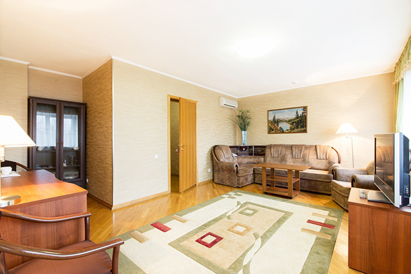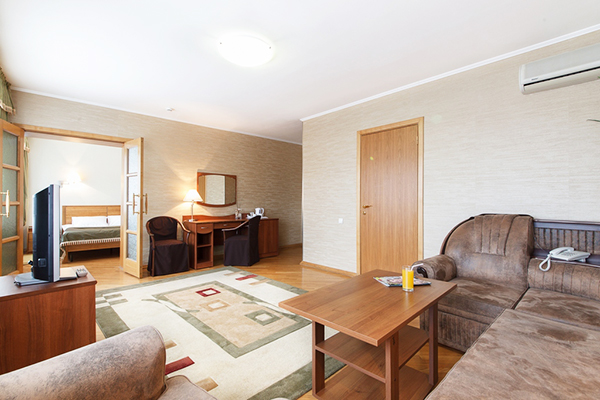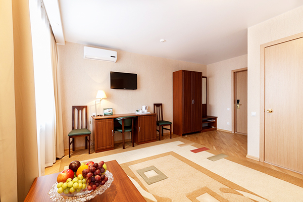 В номере: диван, кровать двуспальная, прикроватные тумбочки, стол, стулья, шкаф, кондиционер, мини-холодильник, сейф, телевизор, чайник