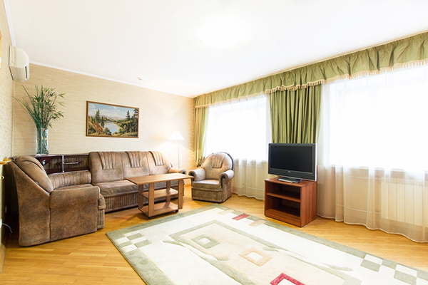 В номере: вешалка, диван, зеркало, кресло, кровать двуспальная, прикроватные тумбочки, стол, стулья, шкаф, вентилятор, сейф, телевизор, холодильник, чайный набор посуды, электрочайник