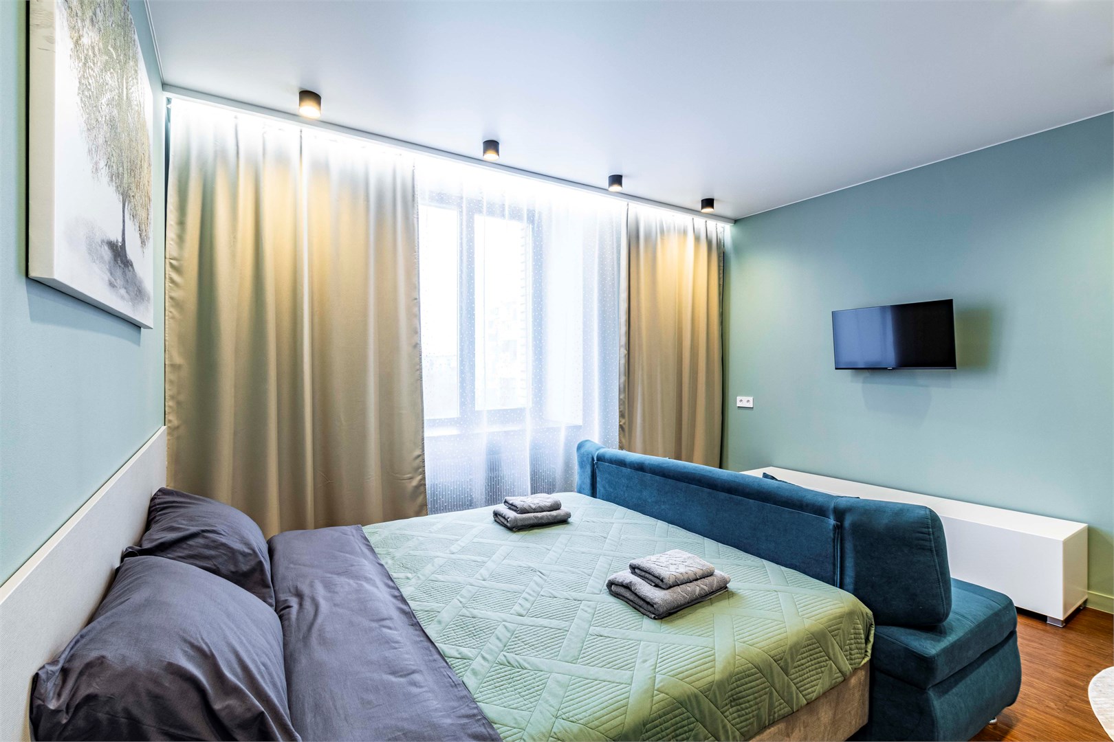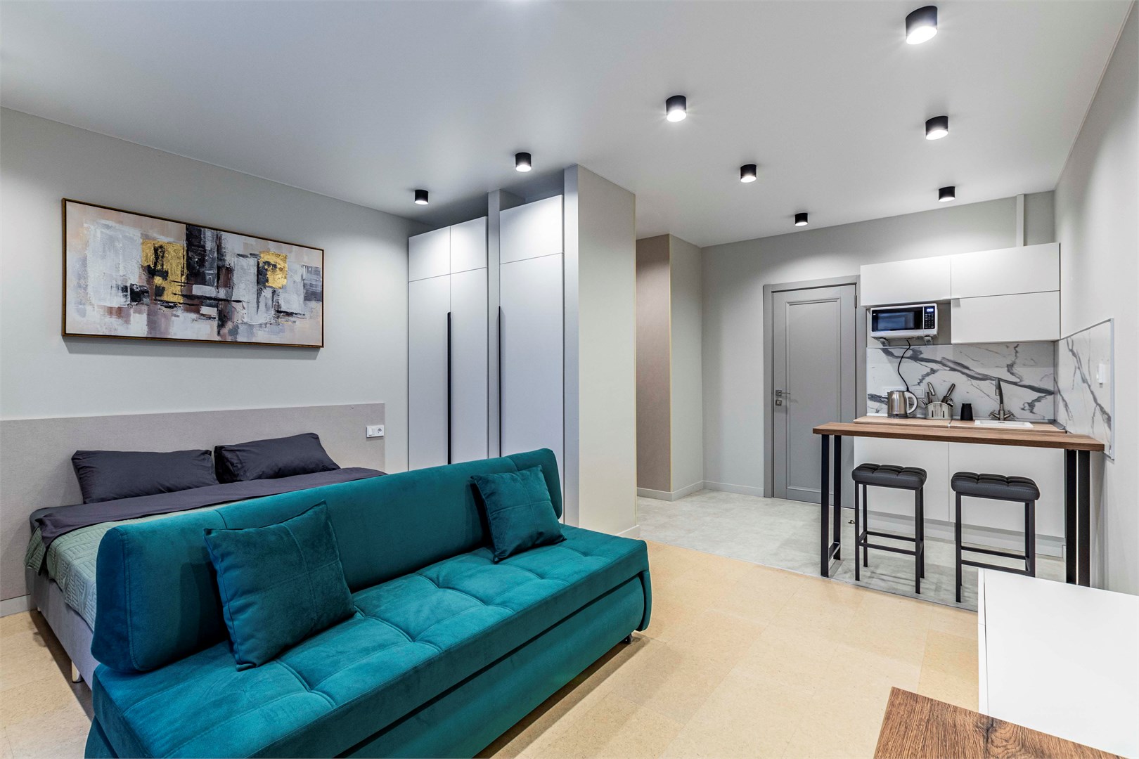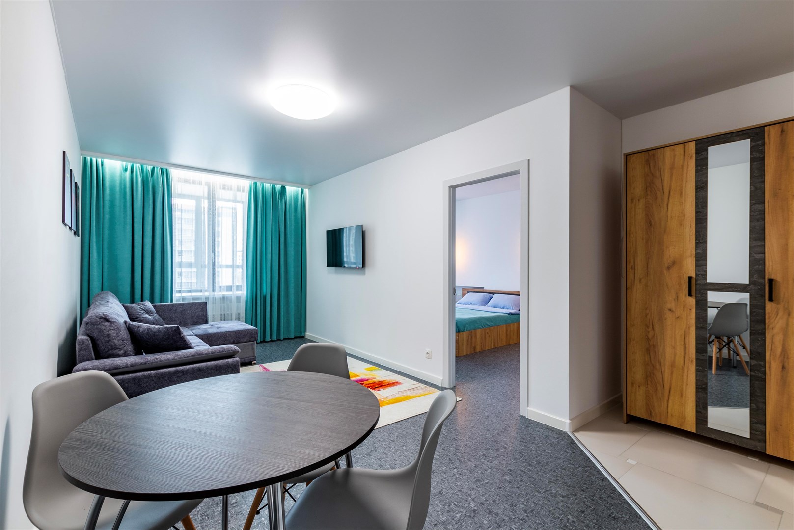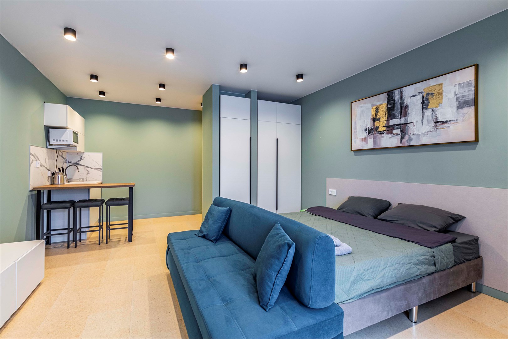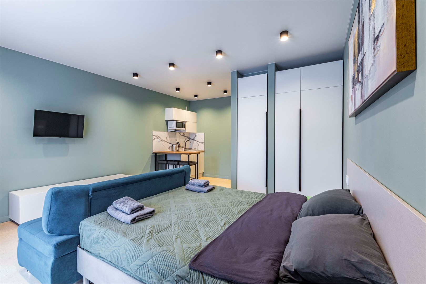 В номере: диван, кровать двуспальная, стол, стулья, шкаф, микроволновая печь, набор посуды, телевизор, чайник