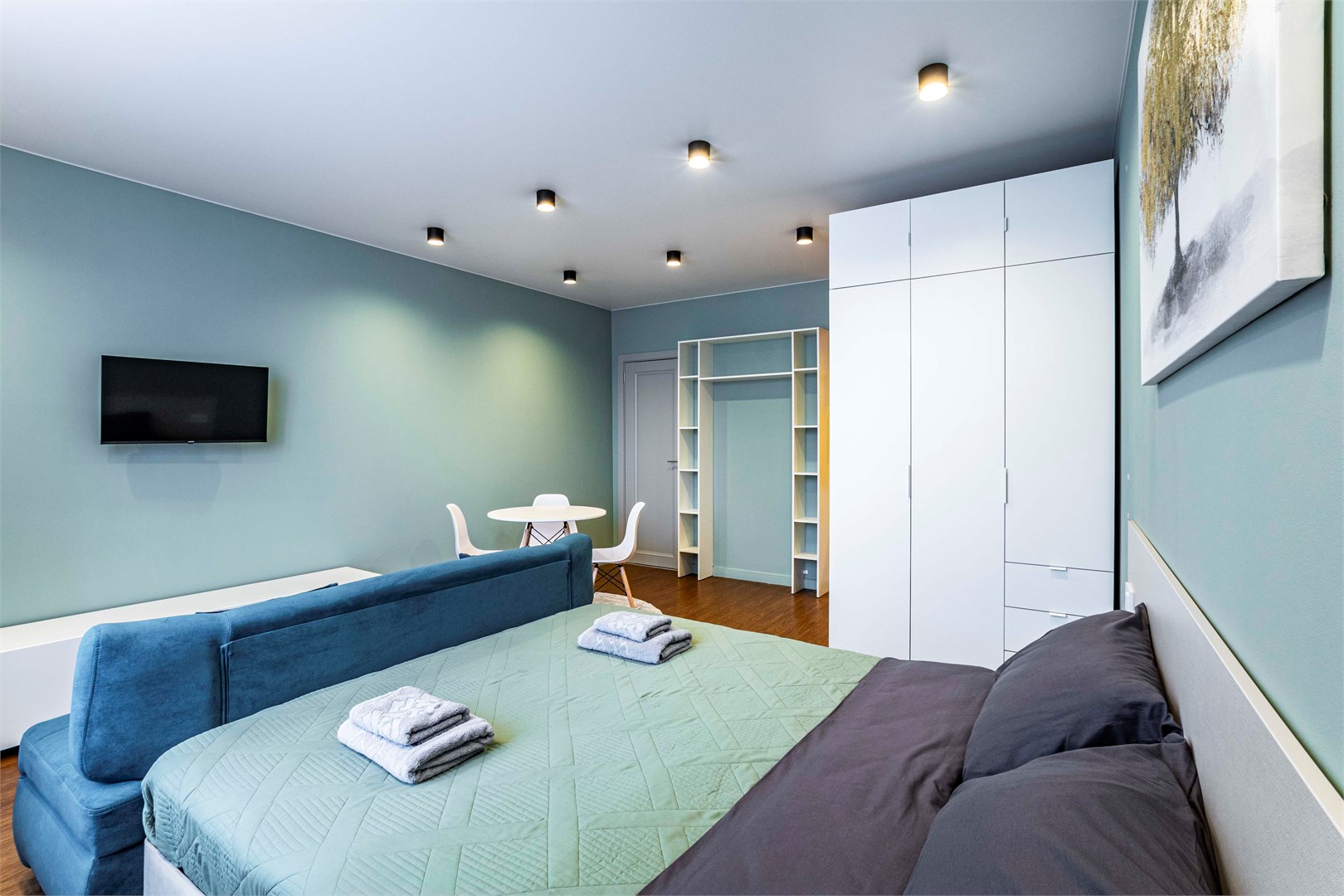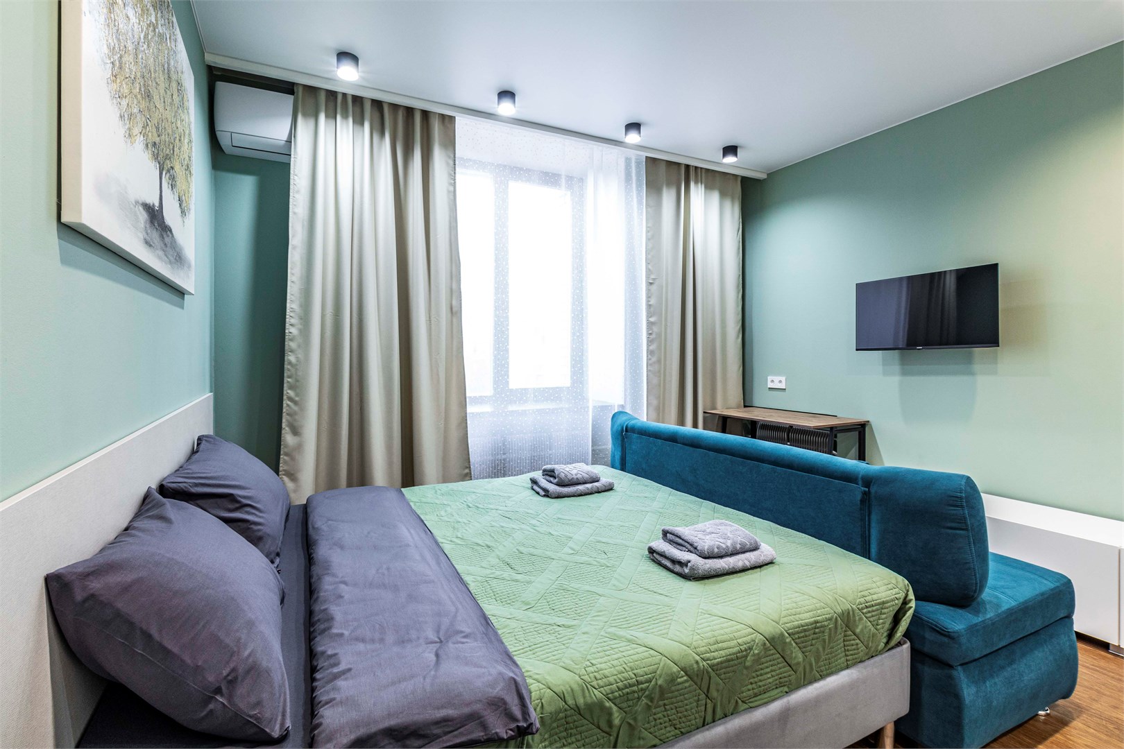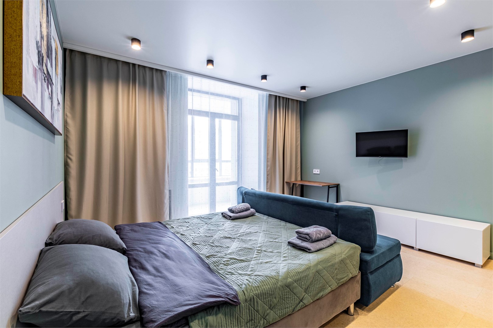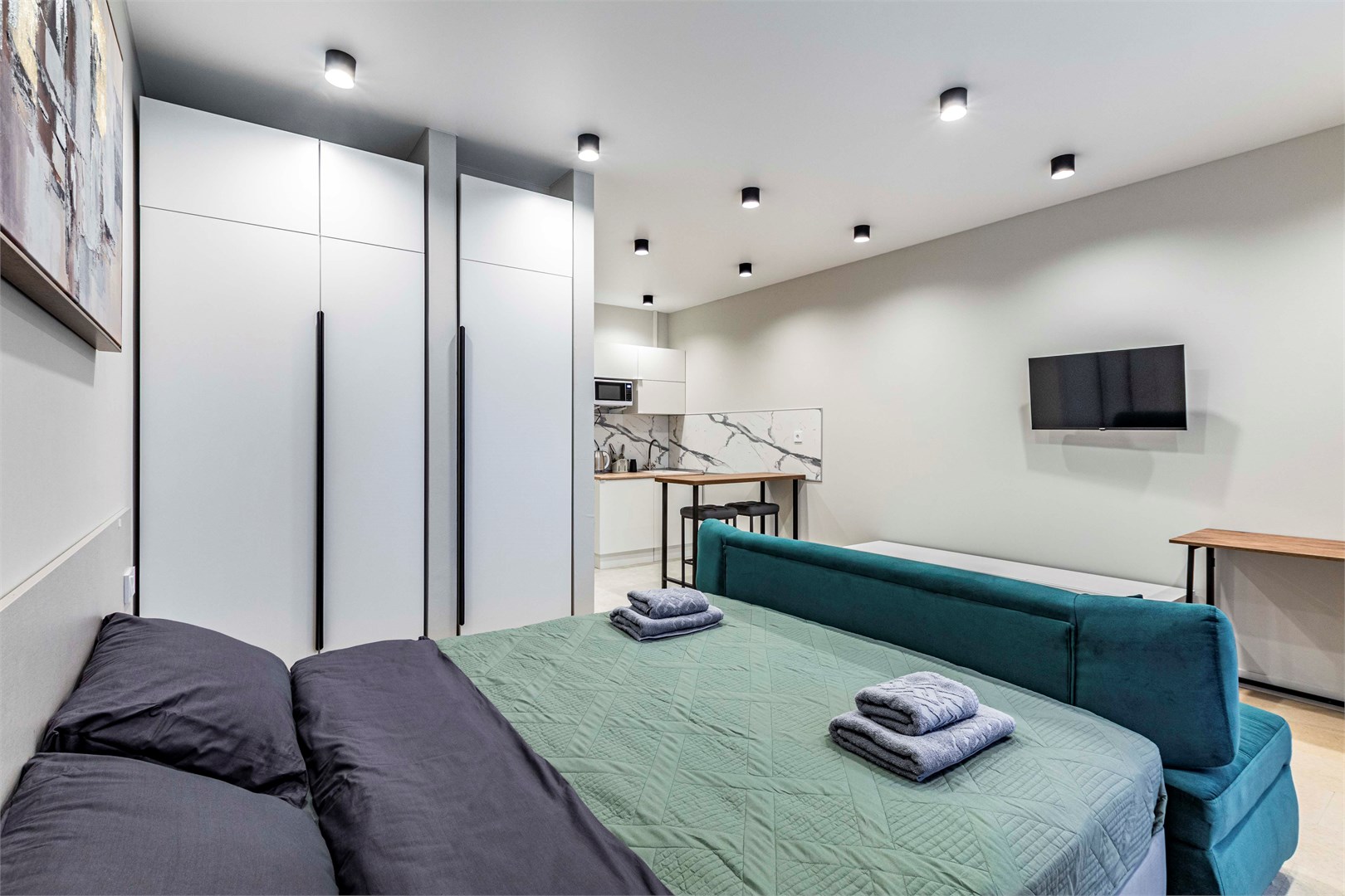 В номере: диван, кровать двуспальная, стол, стулья, шкаф, микроволновая печь, набор посуды, телевизор, чайник