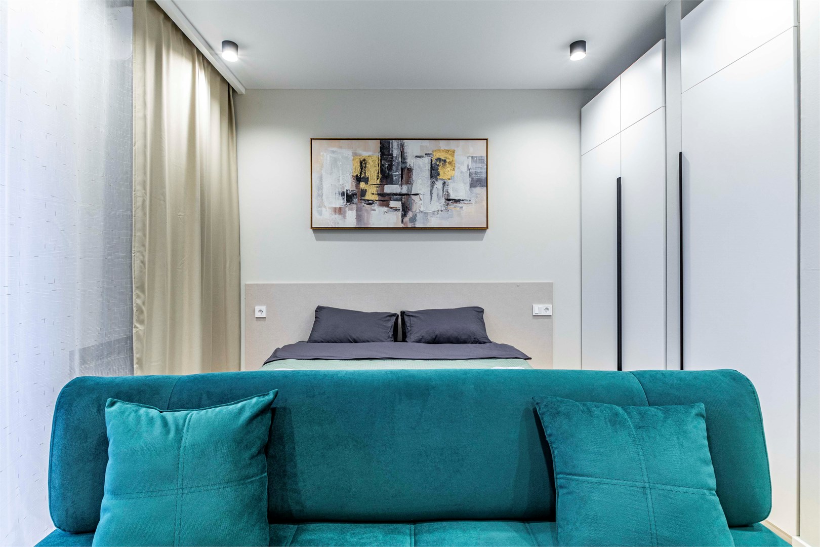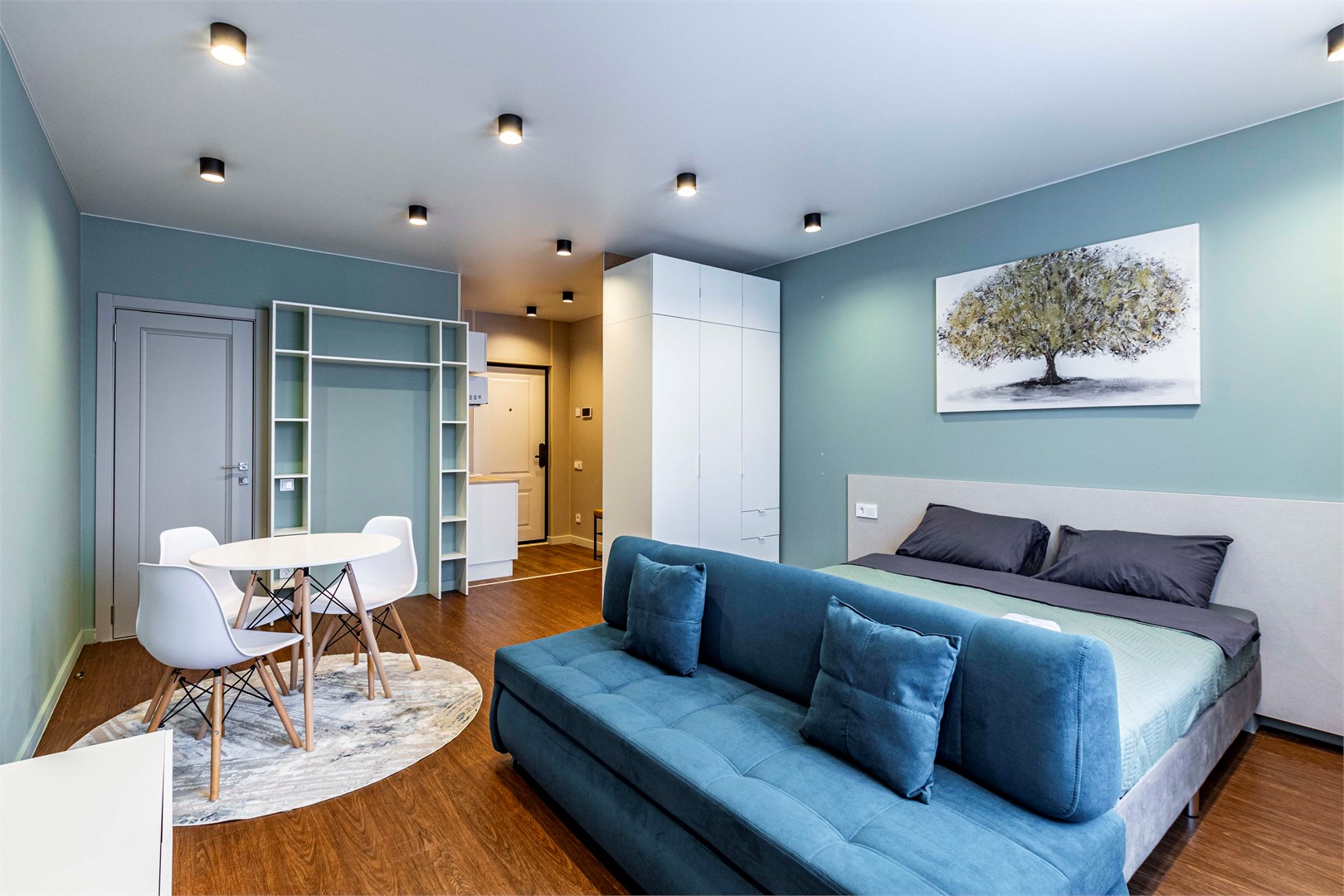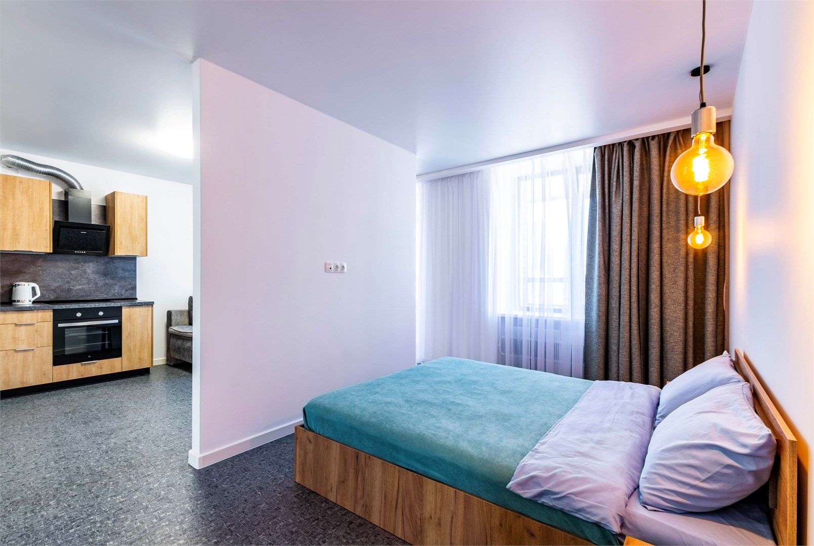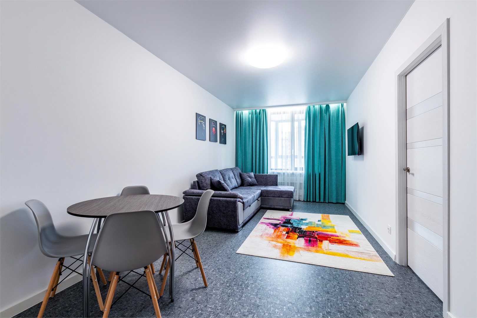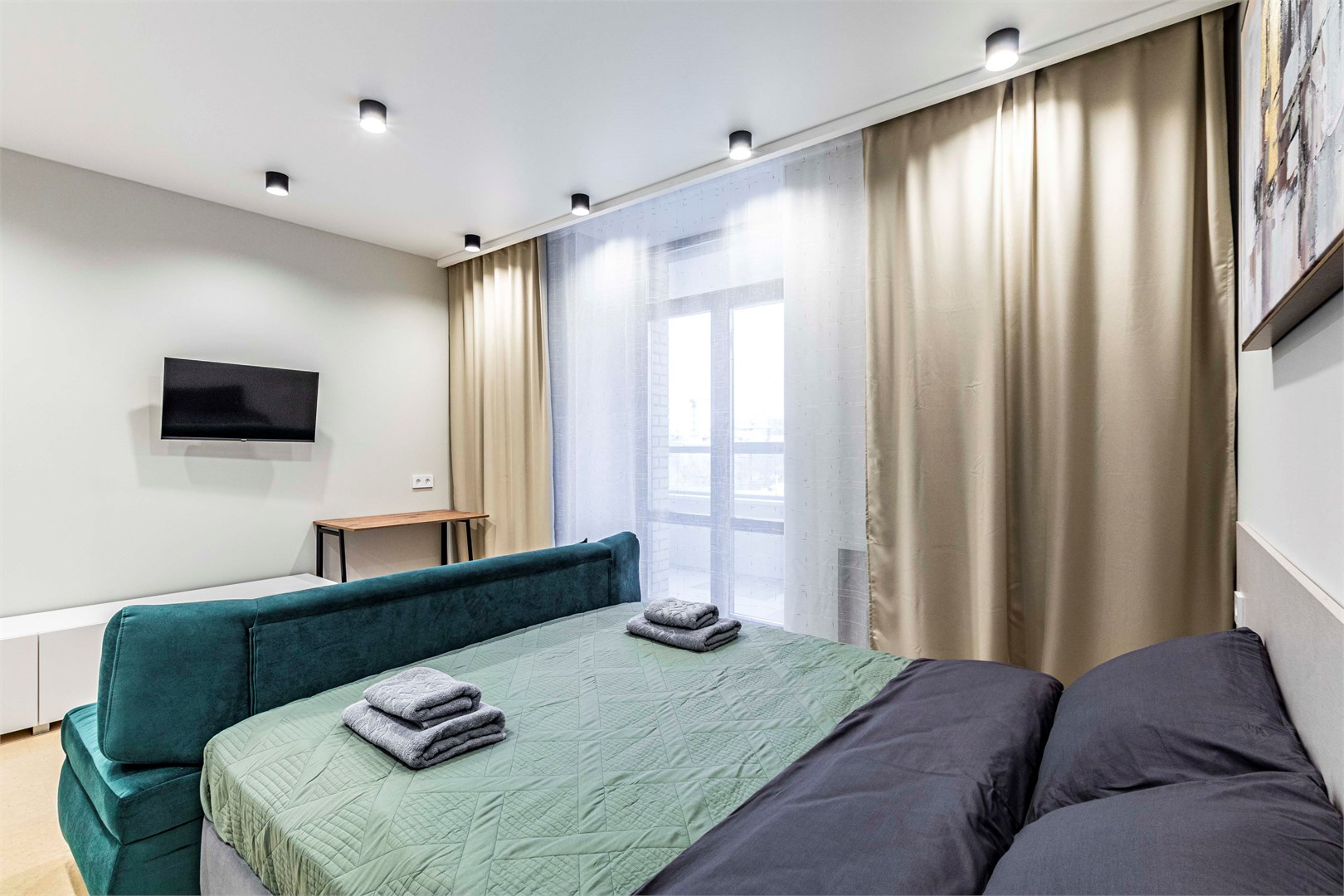 В номере: диван, кровать двуспальная, стол, стулья, шкаф, микроволновая печь, набор посуды, телевизор, чайник