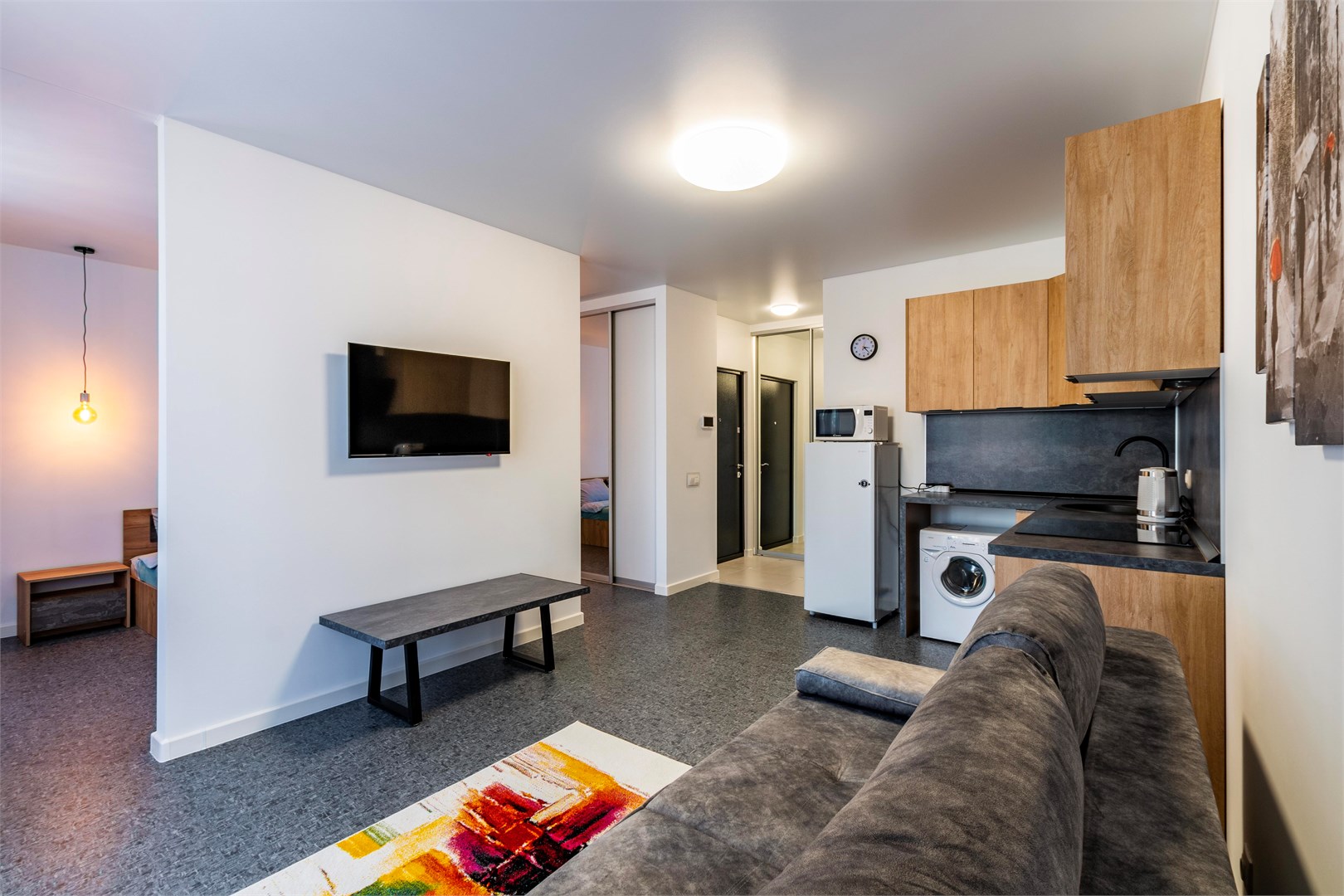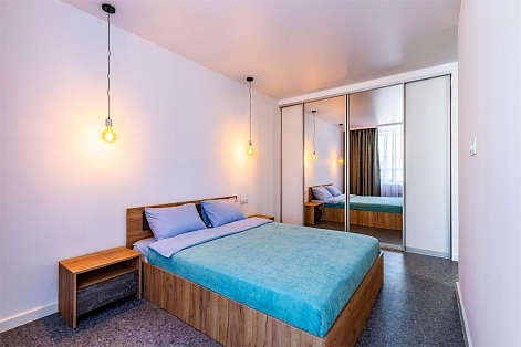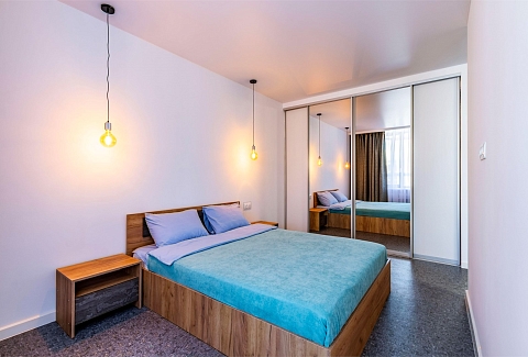 В номере: диван раскладной, кровать двуспальная, стол, стулья, шкаф, микроволновая печь, набор посуды, плита электрическая, стиральная машина, телевизор, холодильник, чайник