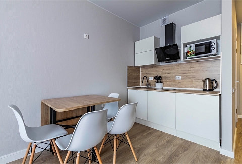 В номере: диван раскладной, кресло-кровать, кровать двуспальная, стол, стулья, шкаф, гладильная доска, микроволновая печь, набор посуды, плита электрическая, стиральная машина, телевизор, утюг, холодильник, чайник