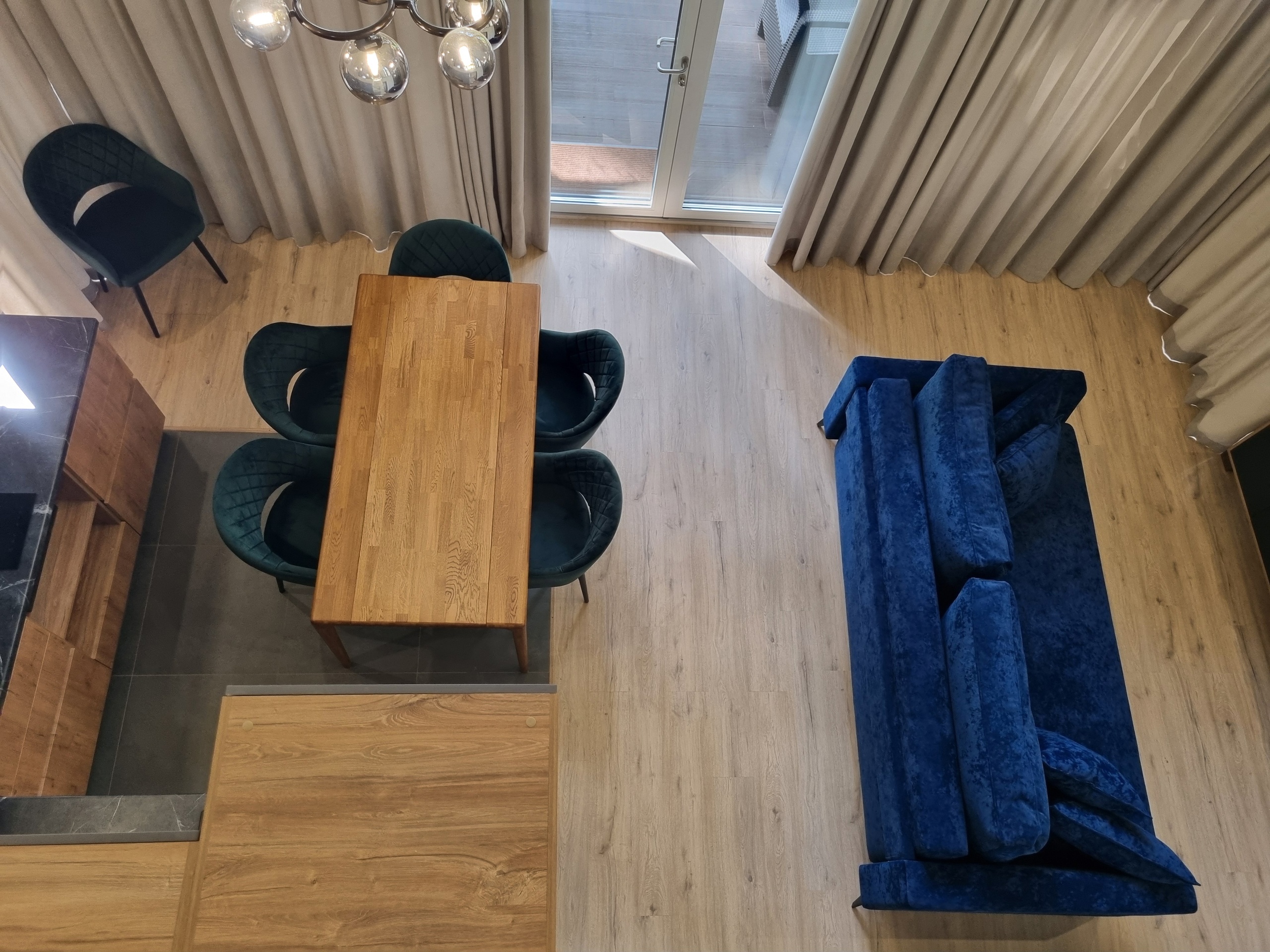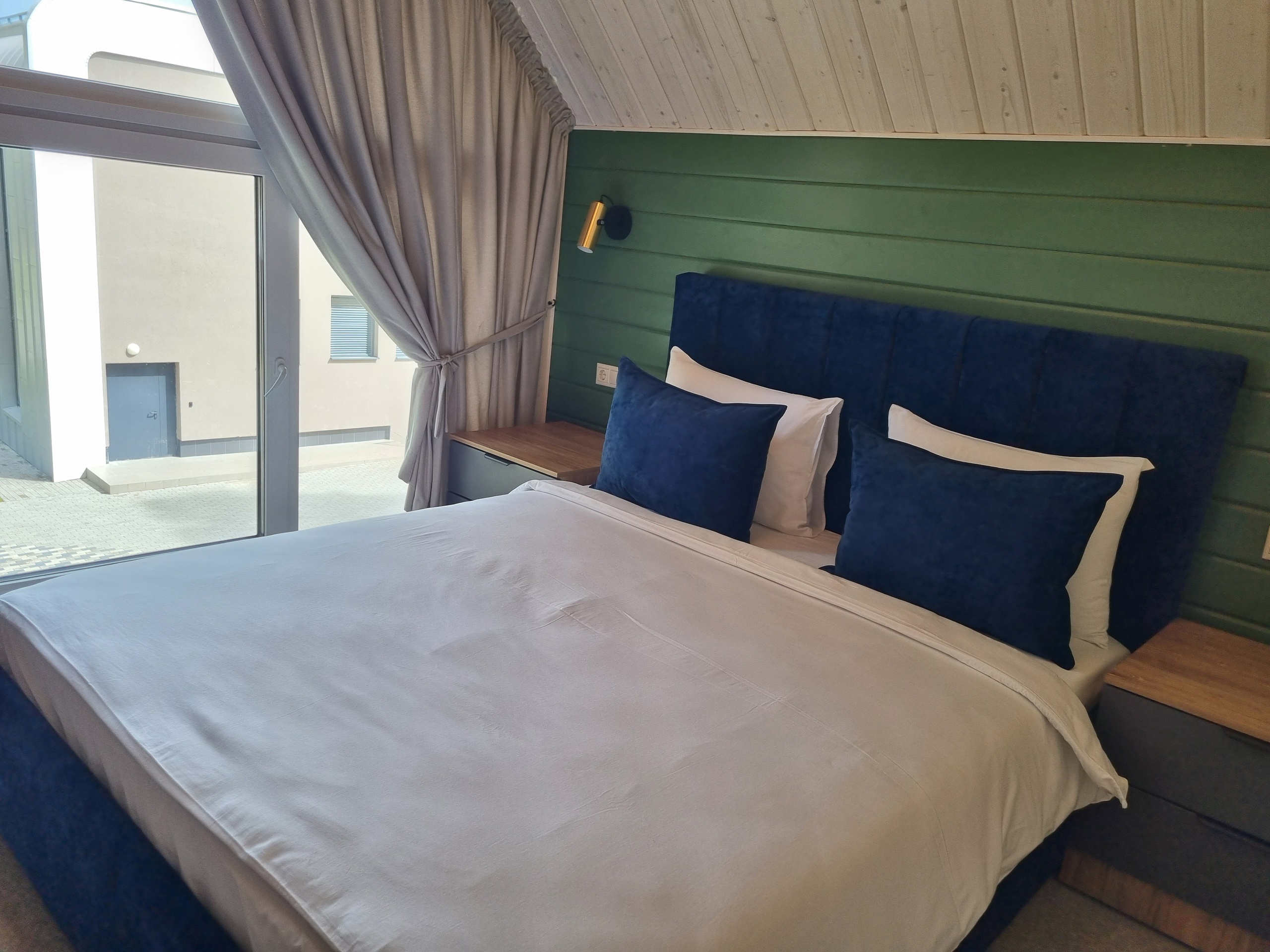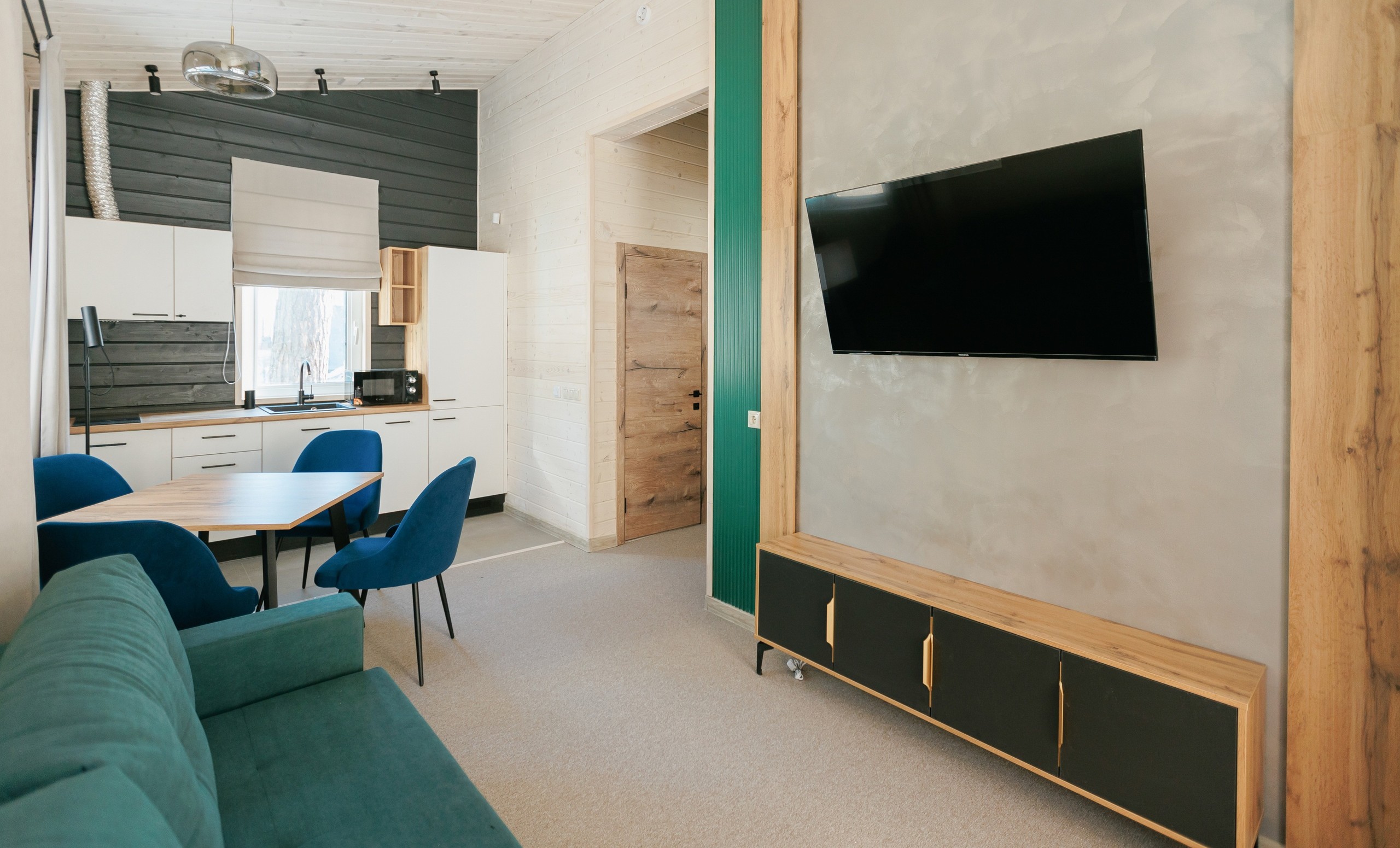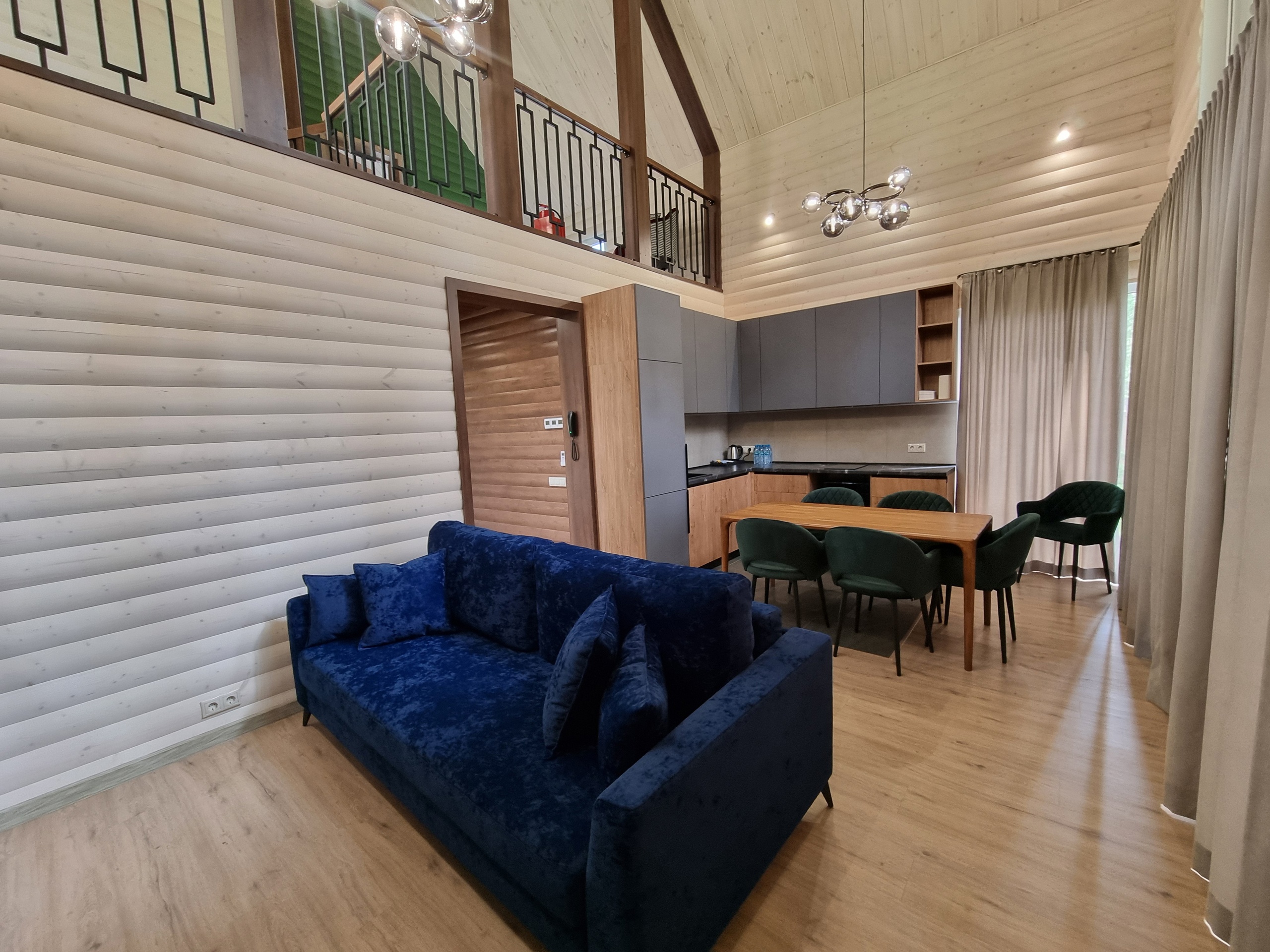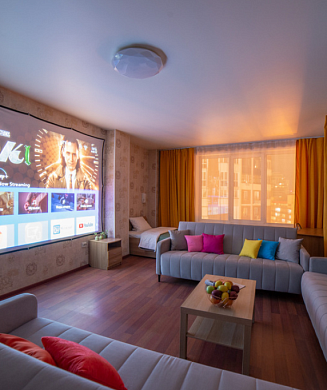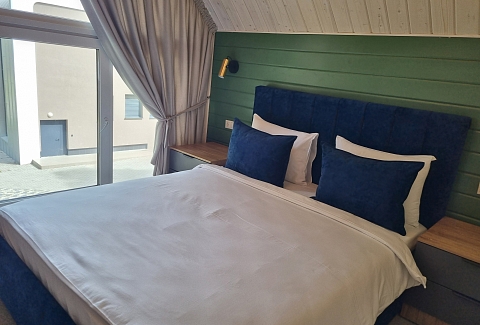 В номере: вешалка, диван раскладной, кровать двуспальная, стол, стулья, шкаф, кондиционер, микроволновая печь, набор посуды, обогреватель, плита электрическая, телевизор, телефон, теплый пол, холодильник, электрочайник