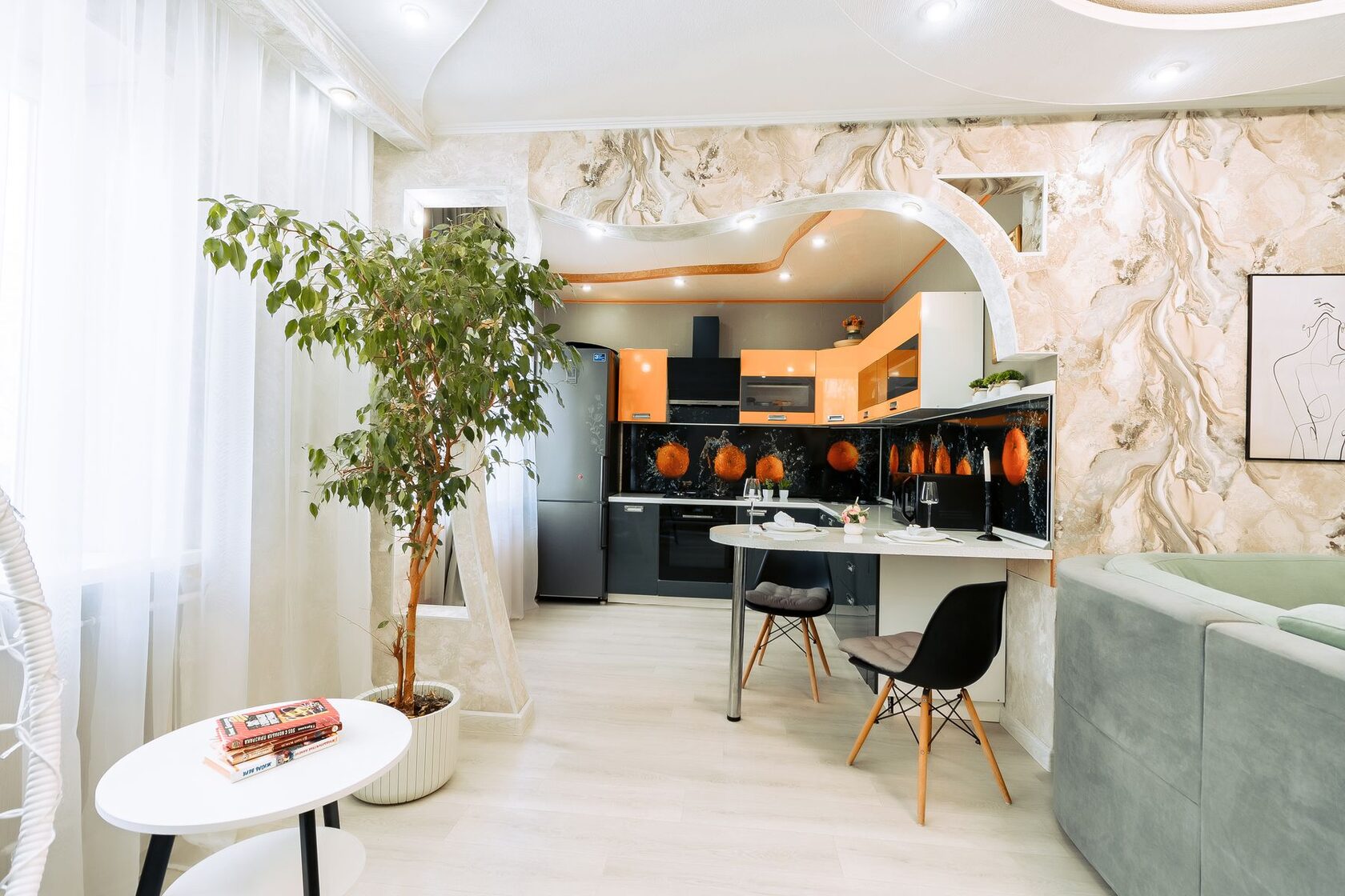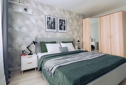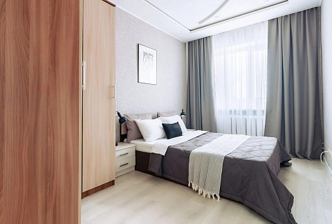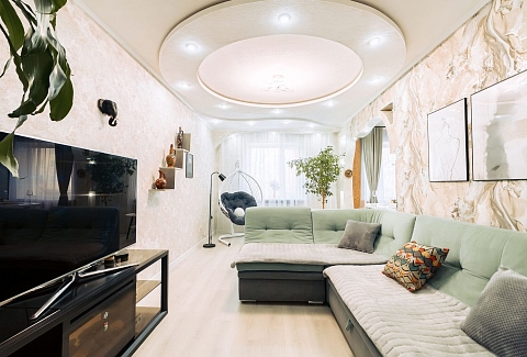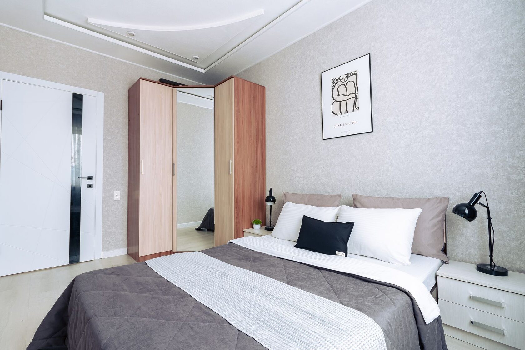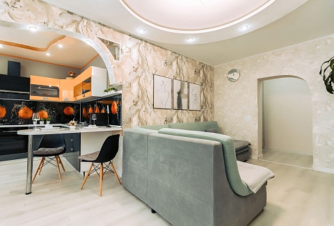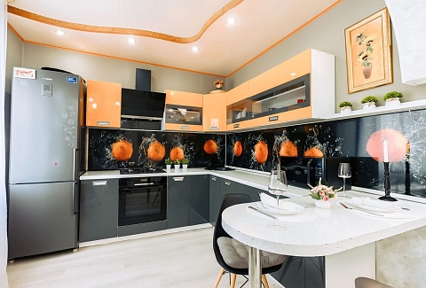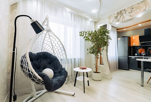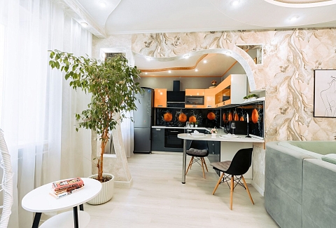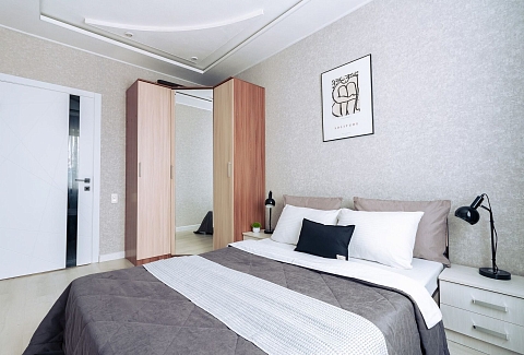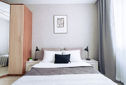 Для гостей, путешествующих на автомобиле, во дворе есть парковка. Для размещения гостей предлагаются трехкомнатные апартаменты с красивым дизайнерским интерьером. Две изолированные спальни оснащены комфортными двуспальными кроватями с ортопедическими матрасами, шкафами для вещей. Третье двуспальное место — большой раскладной диван в гостиной, где также расположено удобное кресло-капля для отдыха. В каждой комнате установлены ЖК-телевизоры с кабельными каналами, доступен беспроводной интернет. Гостиная гармонично переходит в кухню. Кухня оснащена всей необходимой мебелью и бытовой техникой: газовой плитой, духовым шкафом, холодильником, микроволновой печью, электрочайником, а также полным комплектом посуды на всех гостей. Обеденная зона представлена в виде лаконичной барной стойки. Для ухода за одеждой предусмотрены стиральная машина, сушилка для белья, утюг и гладильная доска. Санузел оборудован современной душевой кабиной, для гостей подготовлены тапочки, туалетные принадлежности и фен. Апартаменты идеально подходят как для коротких, так и для длительных поездок.