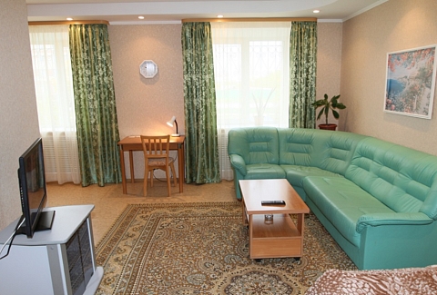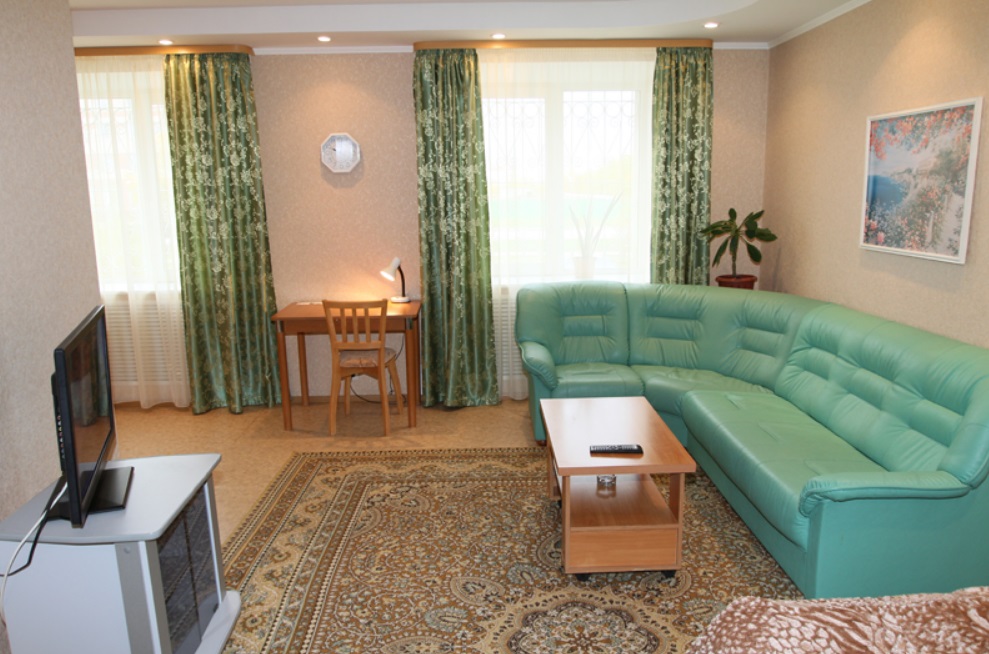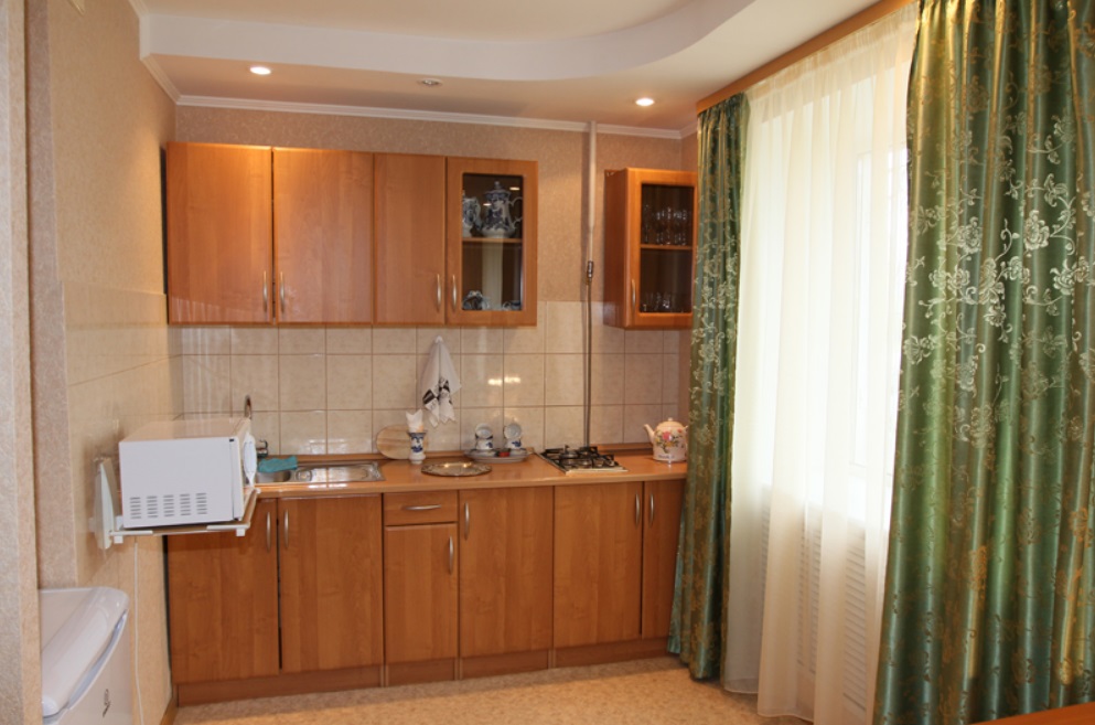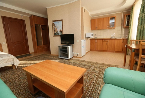 В номере: вешалка, диван, зеркало, кровать двуспальная, прикроватные тумбочки, стол, стулья, шкаф, микроволновая печь, набор посуды, плита газовая, телевизор, холодильник, электрочайник