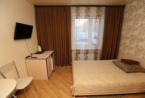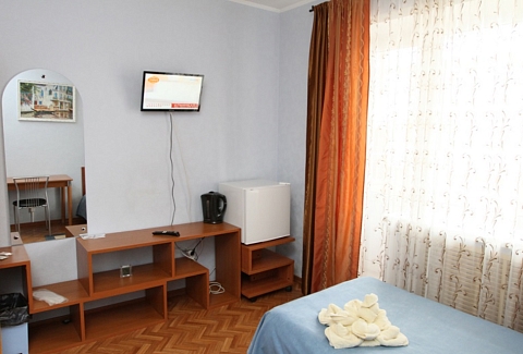 В номере: вешалка, зеркало, кровать полутороспальная, прикроватные тумбочки, стол, стулья, шкаф, микроволновая печь, мини-холодильник, телевизор, холодильник, электрочайник