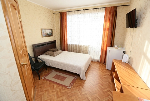 В номере: вешалка, зеркало, кресло, кровать полутороспальная, прикроватные тумбочки, стол, стулья, шкаф, микроволновая печь, мини-холодильник, телевизор, холодильник, электрочайник