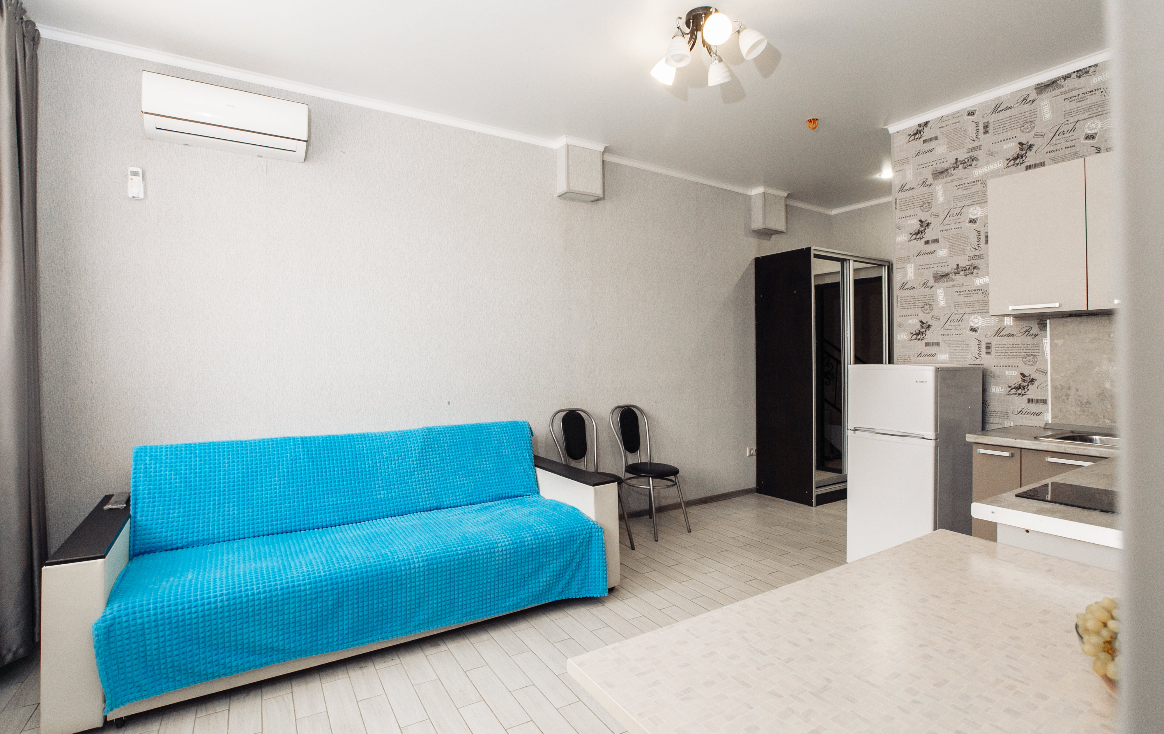 В номере: вешалка, диван раскладной, зеркало, кровать двуспальная, прикроватные тумбочки, стол, стулья, шкаф, кондиционер, телевизор, холодильник