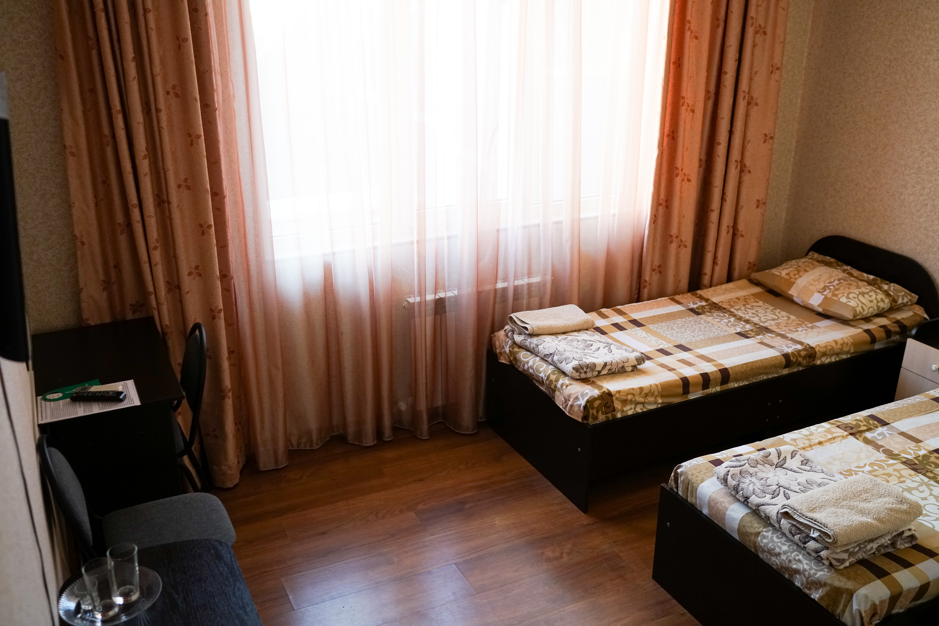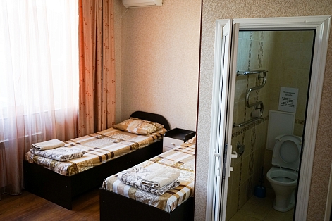В номере: вешалка, кровати односпальные, прикроватные тумбочки, шкаф, кондиционер, телевизор, холодильник, чайный набор посуды