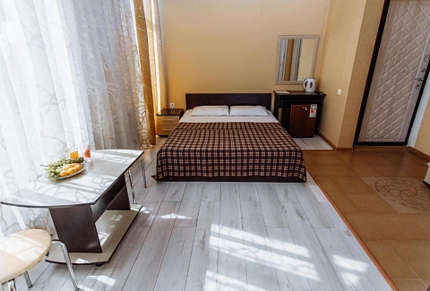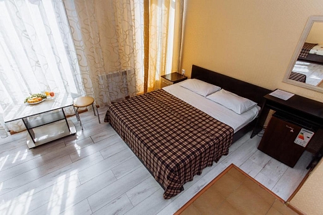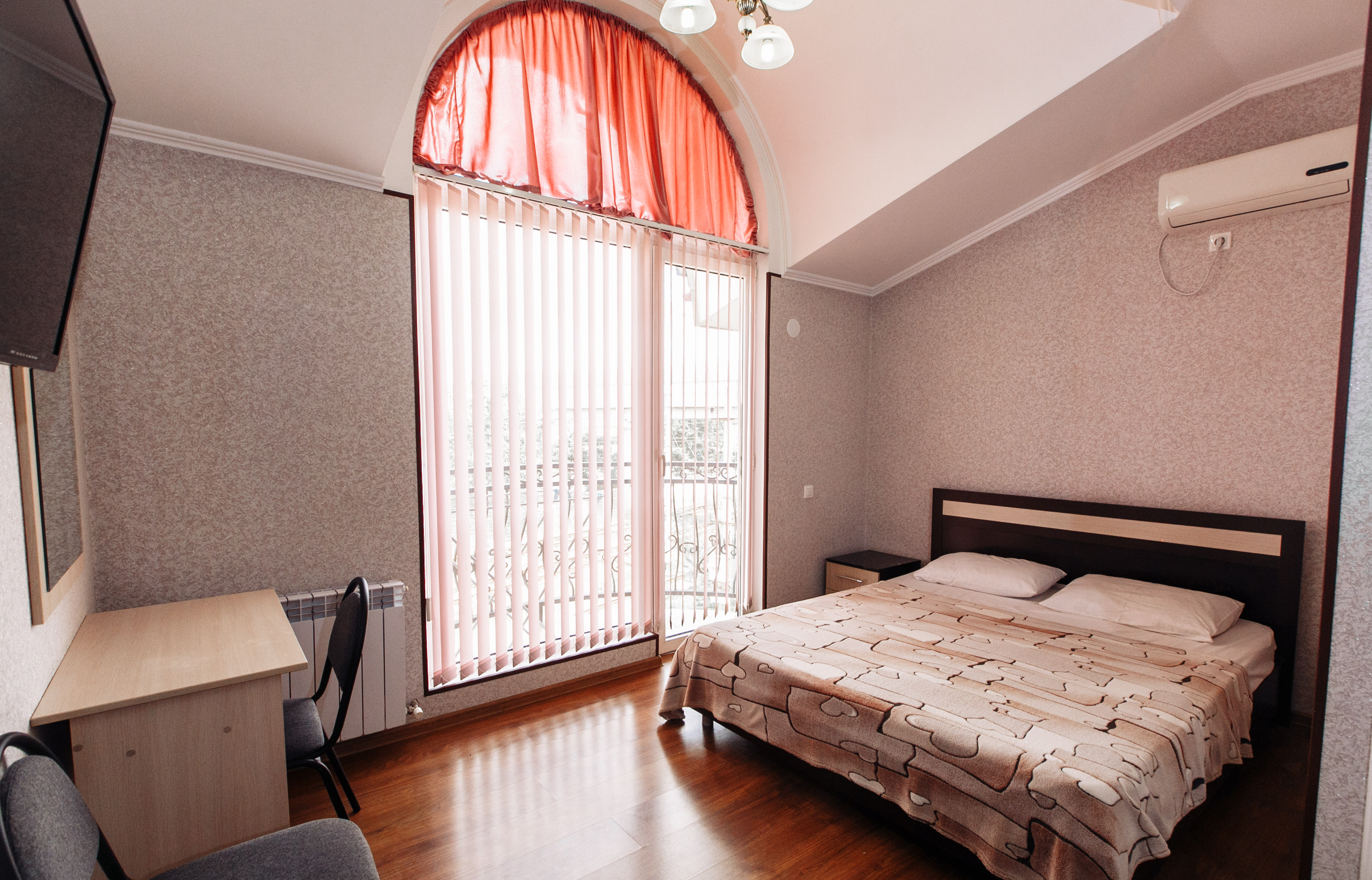 В номере: вешалка, зеркало, кровать двуспальная, прикроватные тумбочки, стол, стулья, шкаф, кондиционер, мини-холодильник, телевизор