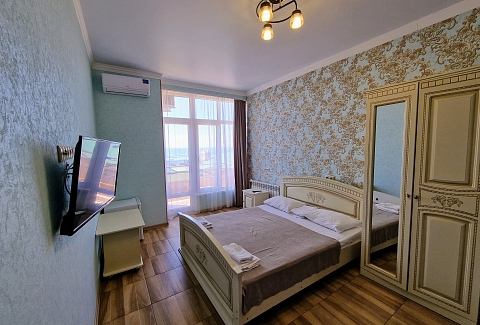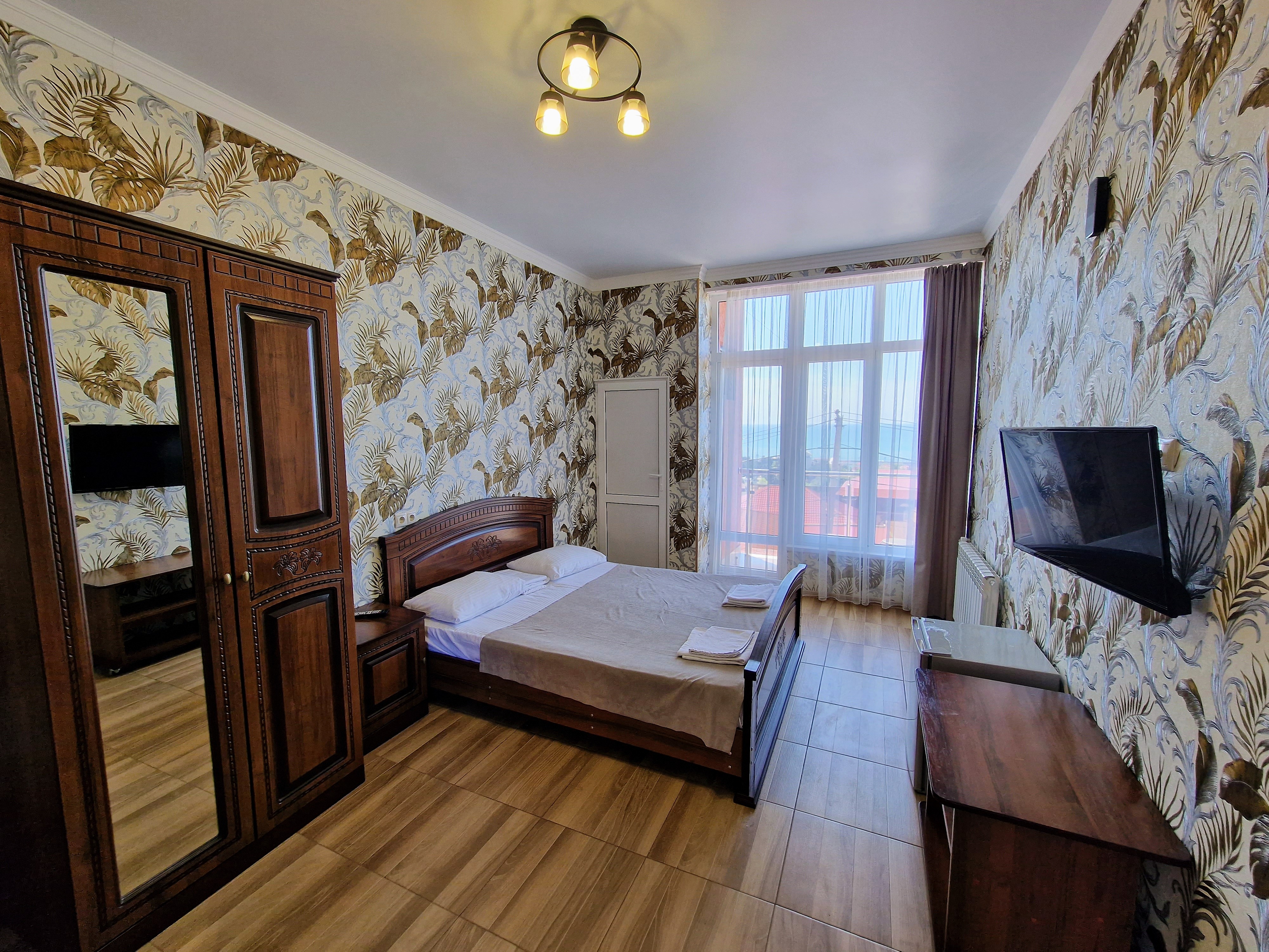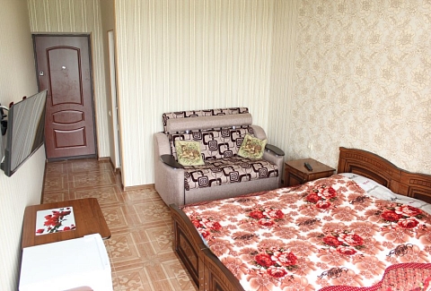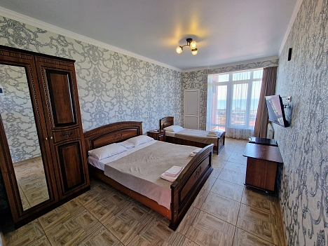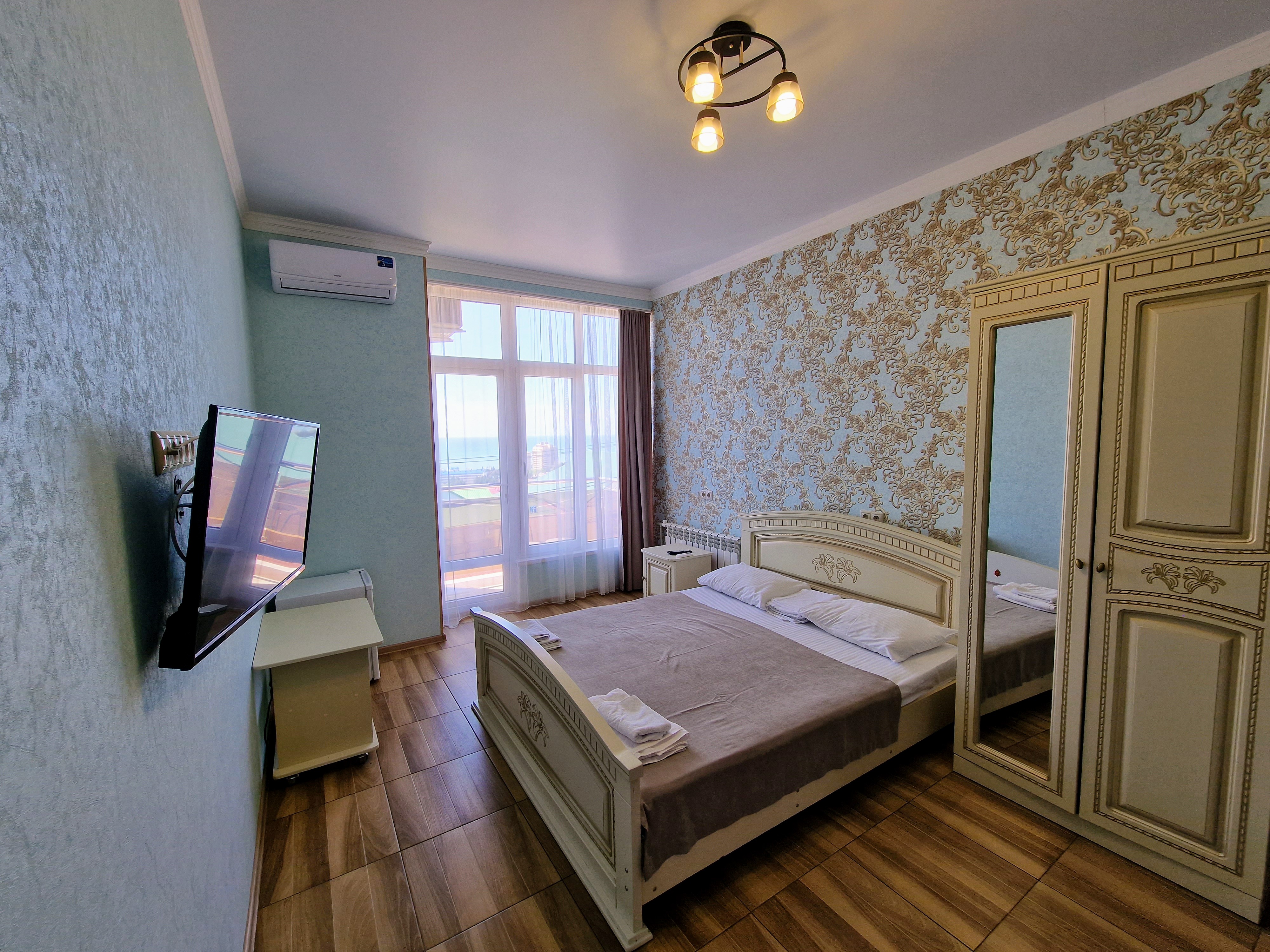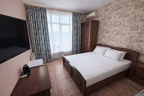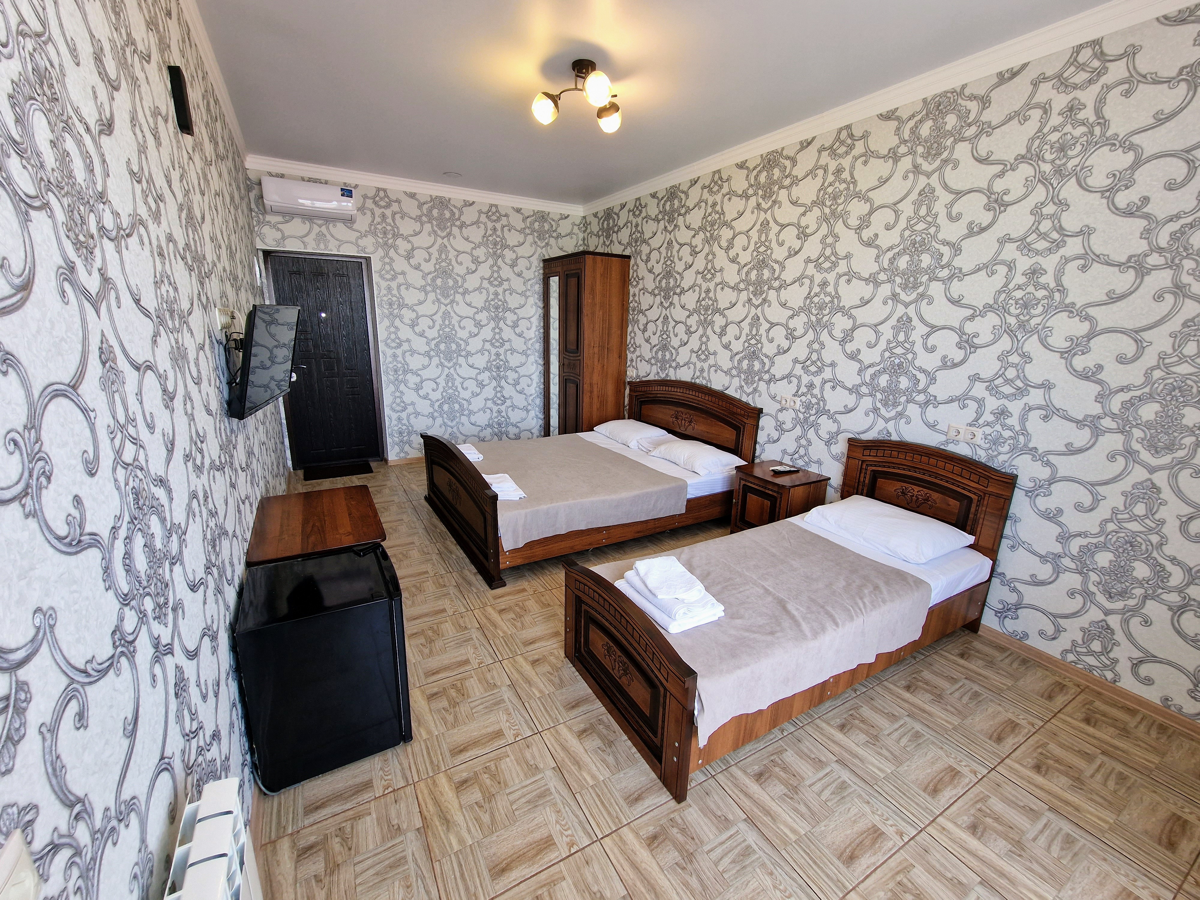 В номере: диван раскладной, зеркало, кровать двуспальная, кровать односпальная, прикроватные тумбочки, стол, стулья, шкаф, сплит-система, телевизор ЖК, холодильник, электрочайник