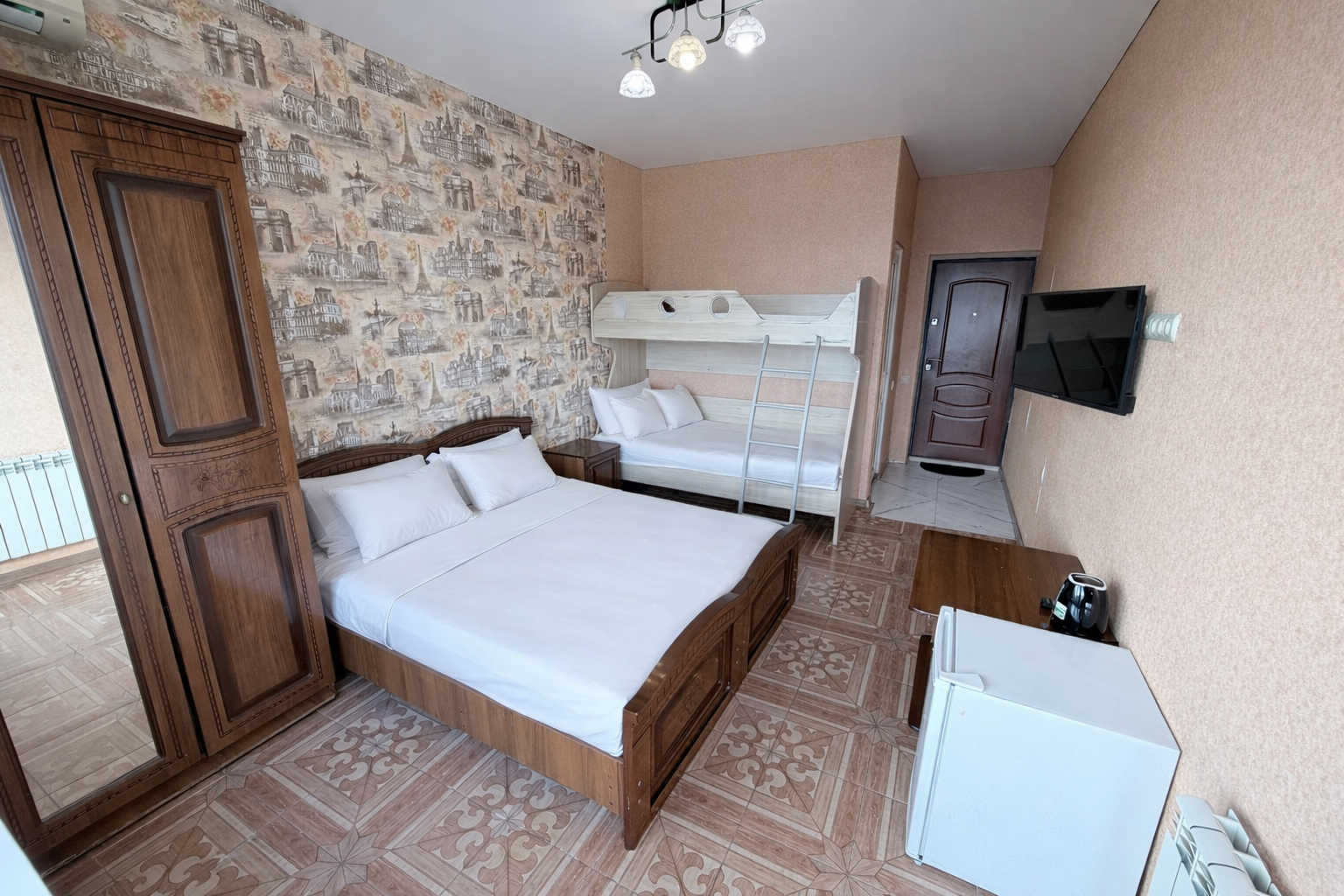 В номере: вешалка, зеркало, кровать двуспальная, кровать двухъярусная, прикроватные тумбочки, стол, стулья, шкаф, сплит-система, телевизор ЖК, холодильник, электрочайник
