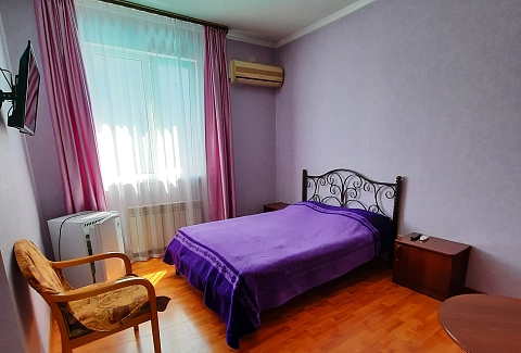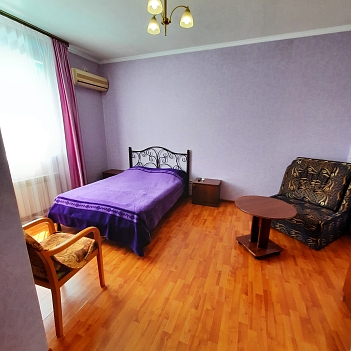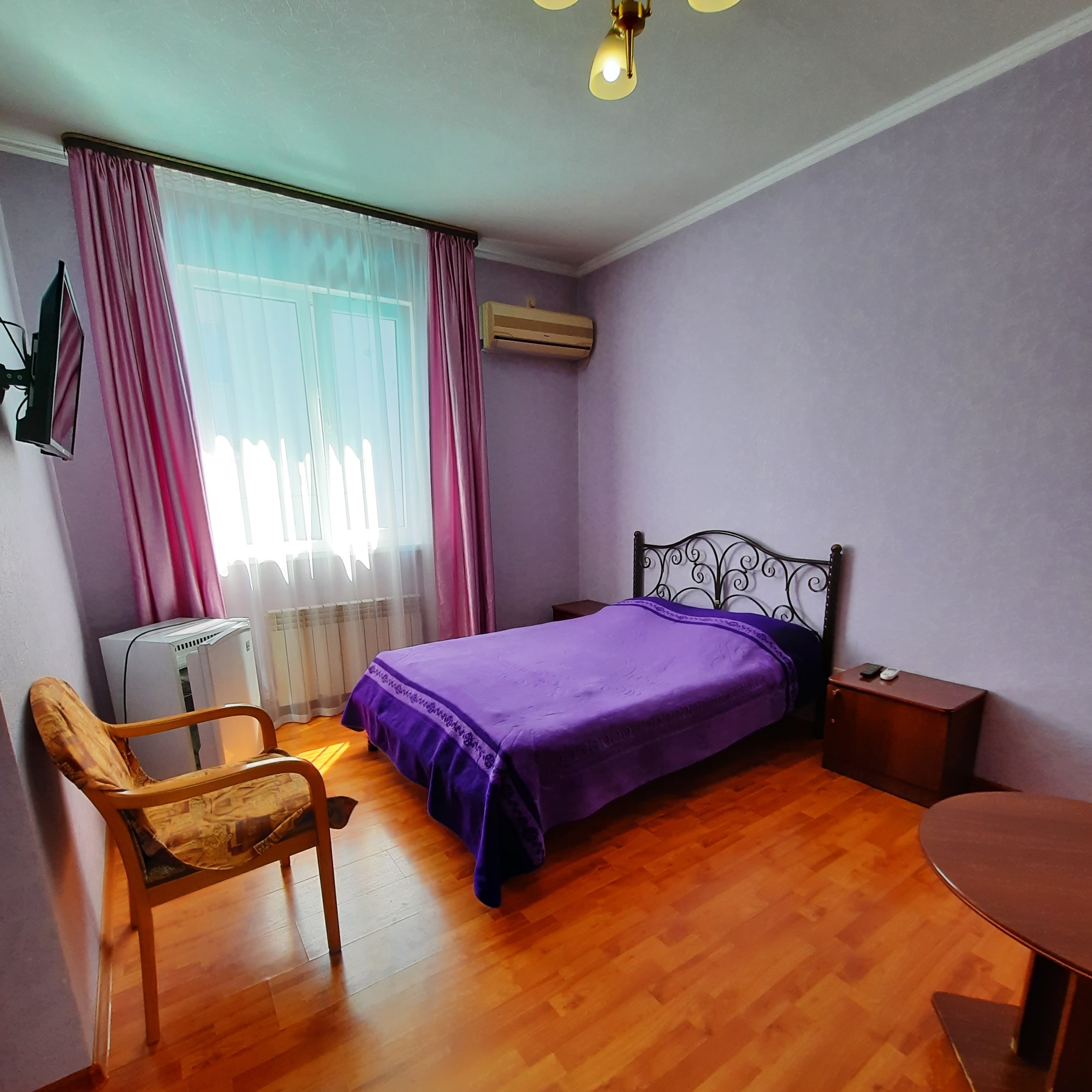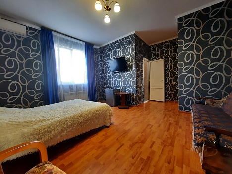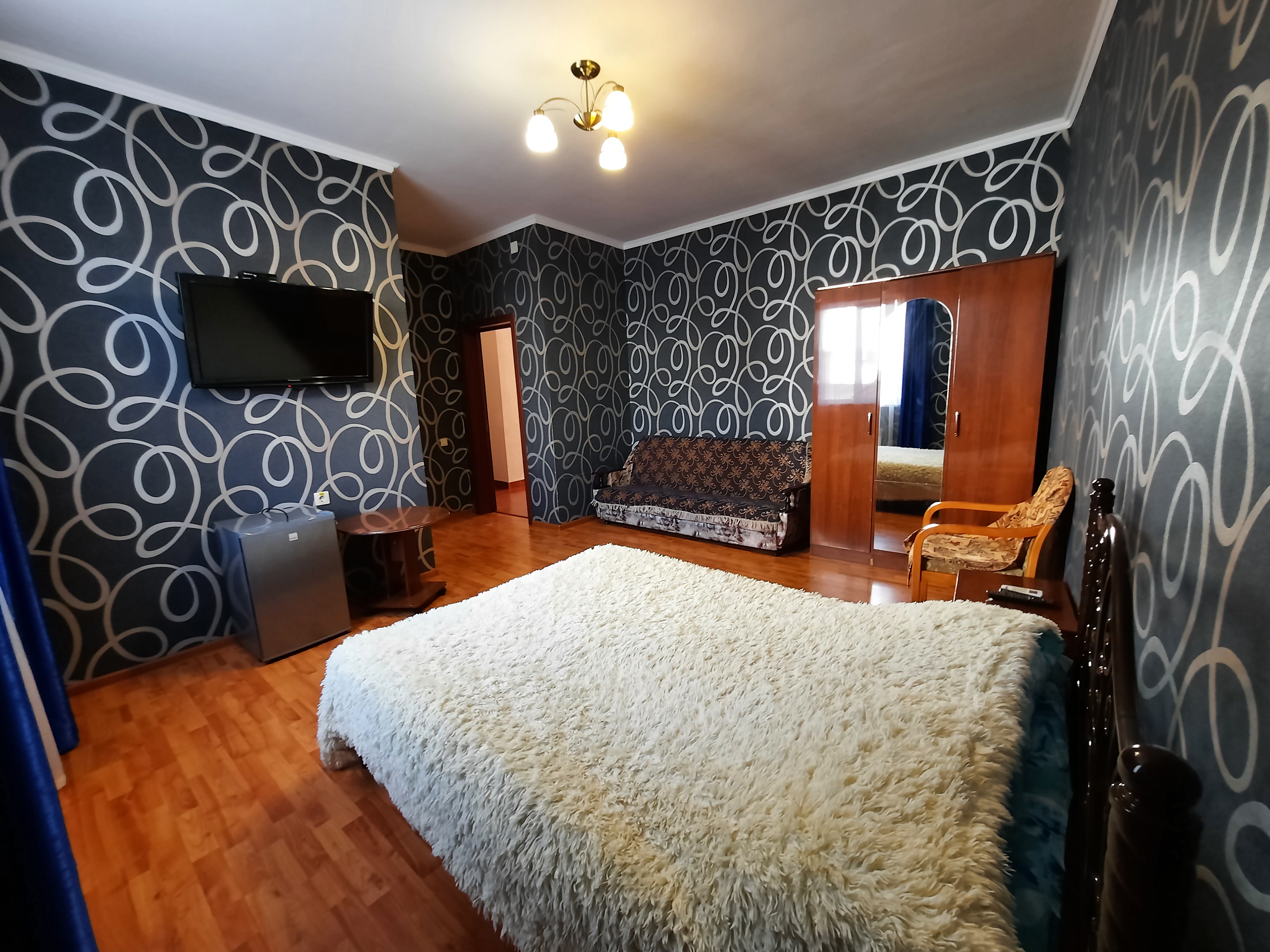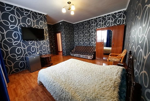 В номере: вешалка, диван раскладной, зеркало, кровать двуспальная, прикроватные тумбочки, стол, стулья, шкаф, сплит-система, телевизор ЖК, холодильник