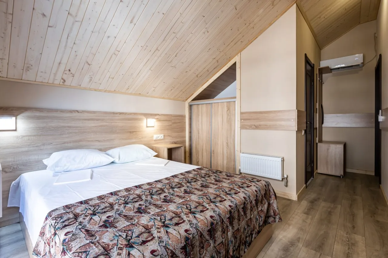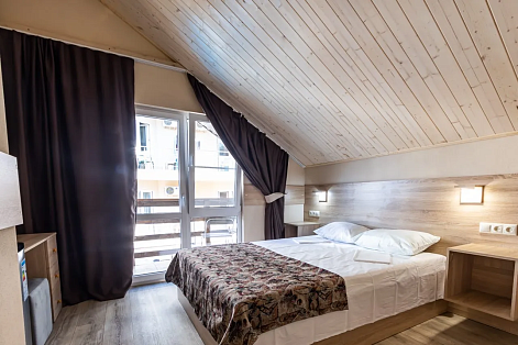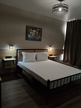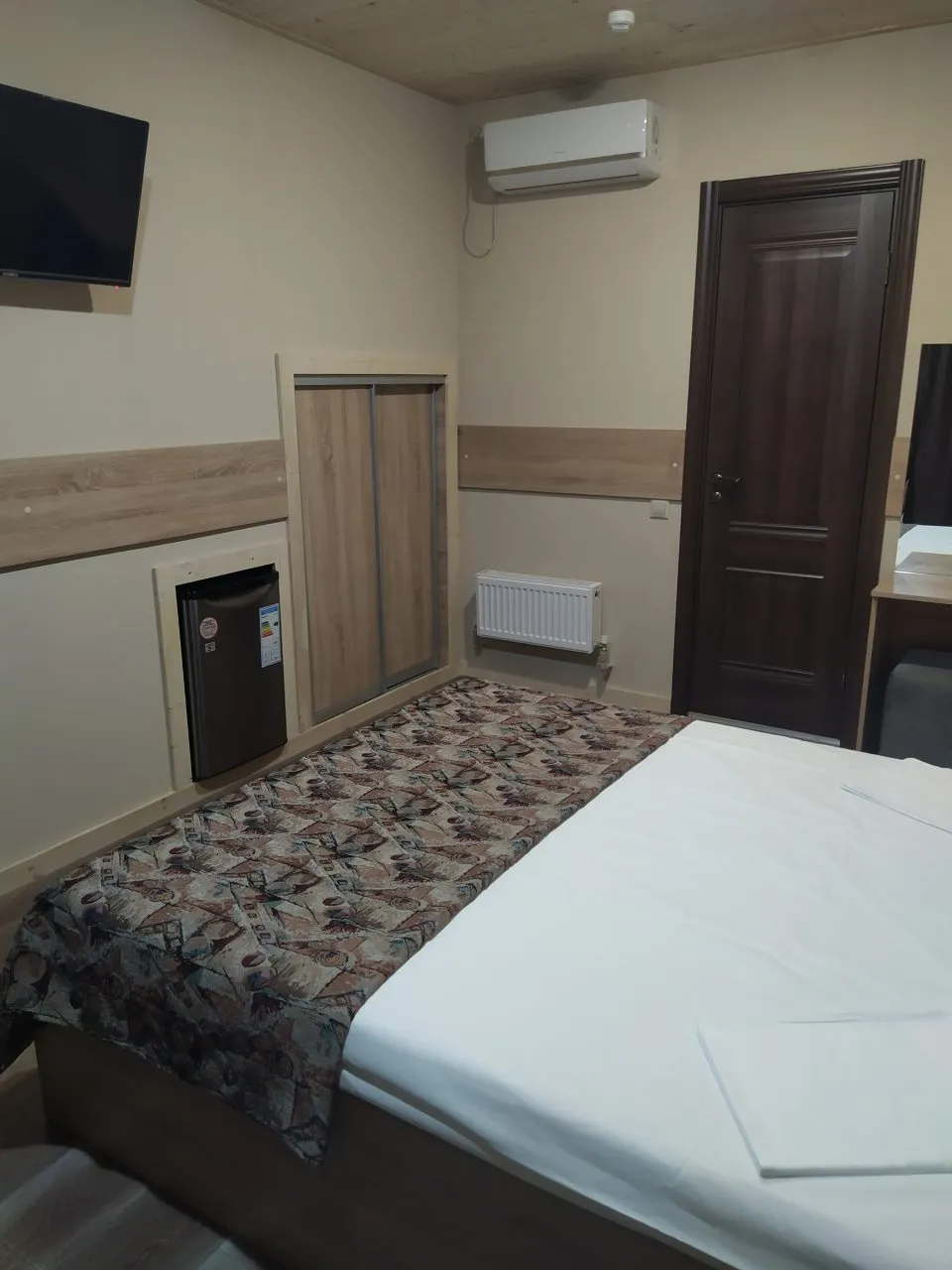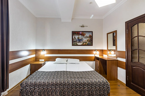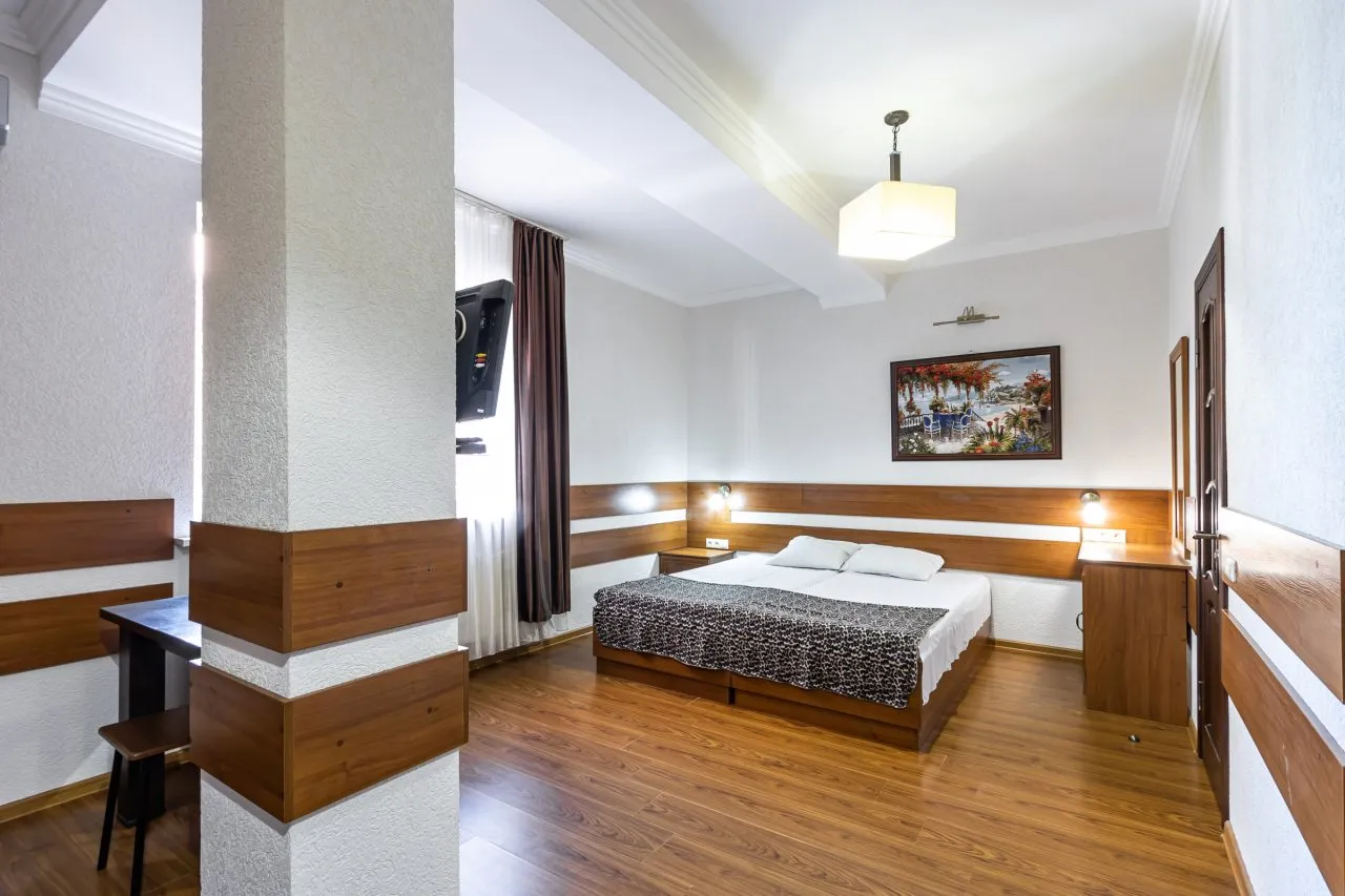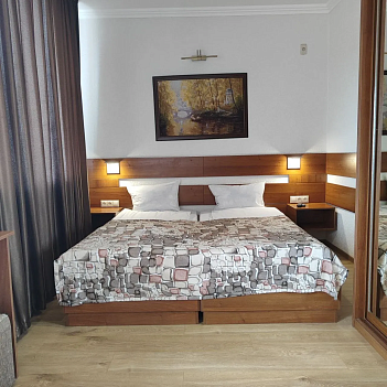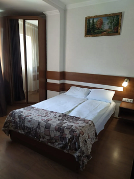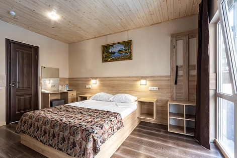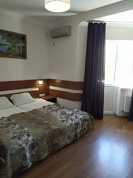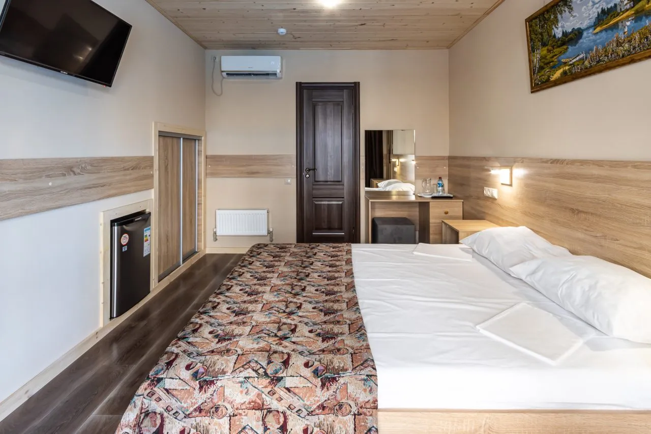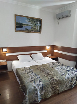 В номере: вешалка, зеркало, кровать двуспальная, прикроватные тумбочки, шкаф, кондиционер, мини-холодильник, телевизор ЖК