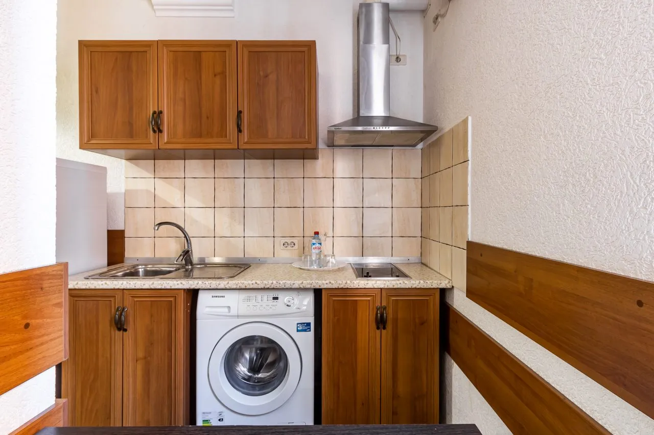 В номере: вешалка, зеркало, кровать двуспальная, прикроватные тумбочки, стол, стулья, шкаф, кондиционер, плита газовая, стиральная машина, телевизор ЖК, холодильник, чайник, чайный набор посуды