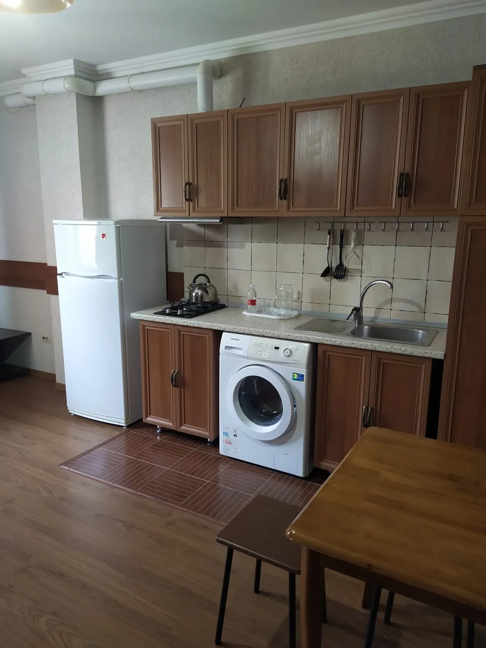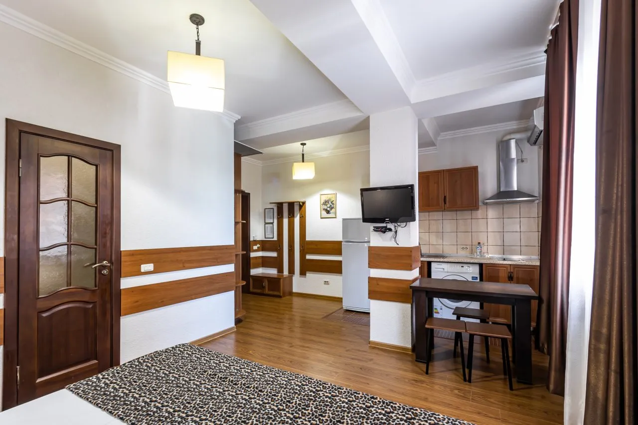 В номере: вешалка, зеркало, кресло-кровать, кровать двуспальная, прикроватные тумбочки, стол, стулья, шкаф, кондиционер, набор посуды, плита газовая, стиральная машина, телевизор ЖК, холодильник, чайник, чайный набор посуды