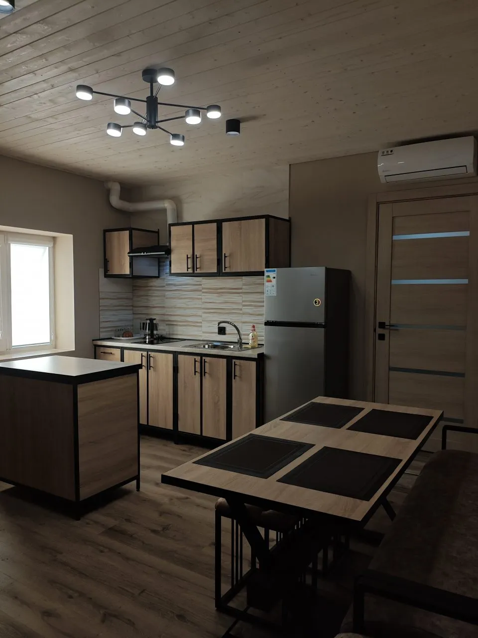 В номере: вешалка, зеркало, кровать двуспальная, прикроватные тумбочки, стол, стулья, шкаф, кондиционер, набор посуды, плита электрическая, стиральная машина, телевизор ЖК, холодильник, чайный набор посуды, электрочайник