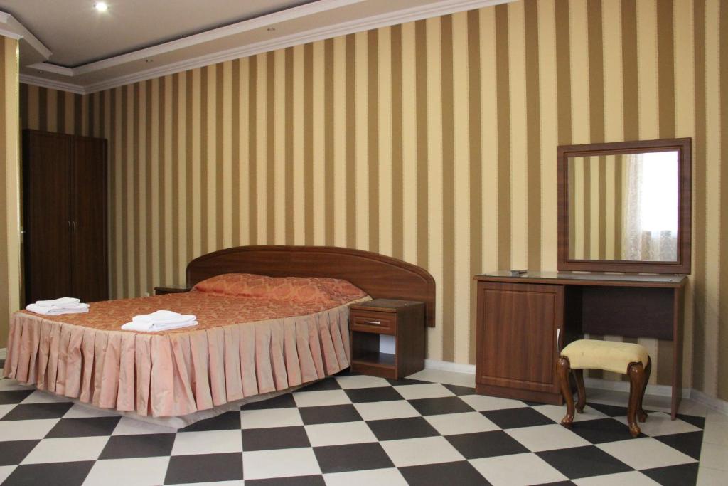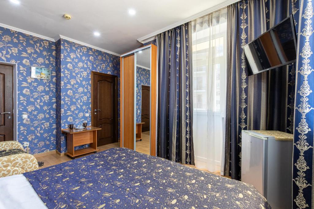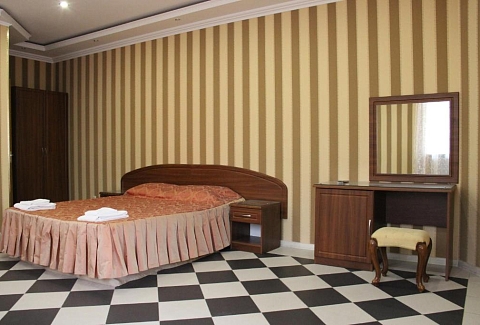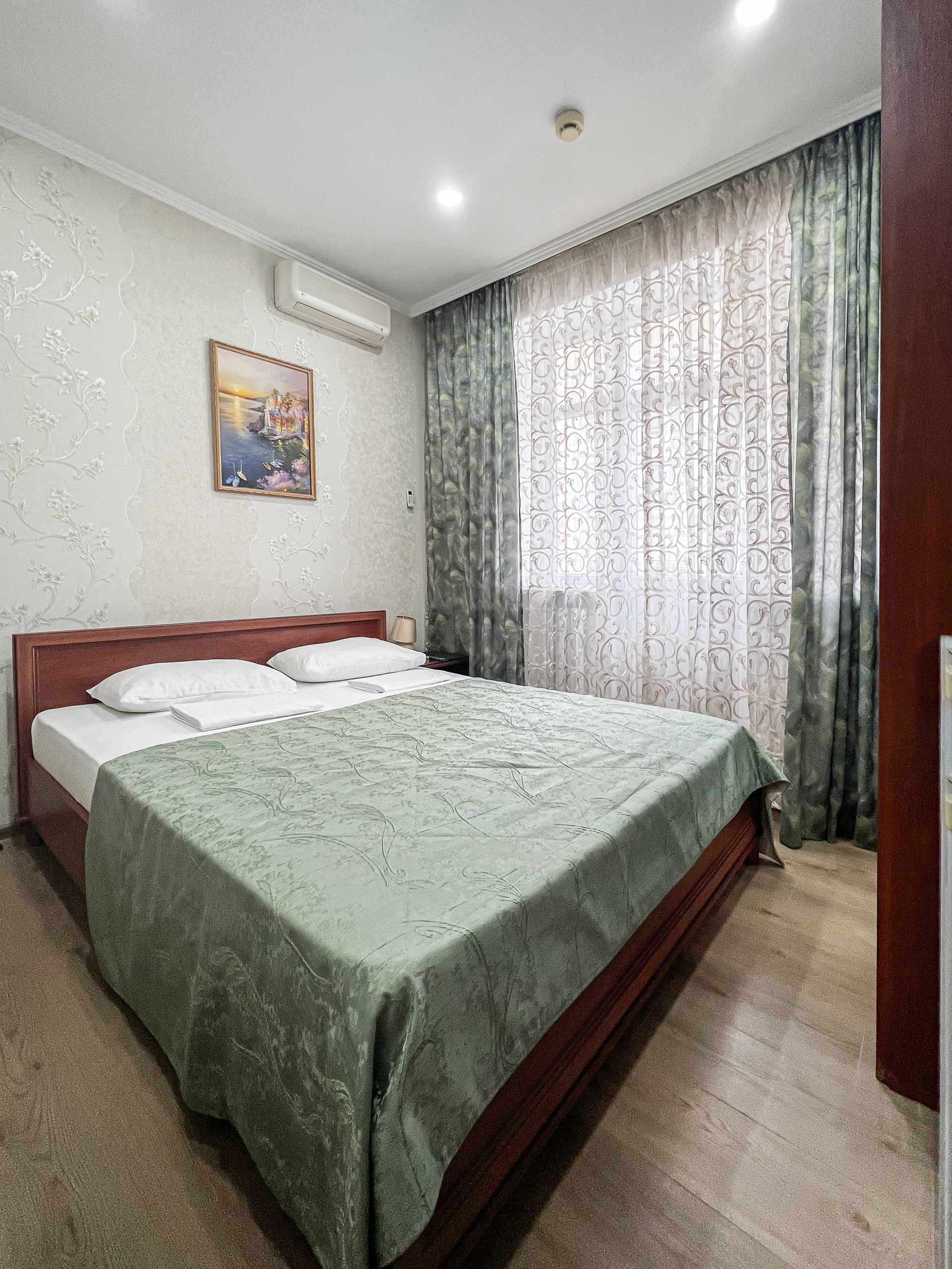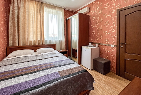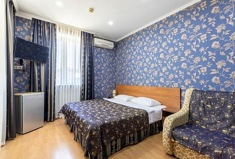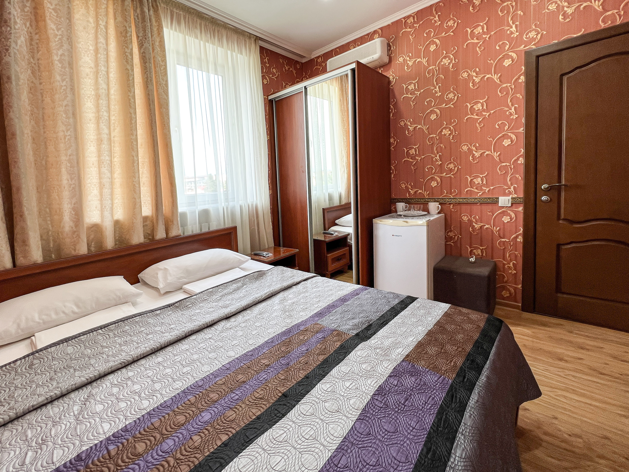 В номере: вешалка, зеркало, кровать двуспальная, прикроватные тумбочки, стол, стулья, шкаф, кондиционер, мини-холодильник, телевизор