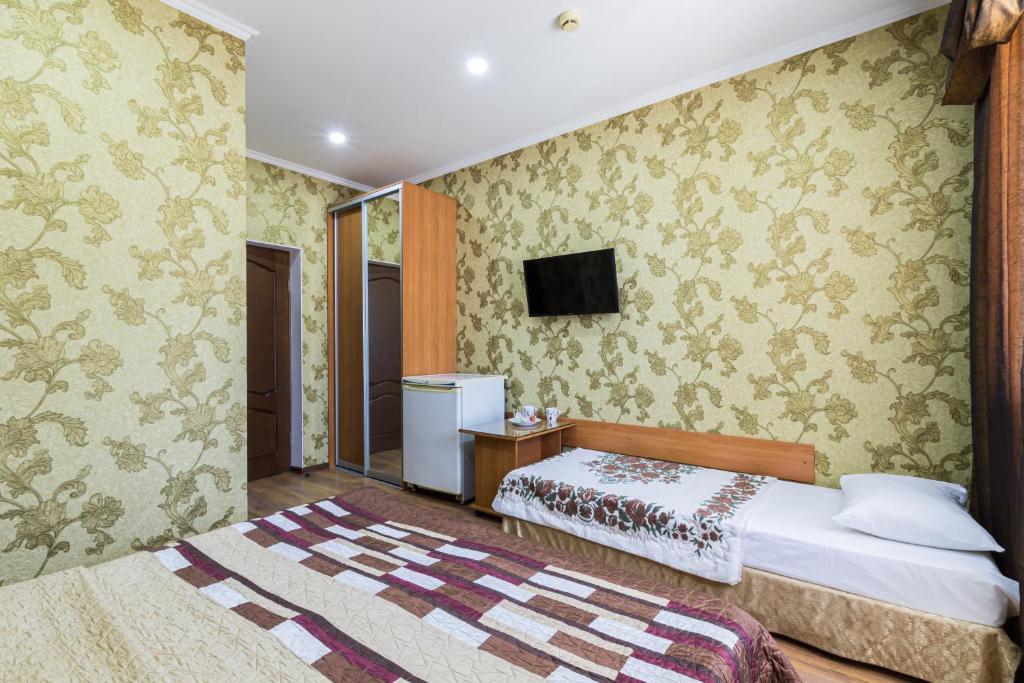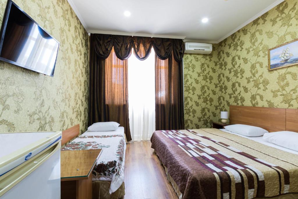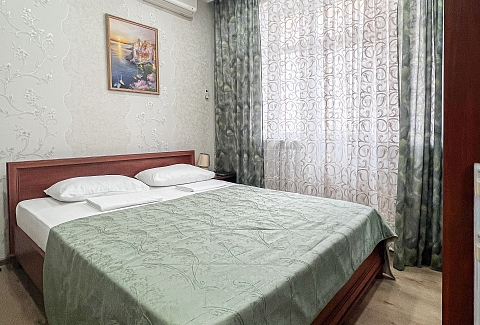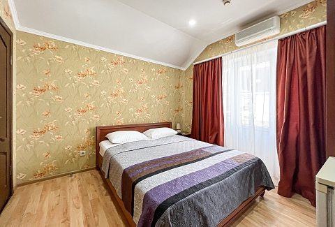 В номере: вешалка, зеркало, кровать двуспальная, кровать односпальная, прикроватные тумбочки, стол, стулья, шкаф, кондиционер, мини-холодильник, телевизор