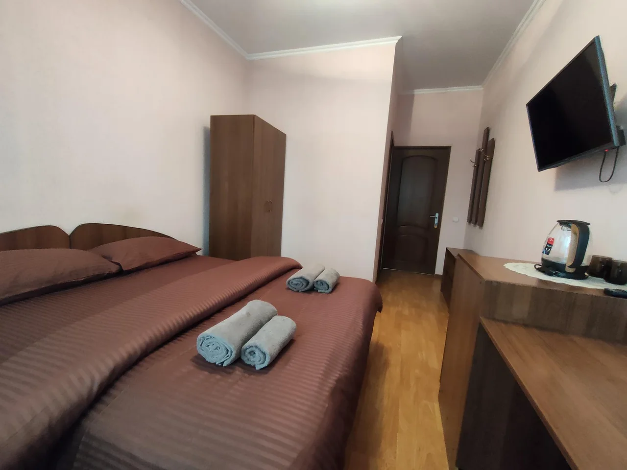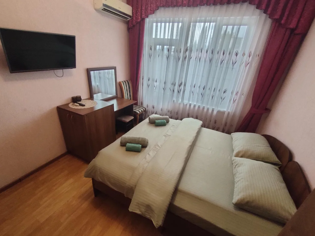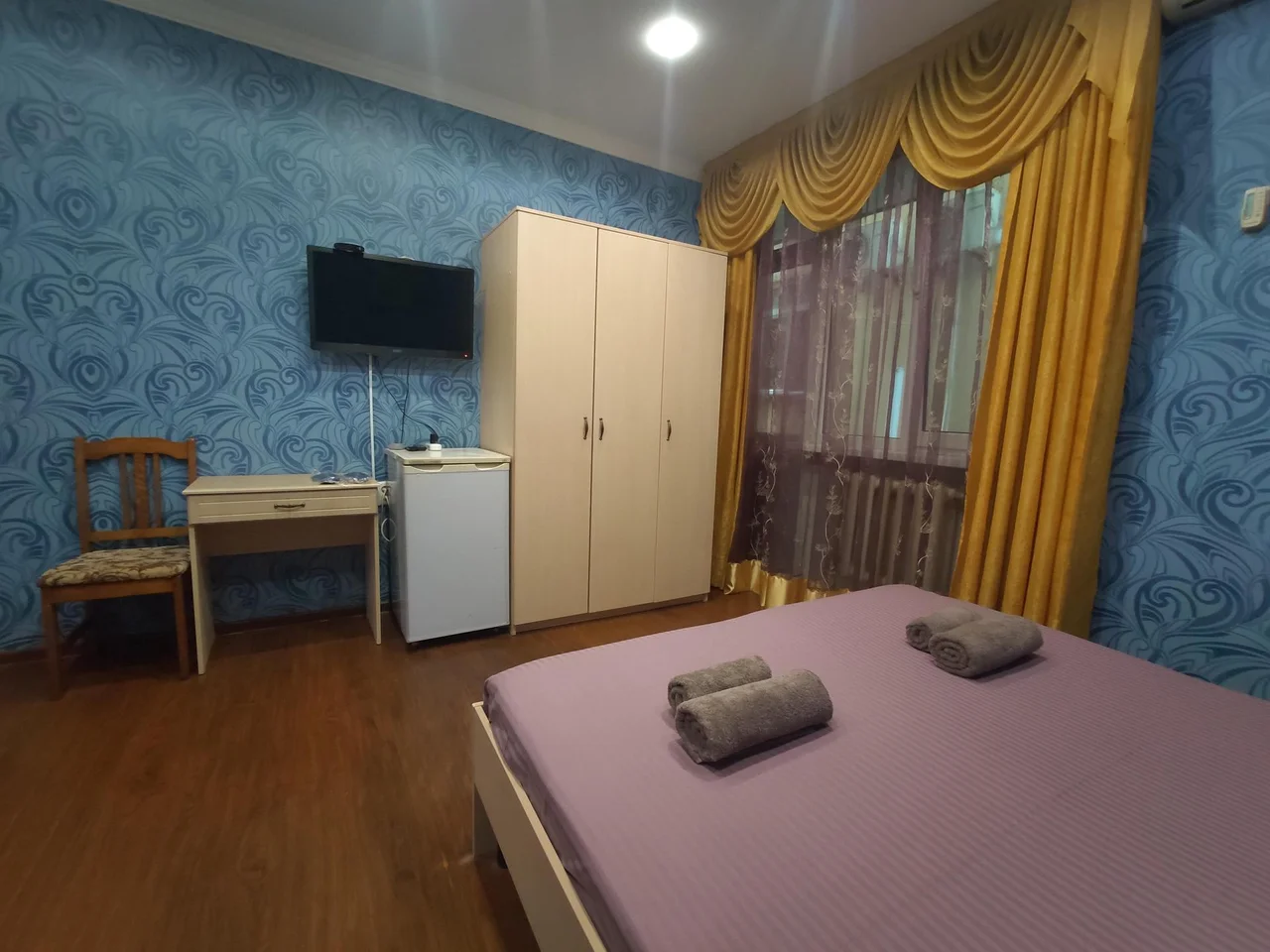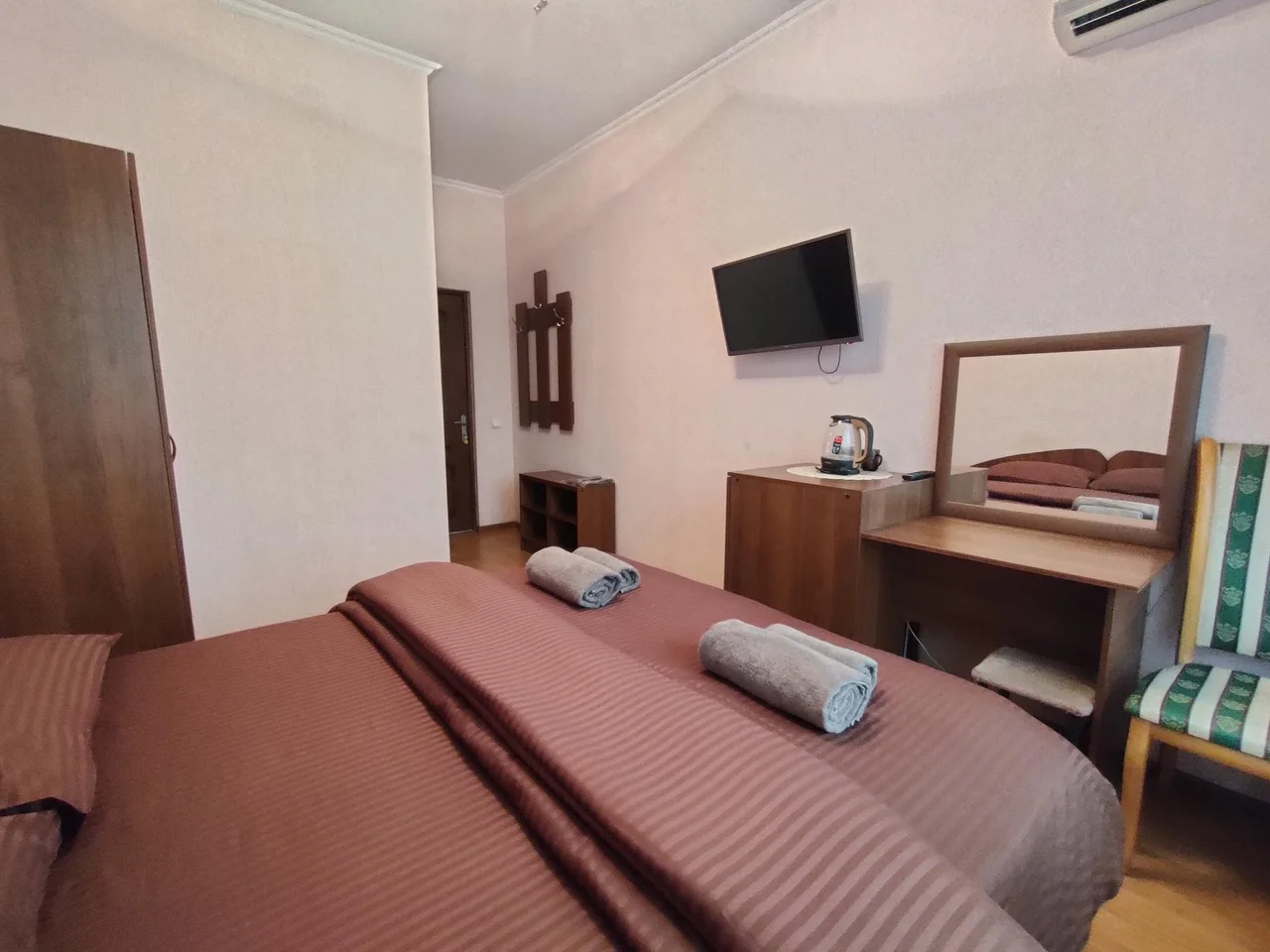 В номере: зеркало, кровать двуспальная, прикроватные тумбочки, шкаф, кондиционер, телевизор, холодильник, электрочайник