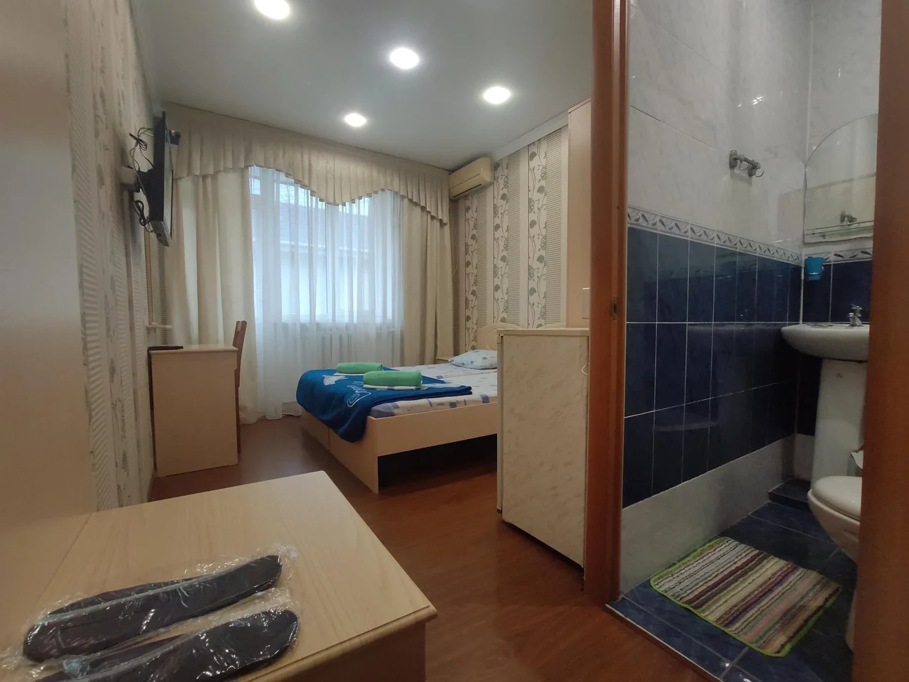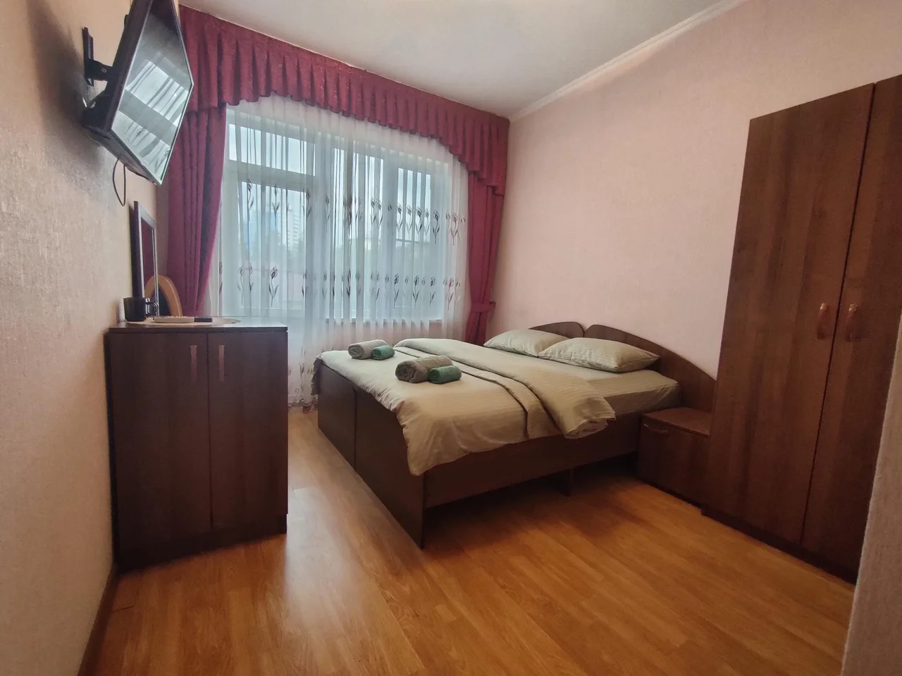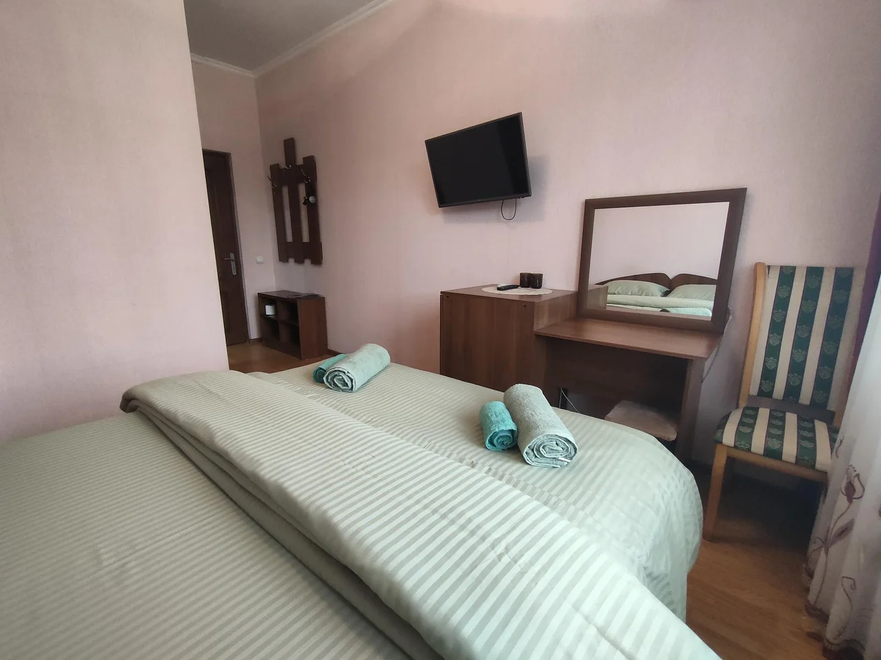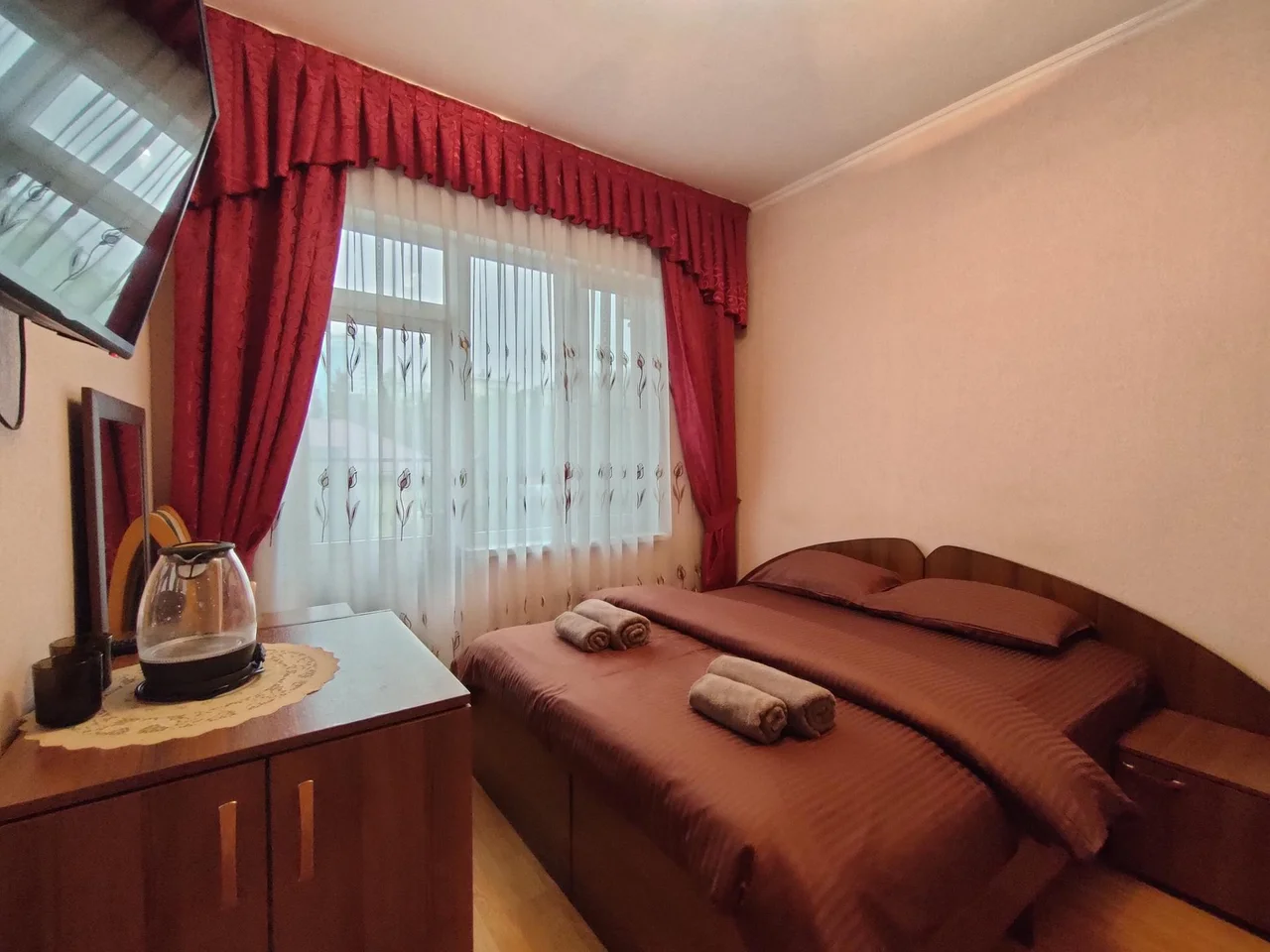 В номере: зеркало, кровать двуспальная, прикроватные тумбочки, шкаф, кондиционер, телевизор, холодильник, электрочайник