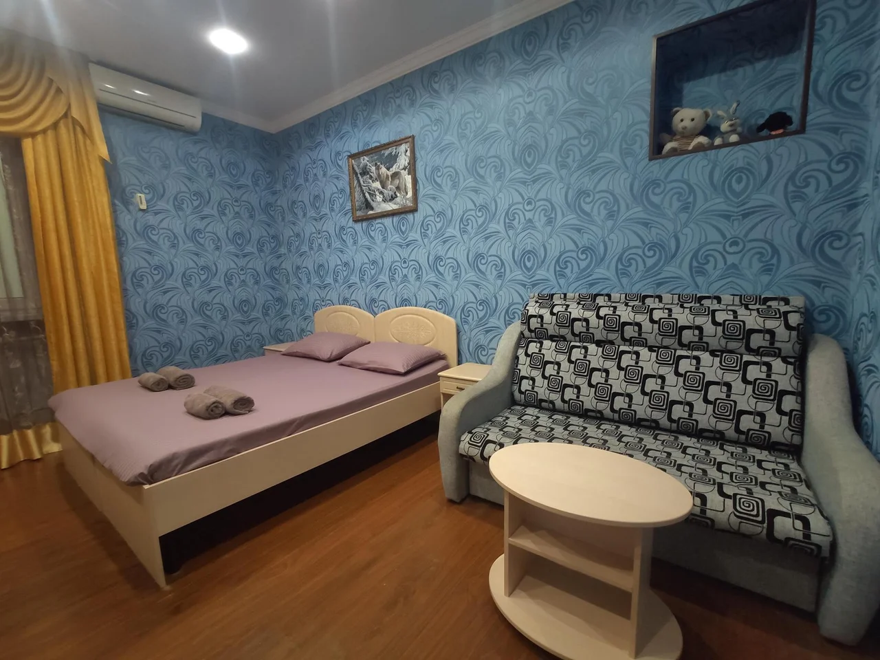 В номере: диван, зеркало, кровать двуспальная, прикроватные тумбочки, шкаф, кондиционер, телевизор, холодильник, электрочайник