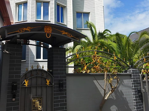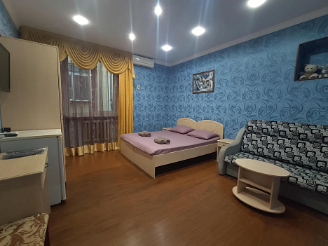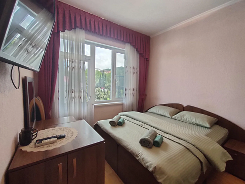 Камерный жилой фонд состоит из 14 номеров с удобствами. В каждом номере все предусмотрено для комфортного пребывания: есть санузел c душевой кабиной, фен, кондиционер, холодильник, телевизор. На каждом этаже оборудована гладильная зона с доской и утюгом, а на первом установлена стиральная машина для самостоятельного пользования.На территории гостевого дома ежедневно работает пиццерия, действует кафе-столовая, где гости смогут, не выходя за территорию гостевого дома, заказать вкусные завтраки, обеды и ужины. Есть уютная зона отдыха рядом с искусственным водопадом под настоящими пальмами. В числе прочих услуг – круглосуточный репесепшн, беспроводной интернет и автопарковка.Всего за 5 минут спокойным шагом можно дойти до галечного оборудованного пляжа.