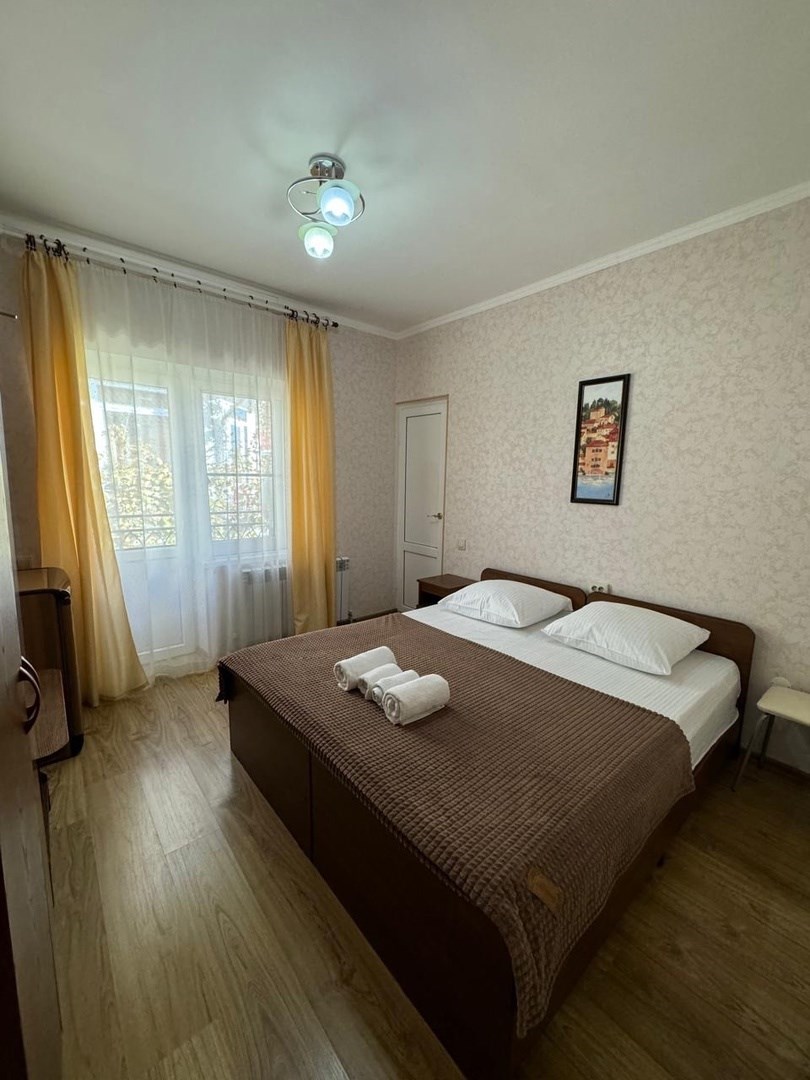 В нем расположено 16 номеров. С верхних этажей открывается великолепный вид на море и окрестности. Гостям предлагаются номера на 2 или 3 человека с кроватями, кондиционером, шкафом и телевизором. В комнатах есть чистое постельное белье и полотенца, средства гигиены, Wi-Fi. На этаже отдыхающие найдут утюг, гладильную доску и стиральную машину. В каждом номере предусмотрен холодильник и чайная станция. Гости могут готовить еду на общей кухне. На территории гостиницы есть автомобильная парковка и небольшой плавательный бассейн. Ближайший галечный пляж находится в 1 километре, оборудован всей необходимой инфраструктурой для комфортного отдыха.