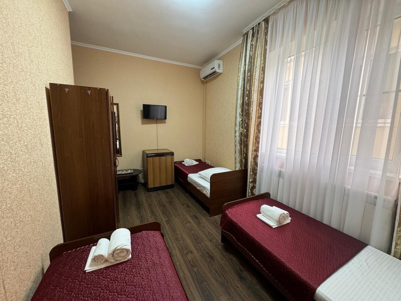 В номере: зеркало, кровати односпальные, шкаф, кондиционер, мини-холодильник, телевизор