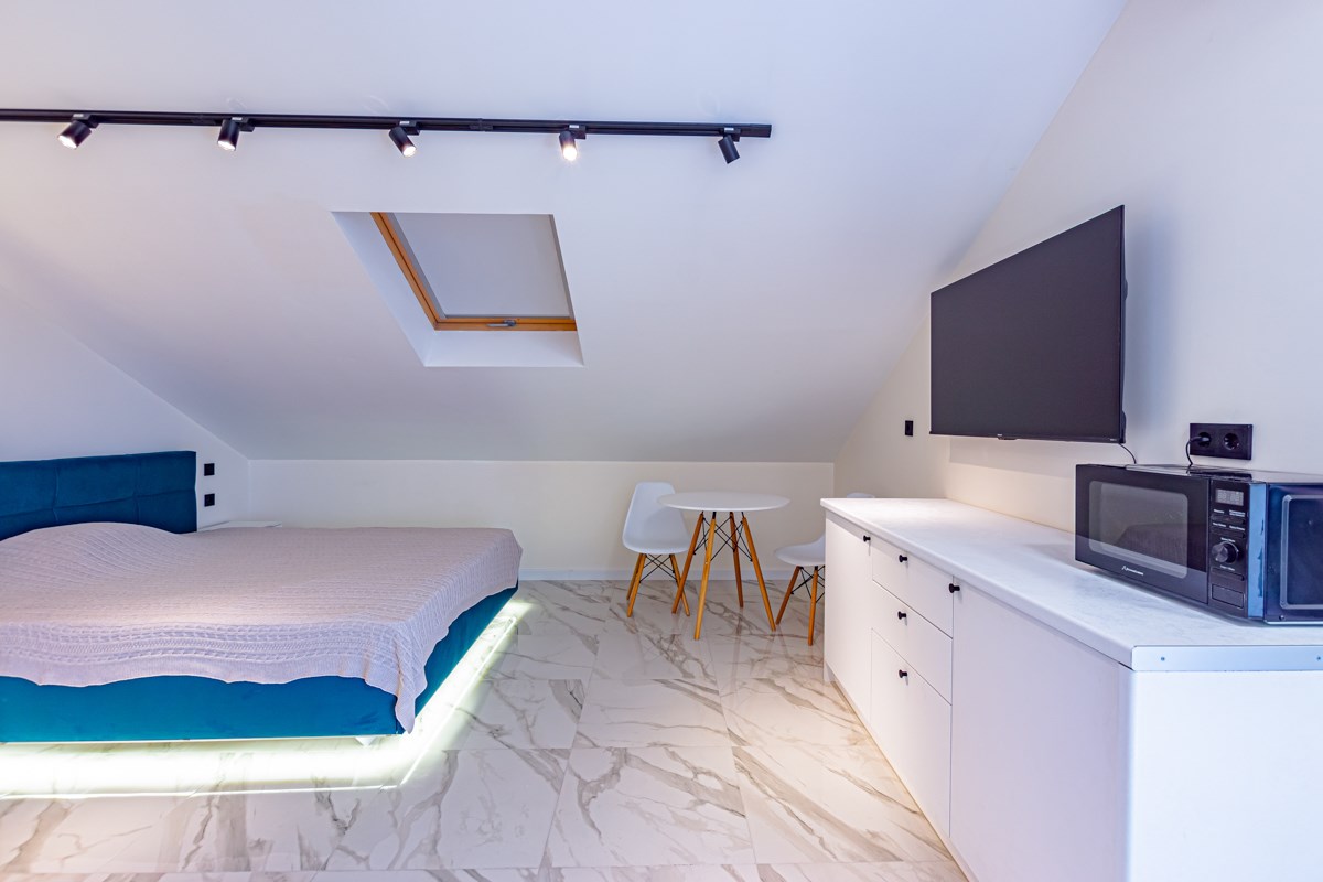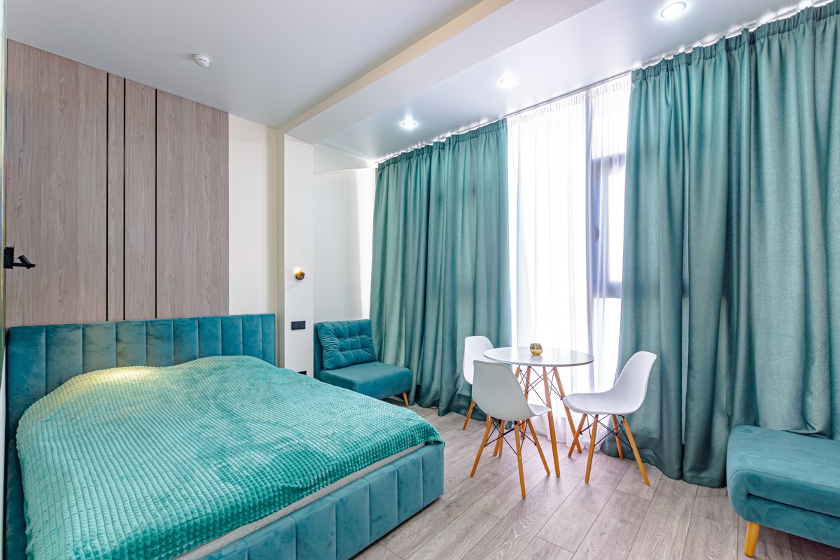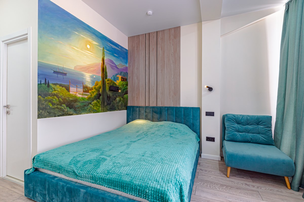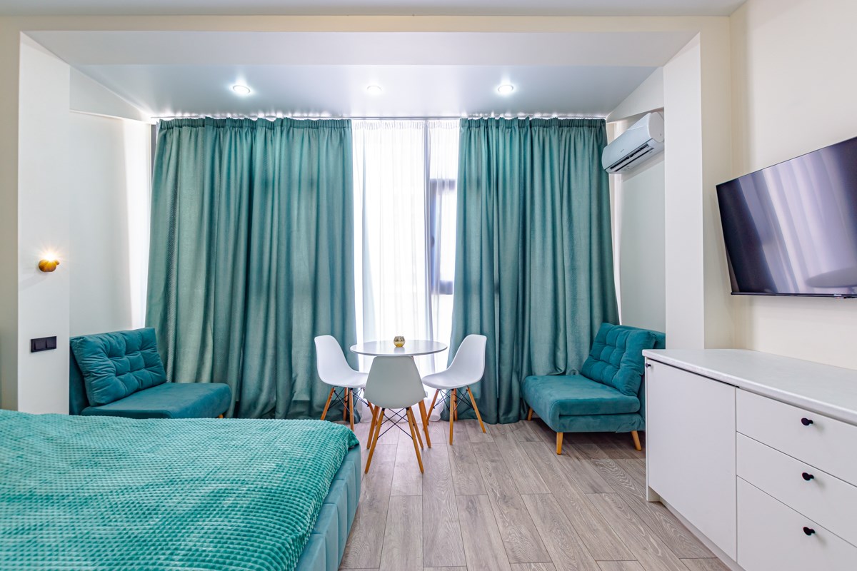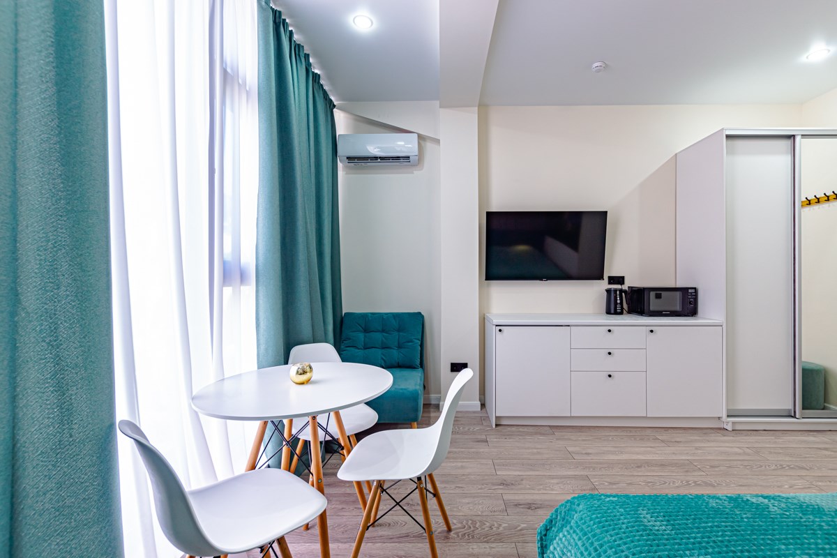В номере: вешалка, зеркало, кресло-кровать, кровать двуспальная, стол, стулья, шкаф, микроволновая печь, набор посуды, телевизор ЖК, утюг, холодильник, чайник