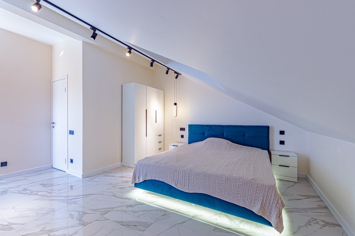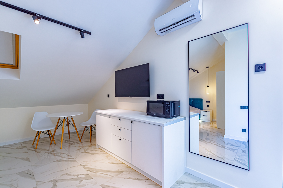 В номере: зеркало, кровать двуспальная, прикроватные тумбочки, стол, стулья, шкаф, микроволновая печь, набор посуды, сплит-система, телевизор, утюг, холодильник, чайник