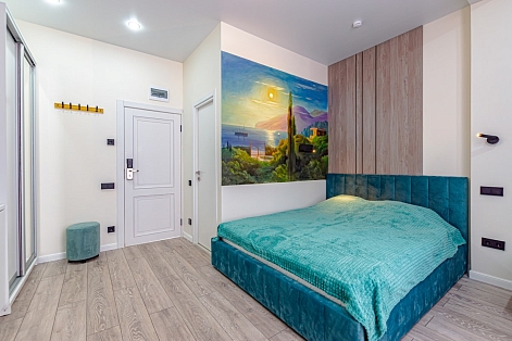 В номере: вешалка, диван раскладной, зеркало, кровать двуспальная, прикроватные тумбочки, стол, столик туалетный, стулья, шкаф, микроволновая печь, набор посуды, телевизор ЖК, утюг, холодильник, чайник