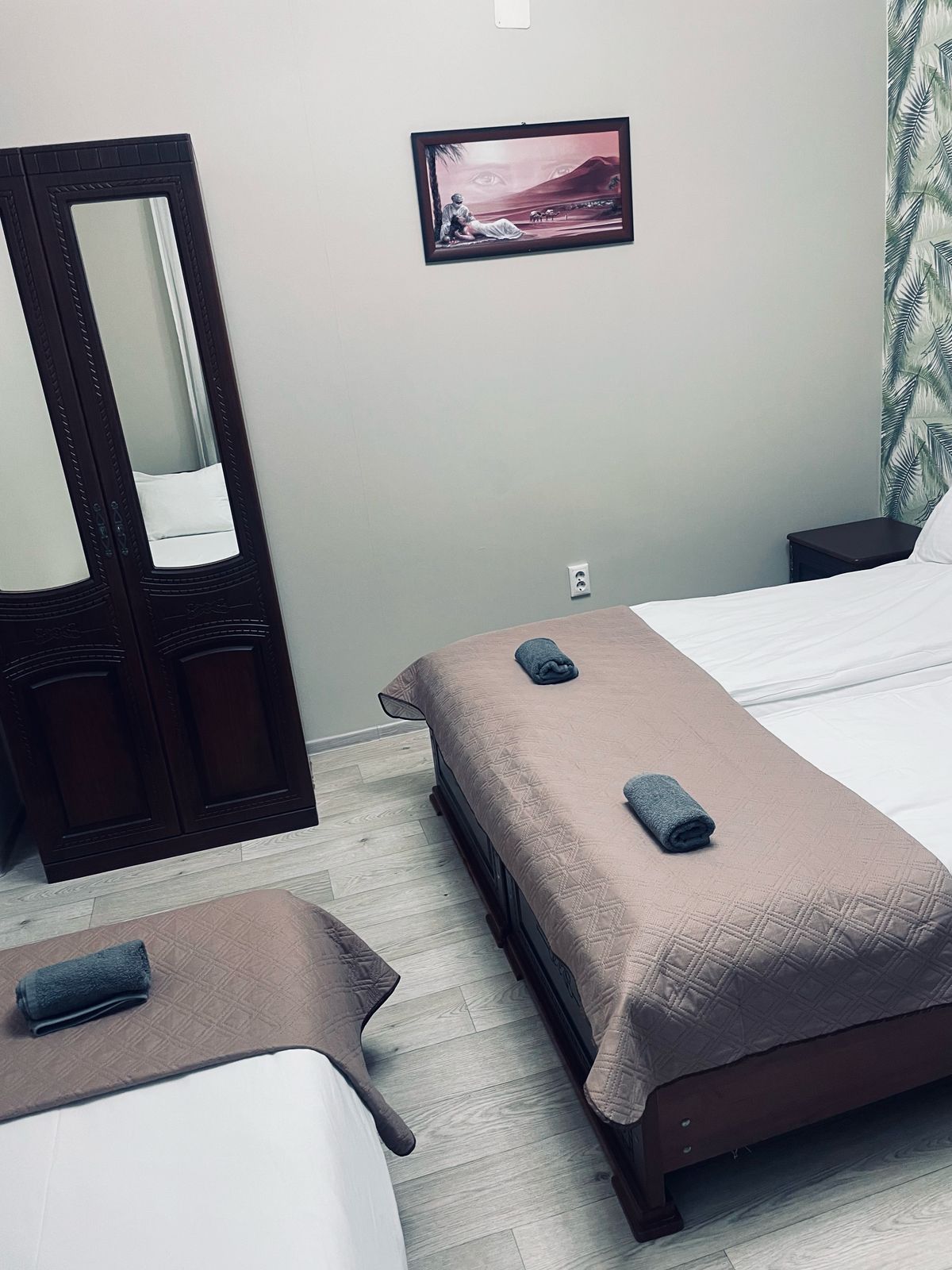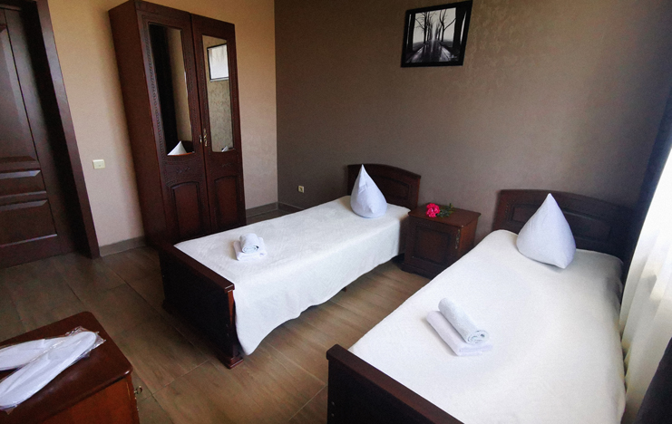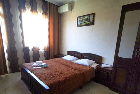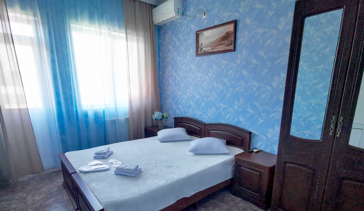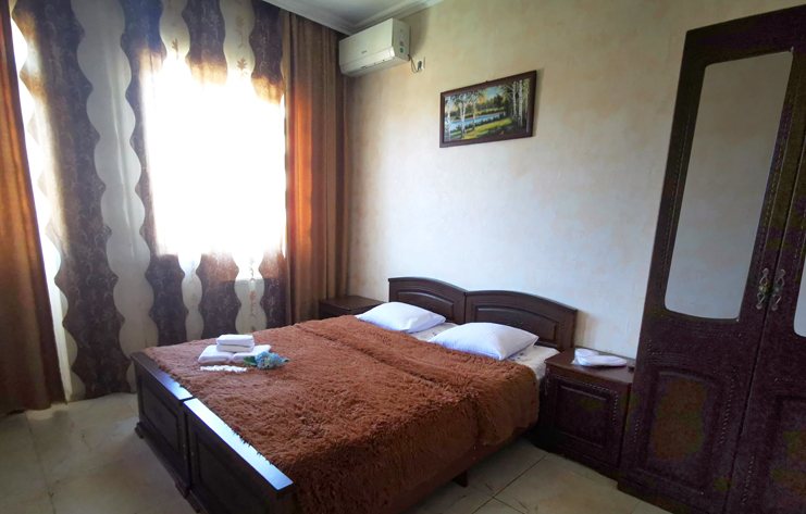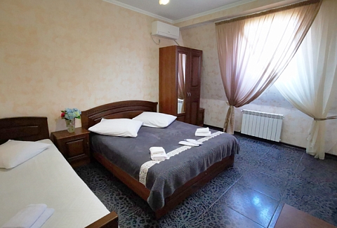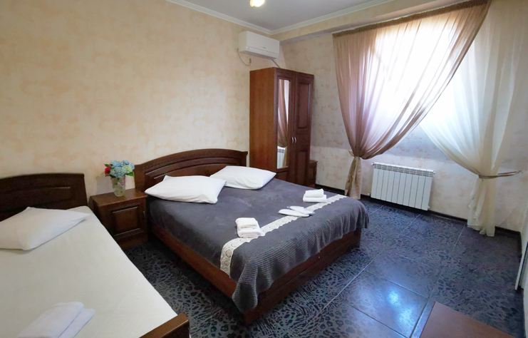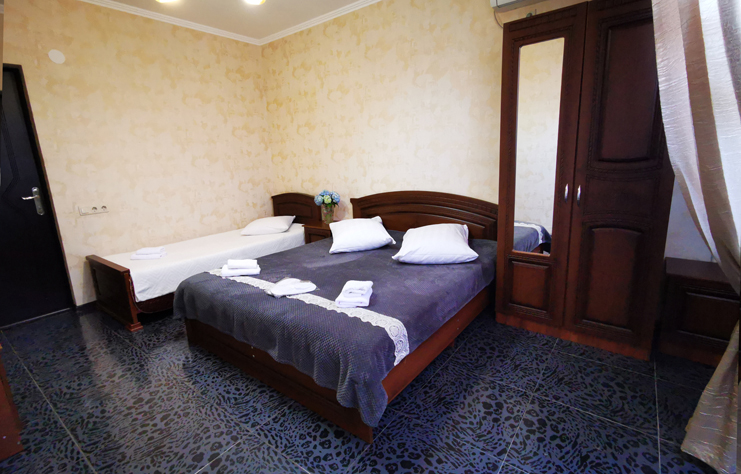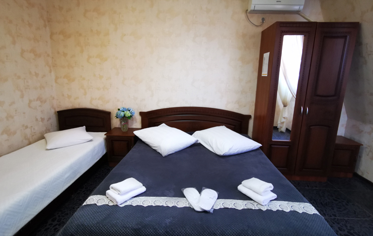 В номере: вешалка, зеркало, кровать двуспальная, кровать односпальная, прикроватные тумбочки, стол, стулья, шкаф, кондиционер, телевизор
