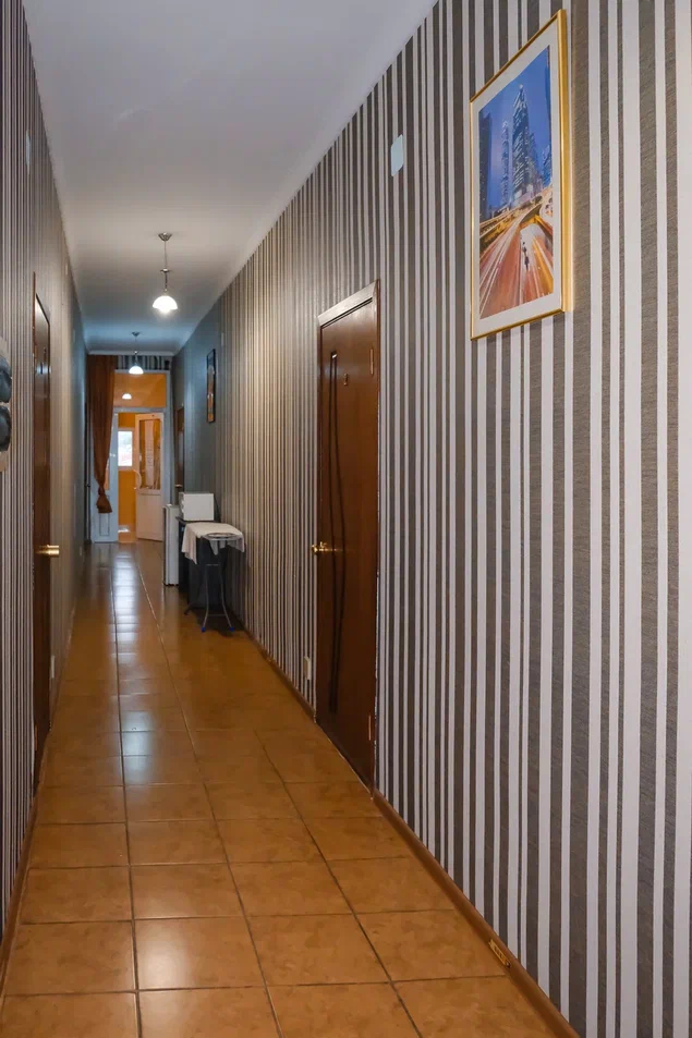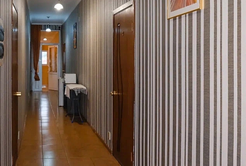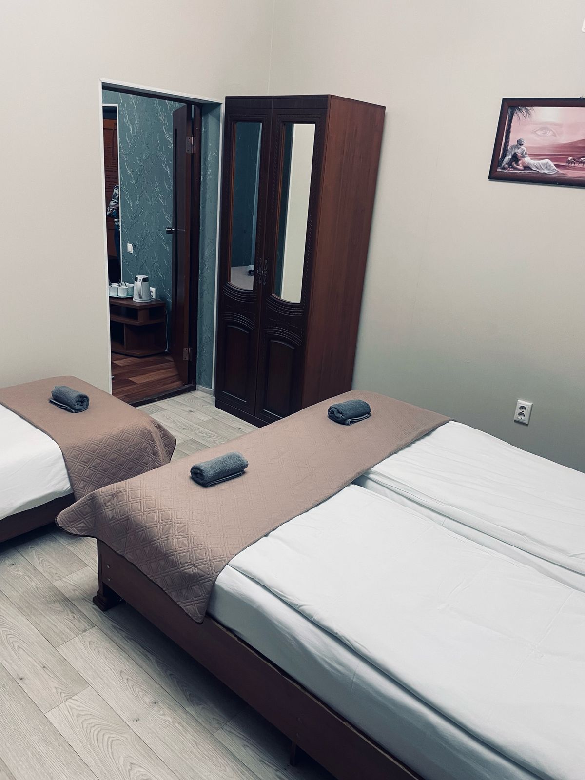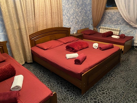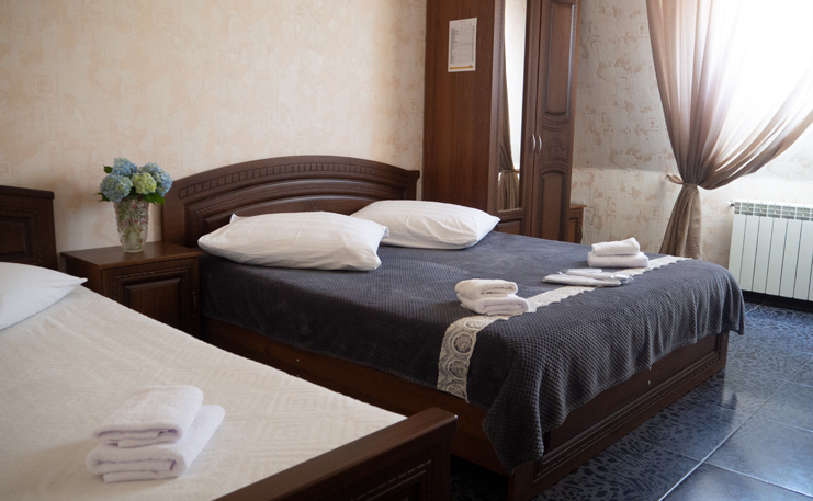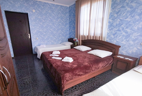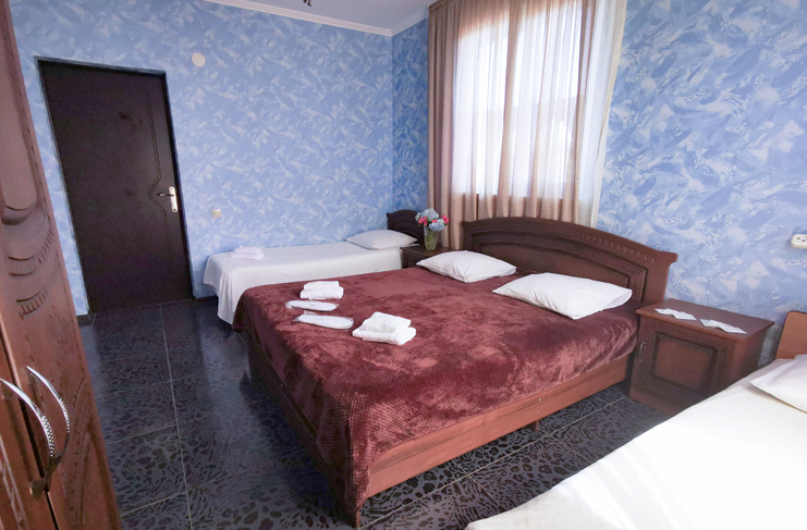 В номере: вешалка, зеркало, кровати односпальные, кровать двуспальная, прикроватные тумбочки, стол, стулья, шкаф, кондиционер, телевизор, холодильник
