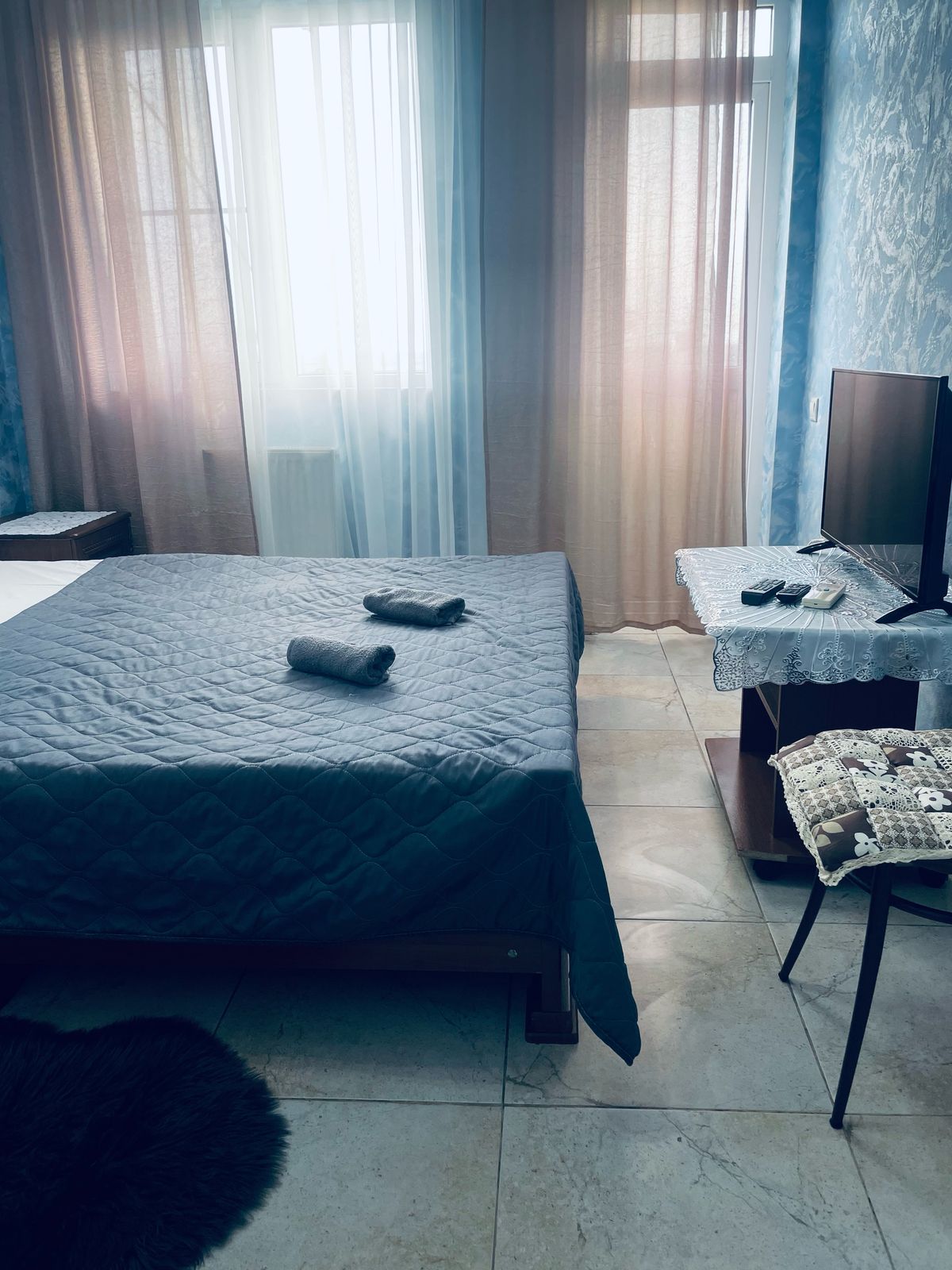 В номере: вешалка, зеркало, кровати односпальные /одна двуспальная кровать, прикроватные тумбочки, раскладушка, стол, стулья, шкаф, кондиционер, телевизор