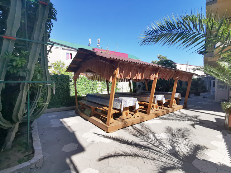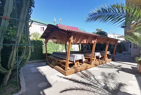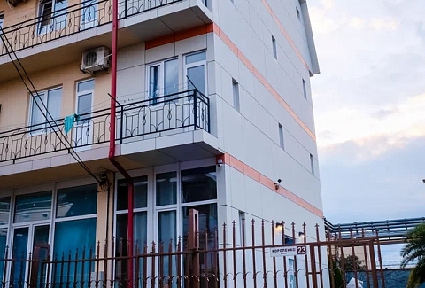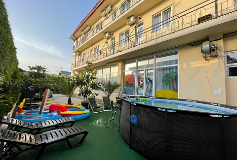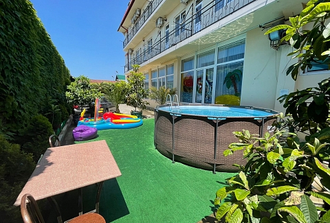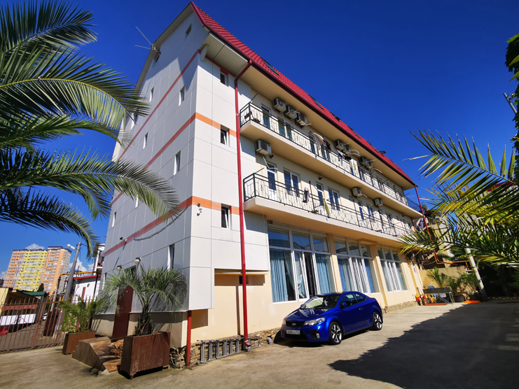 Трехэтажный корпус отеля занимает закрытую территорию с небольшим внутренним двориком. Гостей ожидают номера Стандарт или Семейный — жилой фонд рассчитан на 90 человек. В каждом номере есть собственный санузел с косметическими принадлежностями, кондиционер, телевизор, холодильник и меблированный балкон. При отеле работают столовая, кафе и бар, где отдыхающие могут заказать себе комплексное питание, перекусить в течение дня или просто выпить чашку кофе. Для автовладельцев возле корпуса организована парковка, на всей территории хорошо ловит сеть wi-fi, По вечерам в отеле проводятся концерты, кинопоказы, анимационные мероприятия, работает караоке. В 10 минутах езды от отеля находится мелко-галечный пляж. Пляж оснащен медицинским и спасательным постами, кабинками для переодевания., предусмотрен прокат шезлонгов и лежаков, на побережье работают бары и кафе.