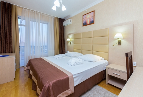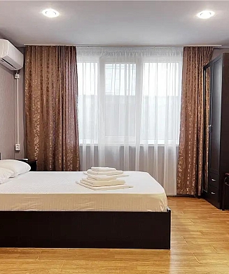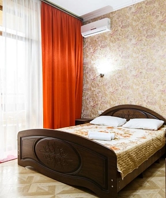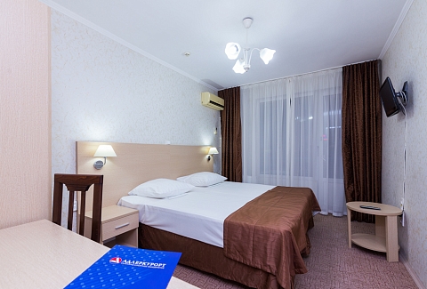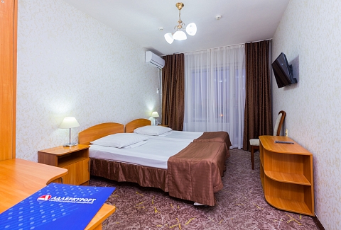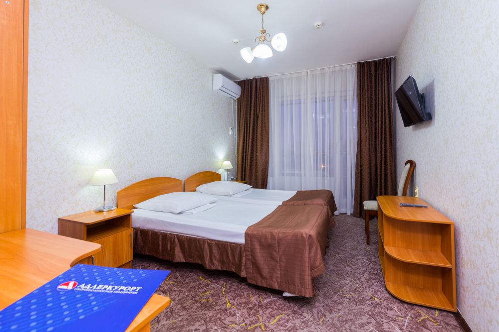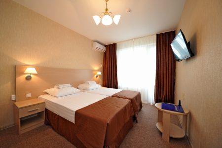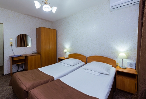 В номере: вешалка, зеркало, кровати односпальные /одна двуспальная кровать, прикроватные тумбочки, стол, стулья, шкаф, сплит-система, телевизор, телефон, холодильник