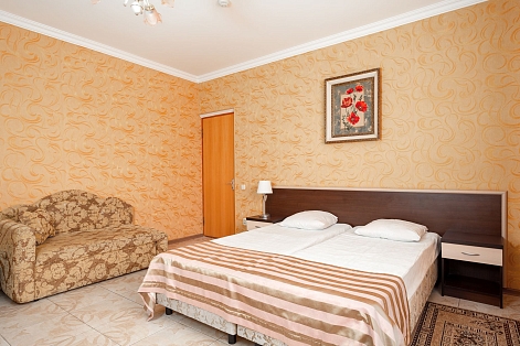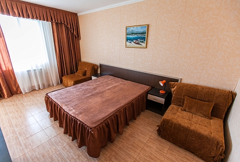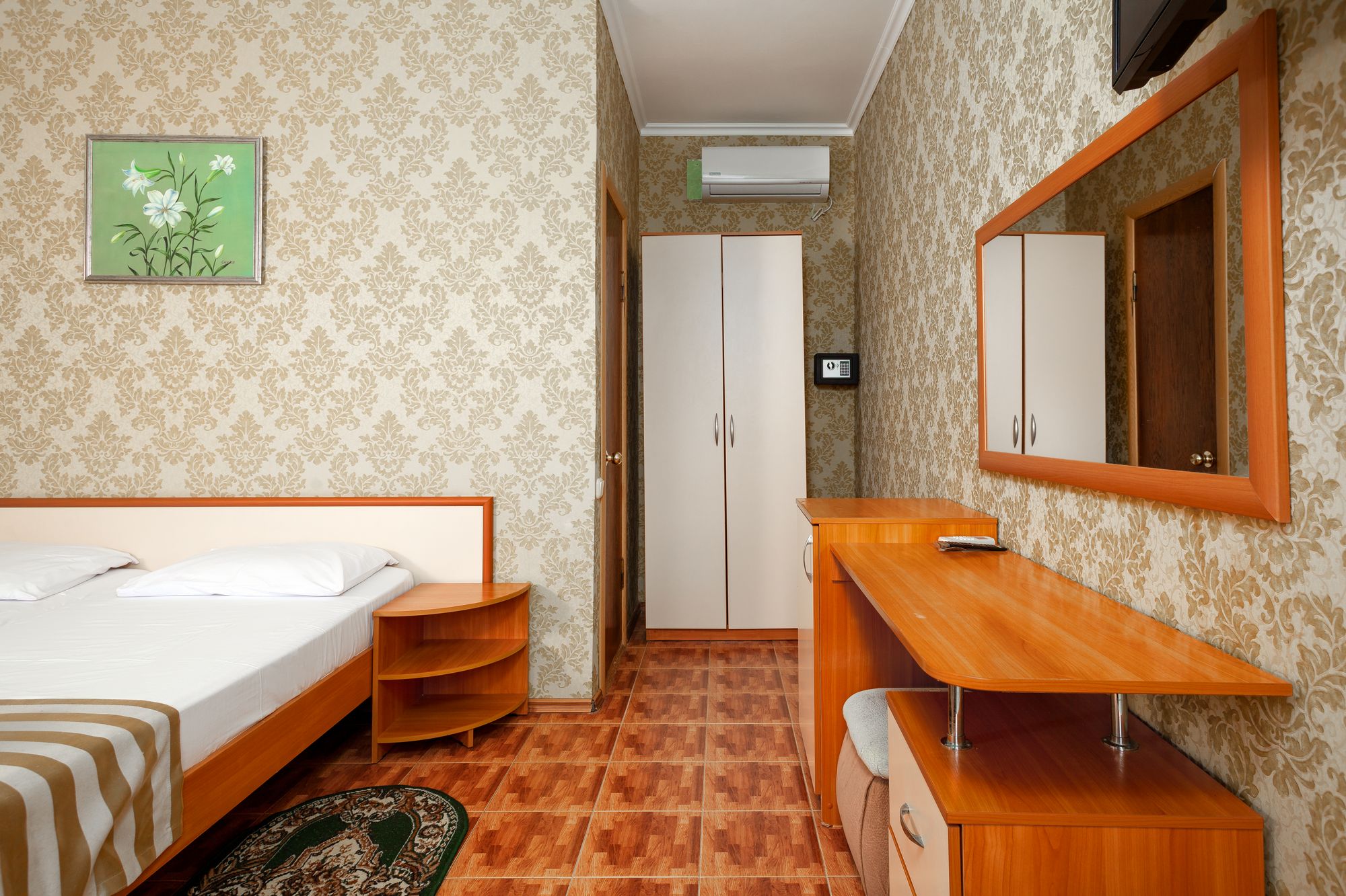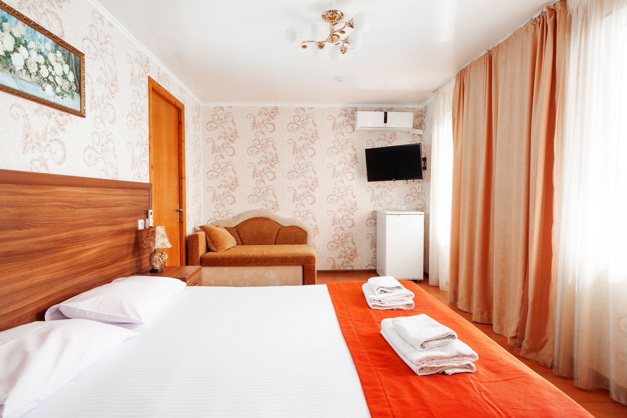 В номере: зеркало, кровать двуспальная, прикроватные тумбочки, стол, шкаф, кондиционер, мини-холодильник, набор посуды, сейф, телевизор