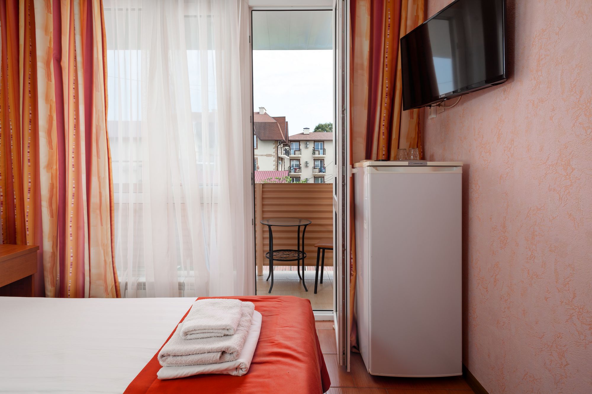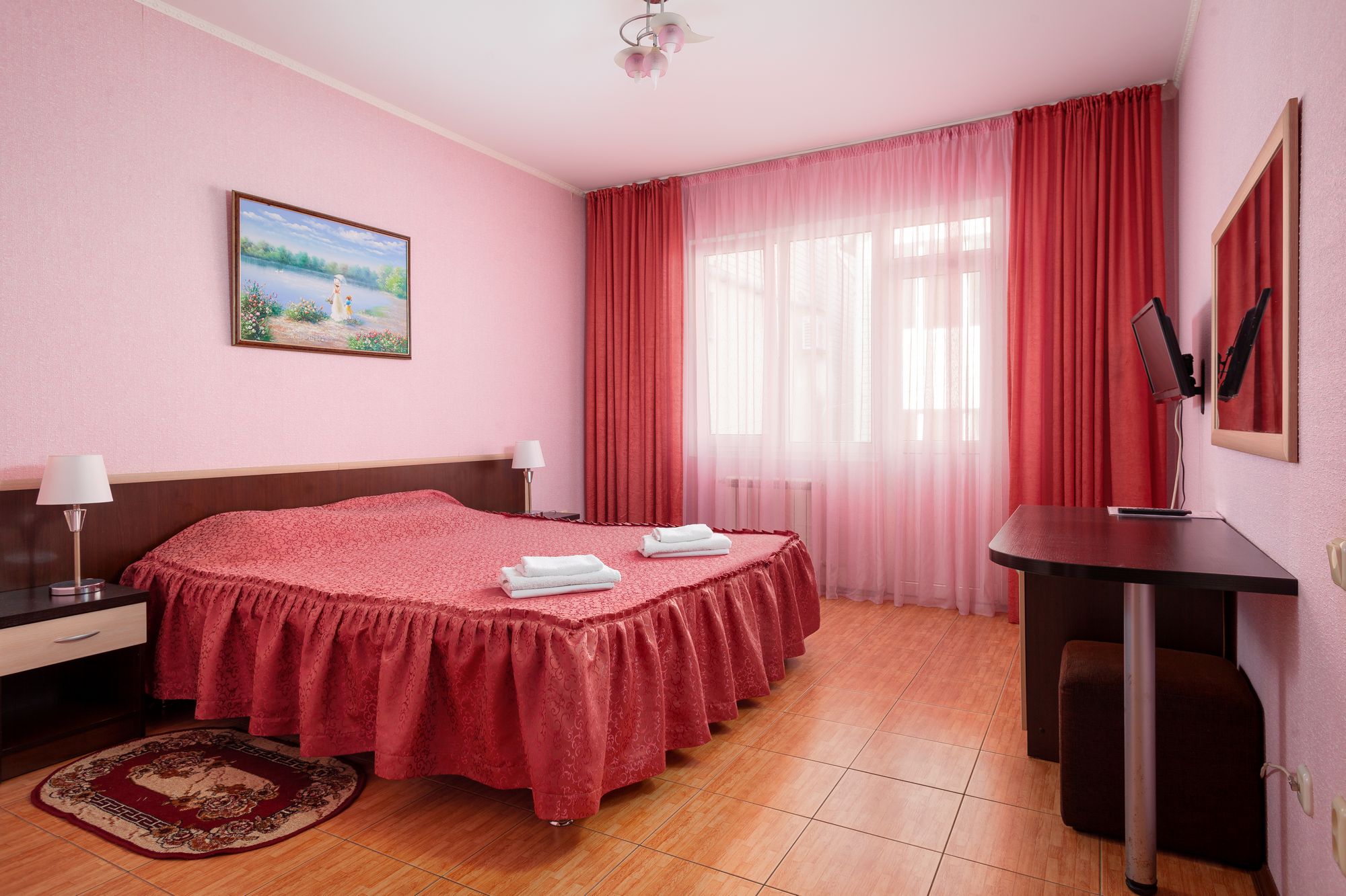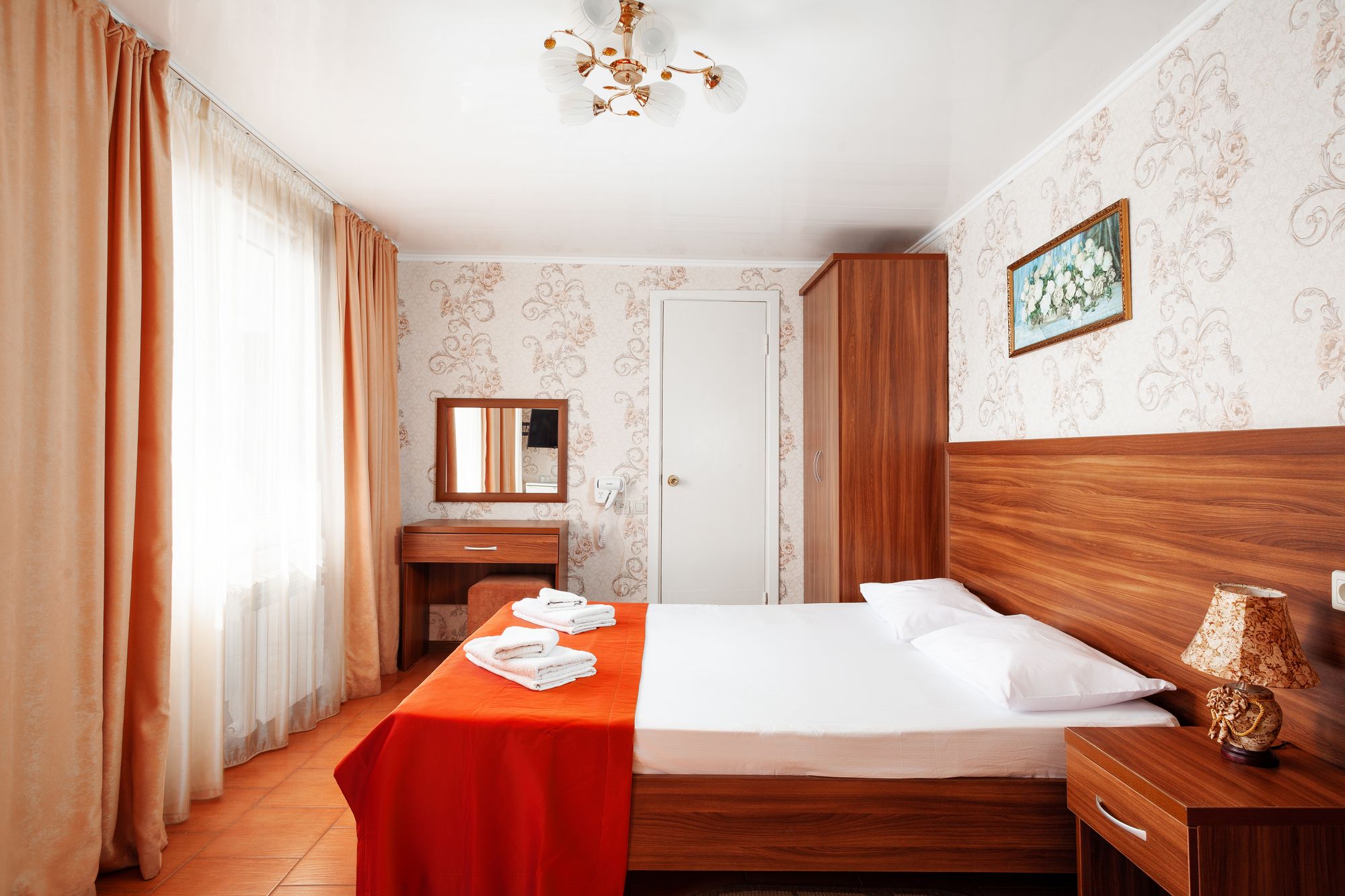 В номере: зеркало, кровать двуспальная, прикроватные тумбочки, стол, шкаф, кондиционер, мини-холодильник, набор посуды, сейф, телевизор