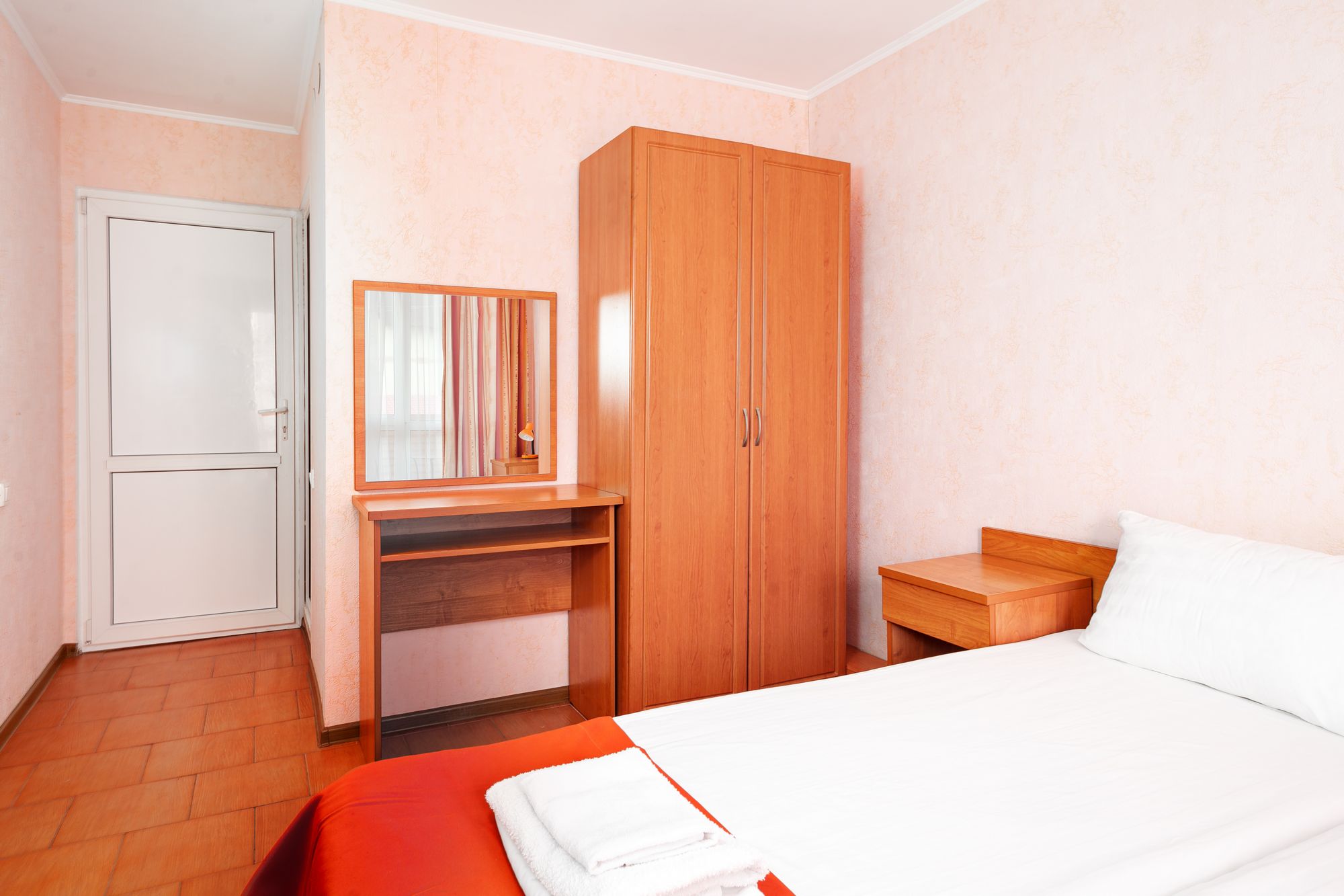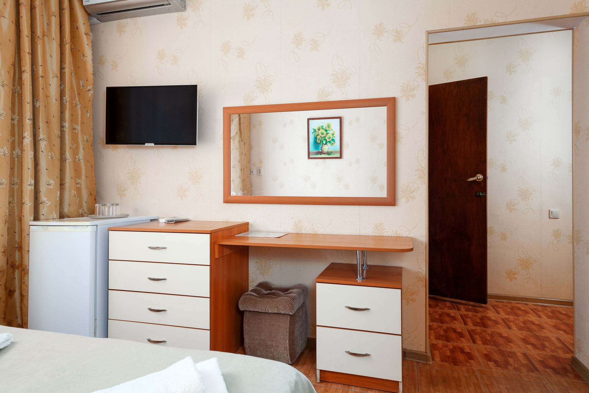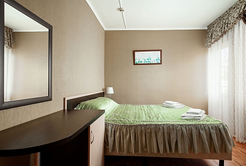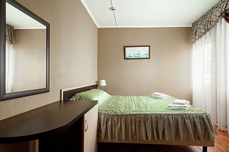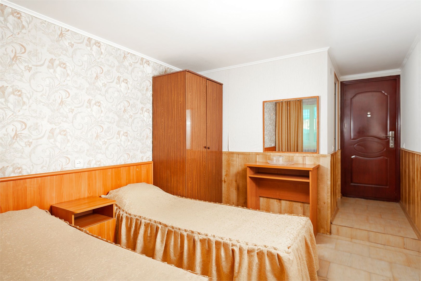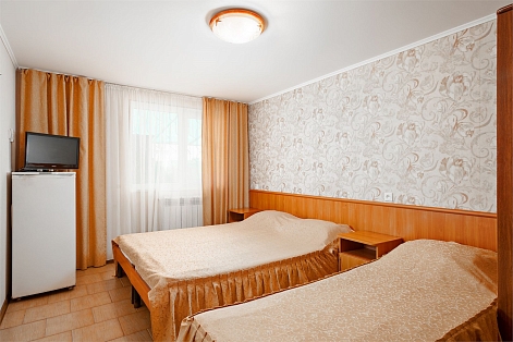 В номере: зеркало, кровати односпальные, прикроватные тумбочки, столик туалетный, шкаф, набор посуды, телевизор, холодильник