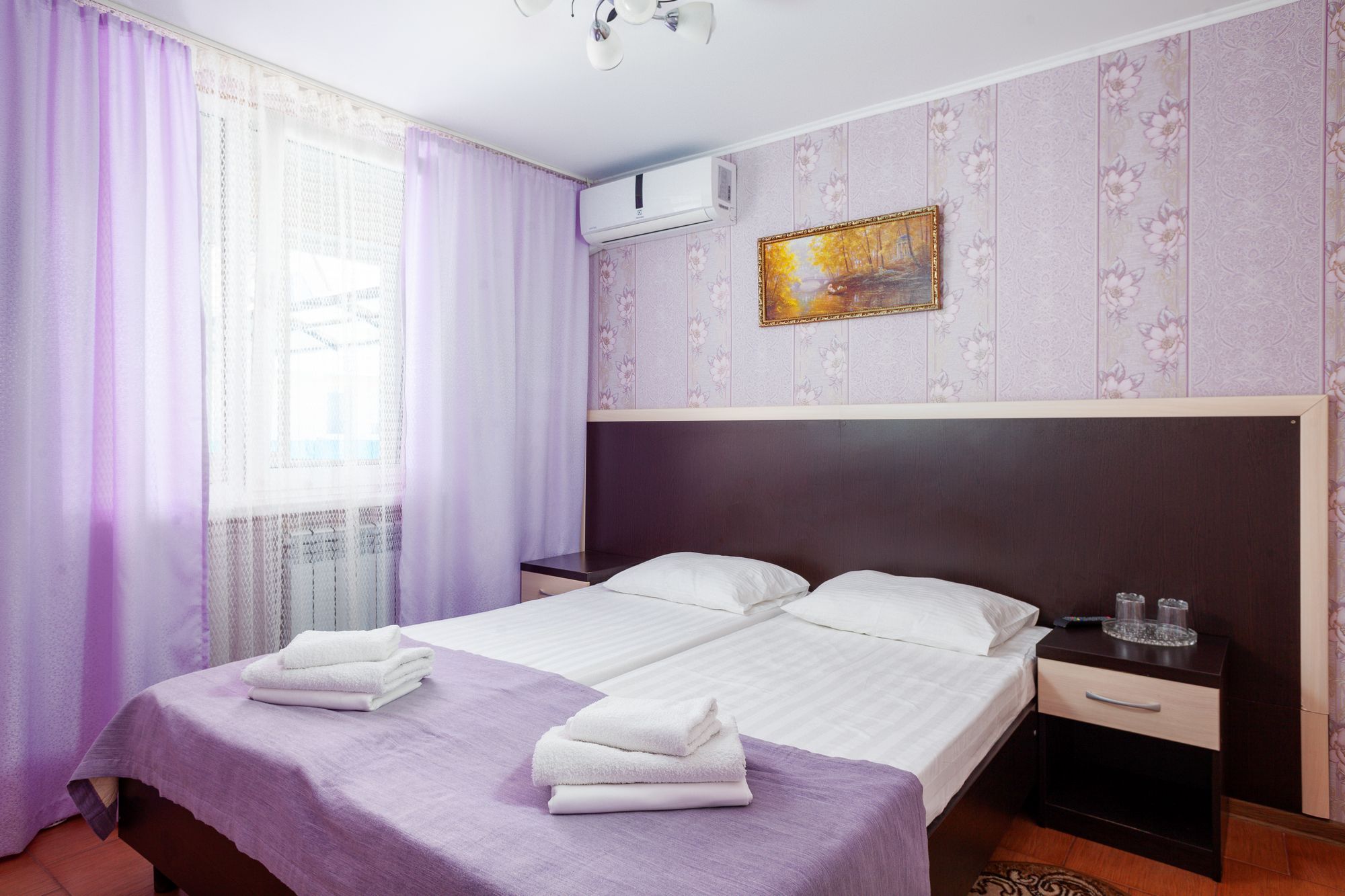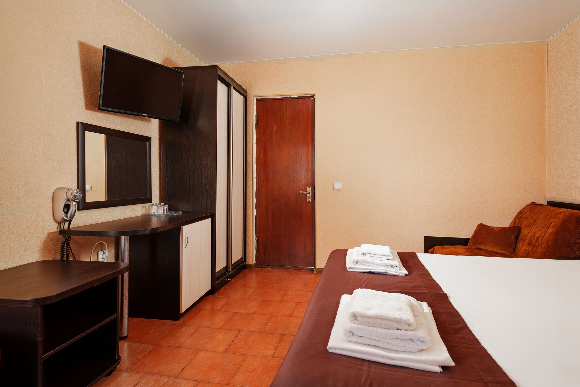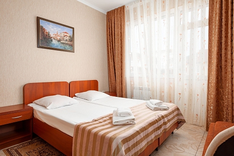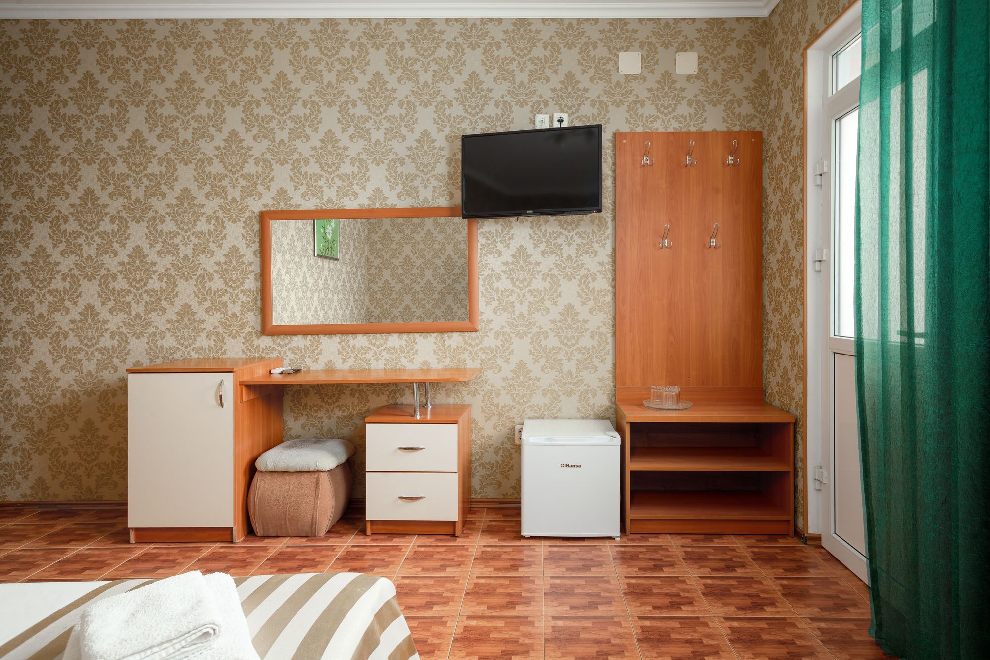 В номере: зеркало, кровати односпальные, прикроватные тумбочки, столик туалетный, шкаф, набор посуды, телевизор, холодильник