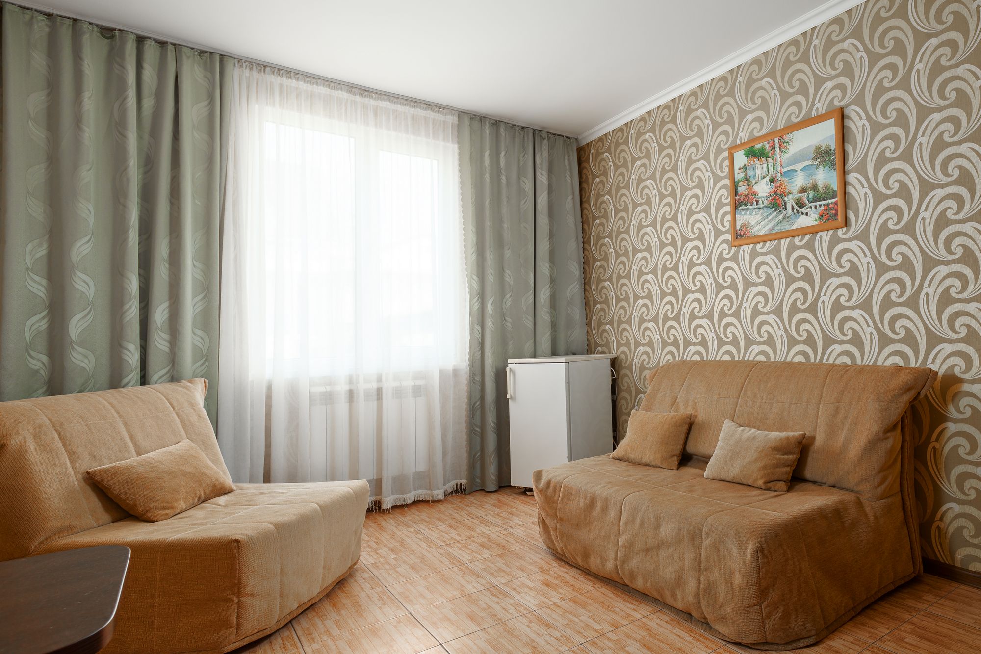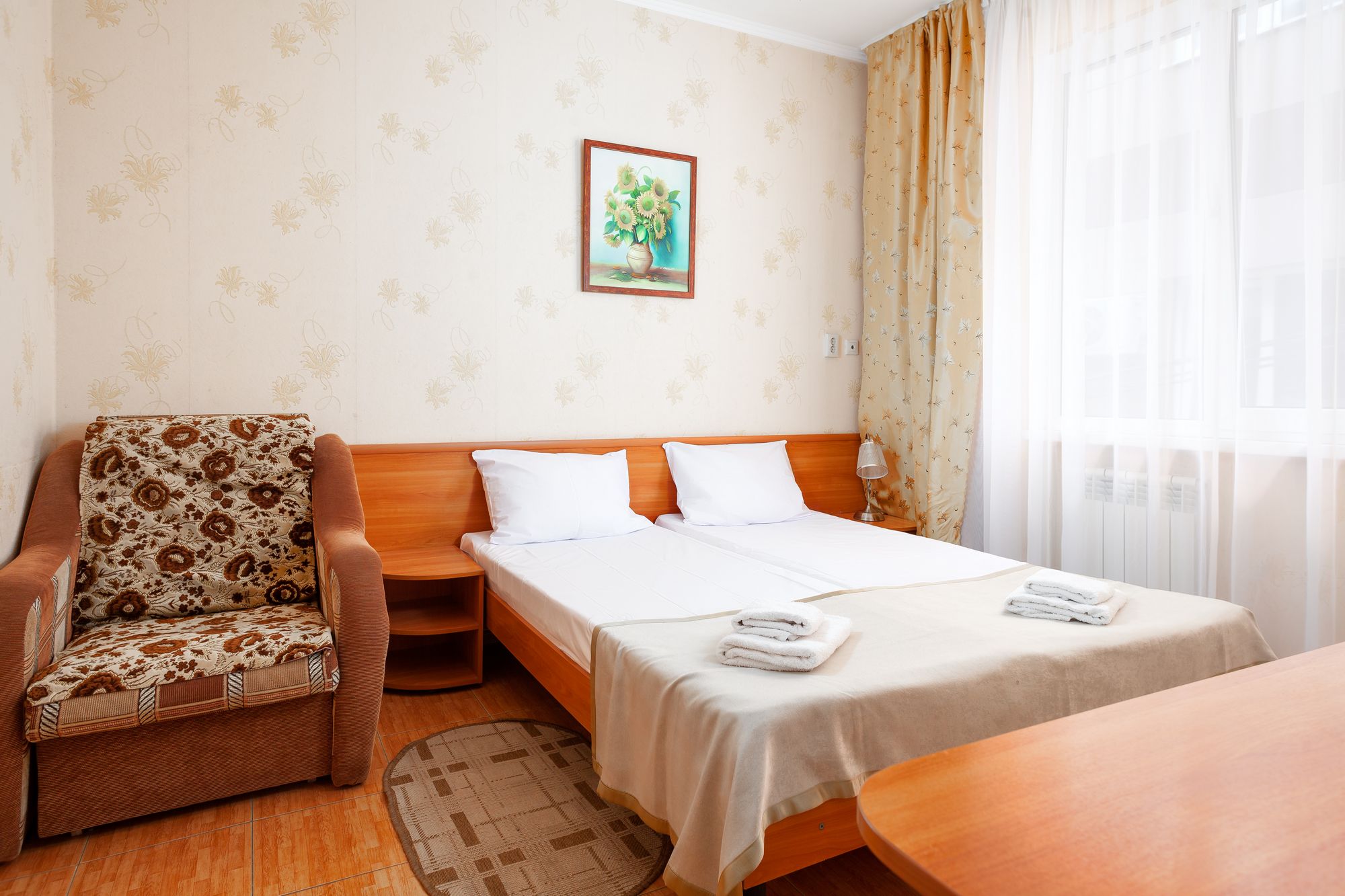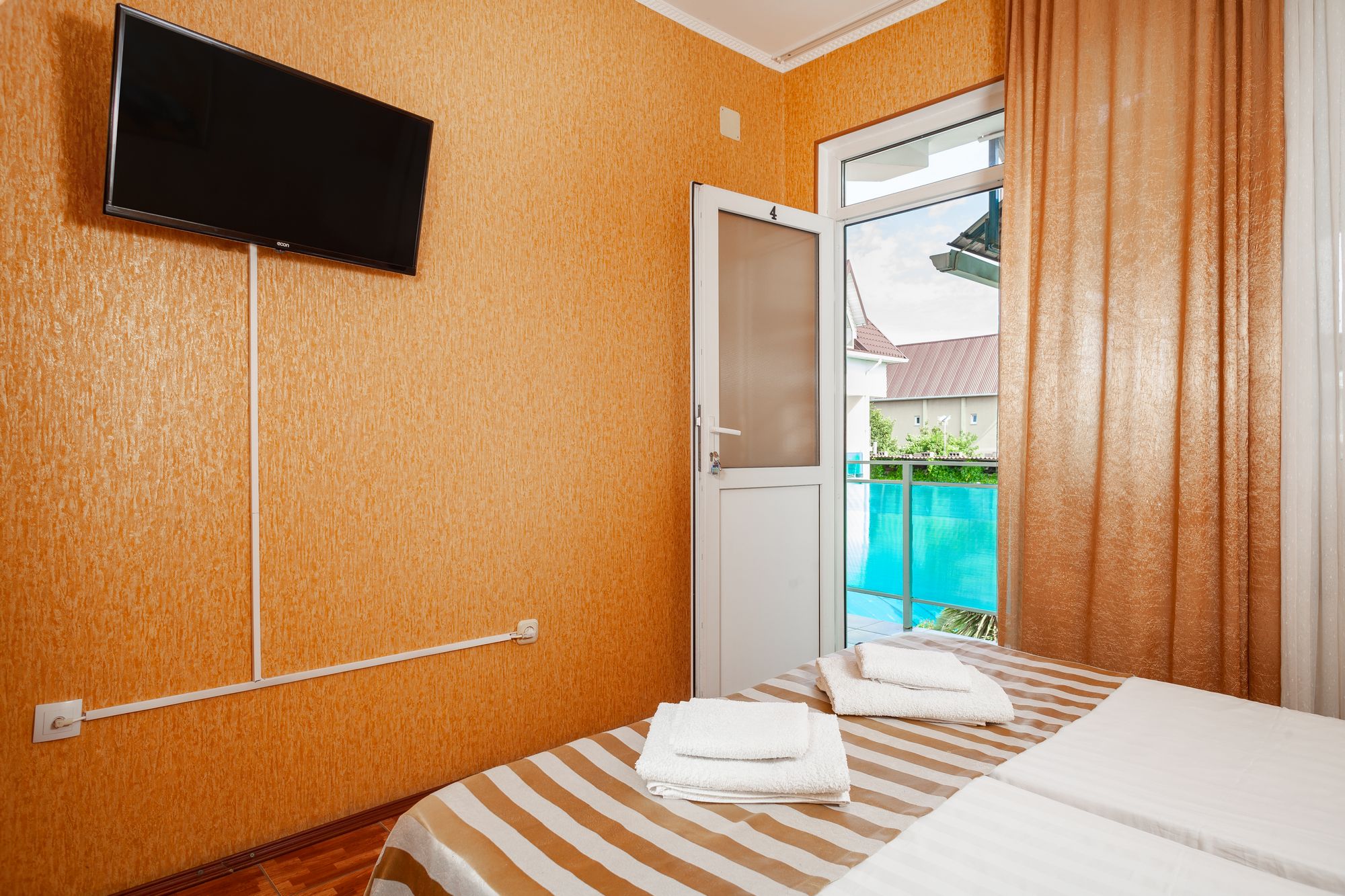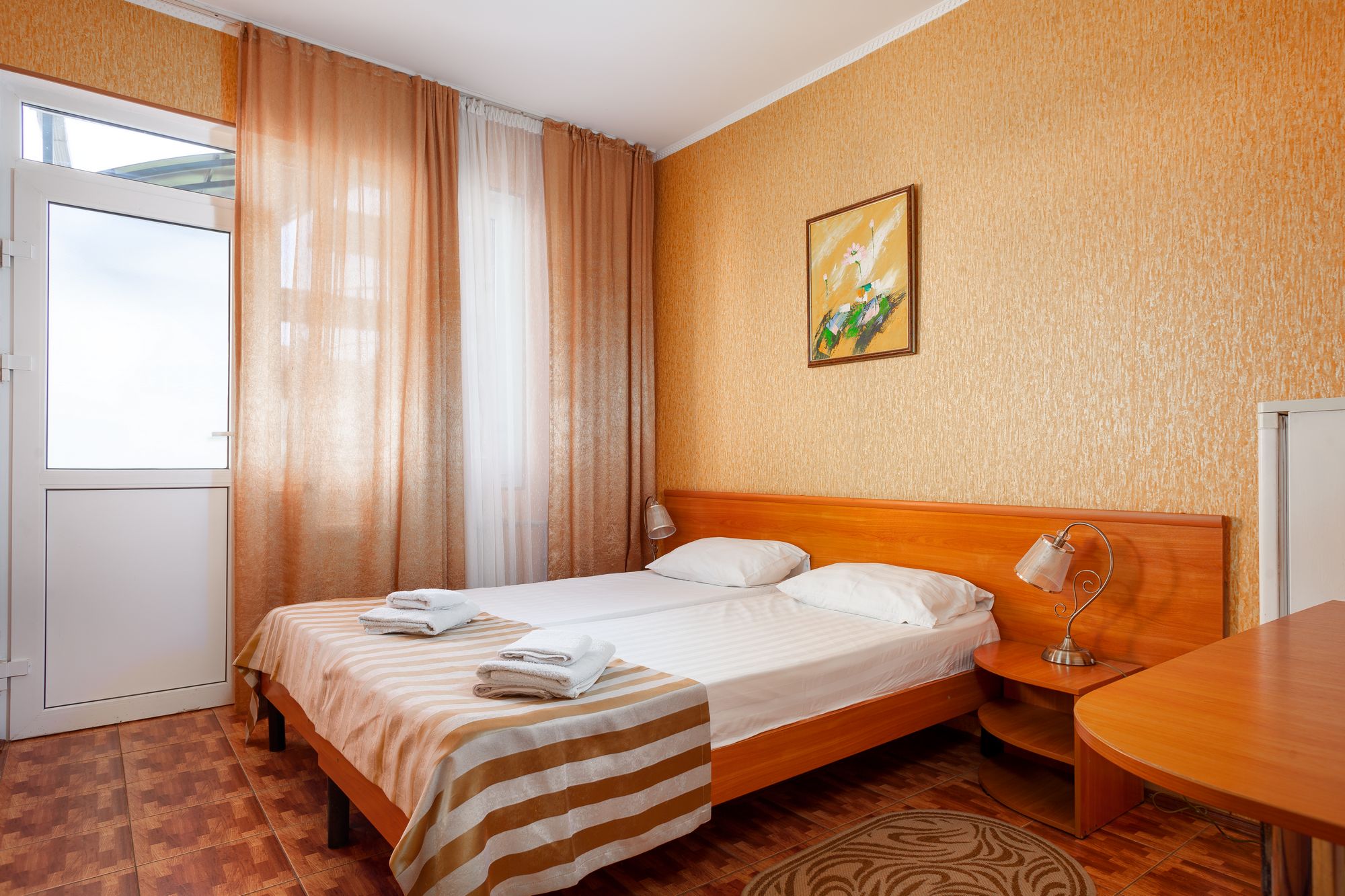 В номере: зеркало, кровати односпальные, прикроватные тумбочки, столик туалетный, шкаф, набор посуды, телевизор, холодильник